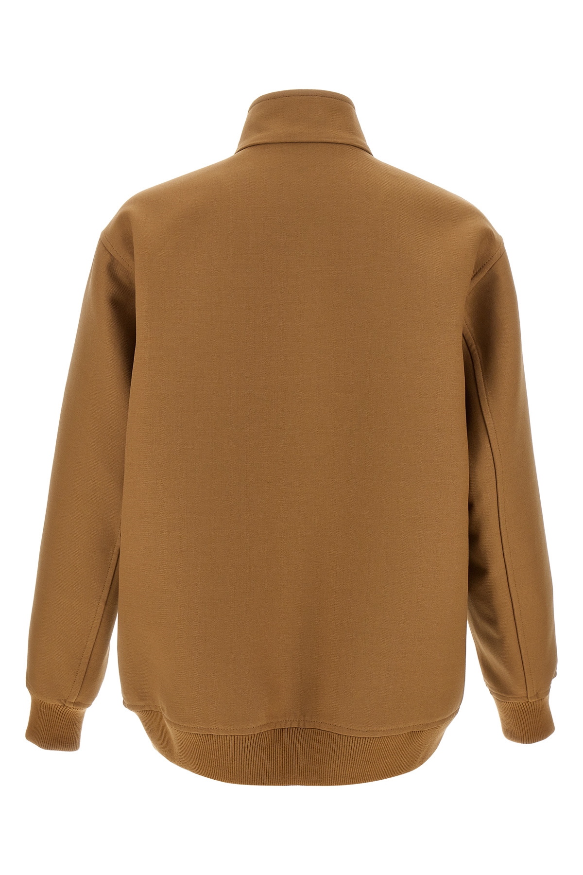 Wool jacket with stretch ribbed knit details, GG monogram lining, high neck with button closure, front zip closure, pockets, long cuffed sleeves.