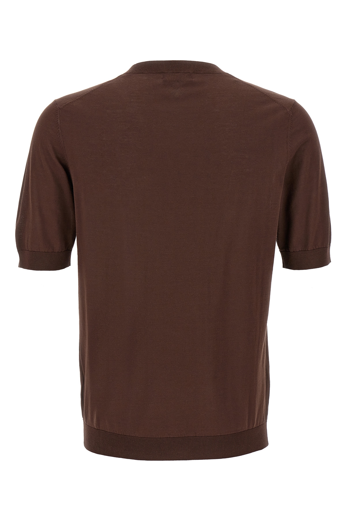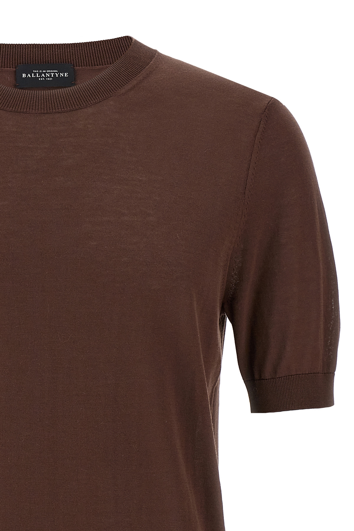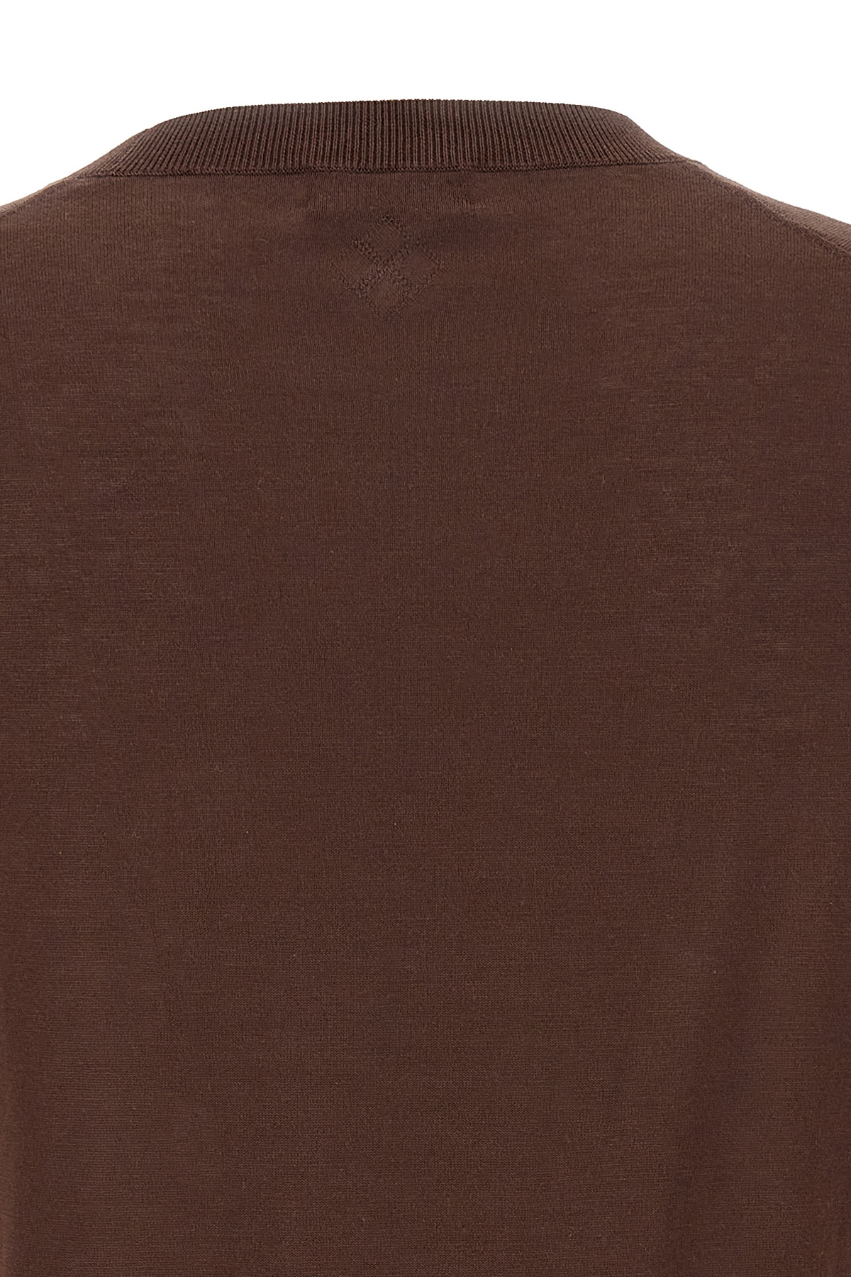 'R Neck' lightweight cotton sweater with crew neck and short cuffed sleeves.