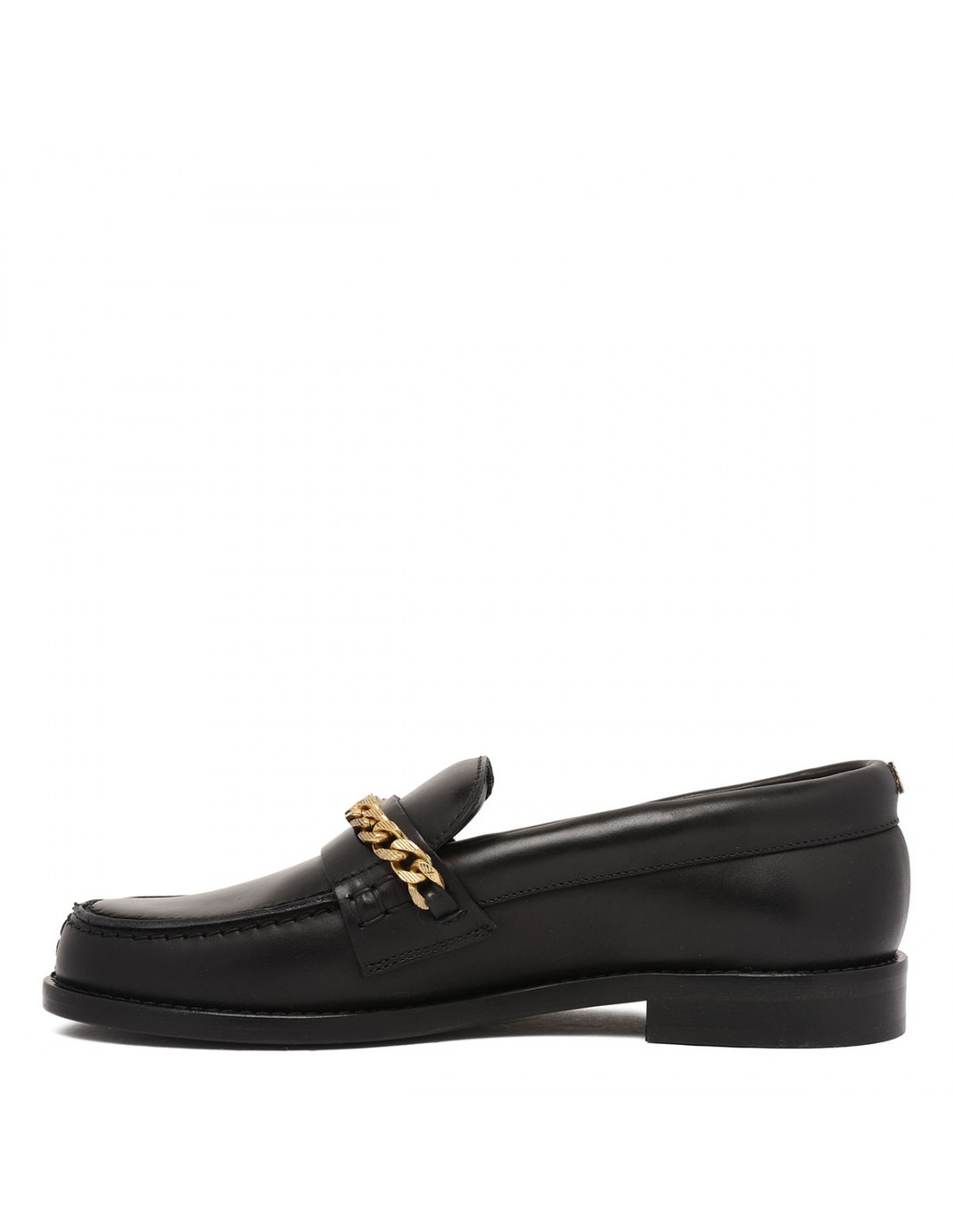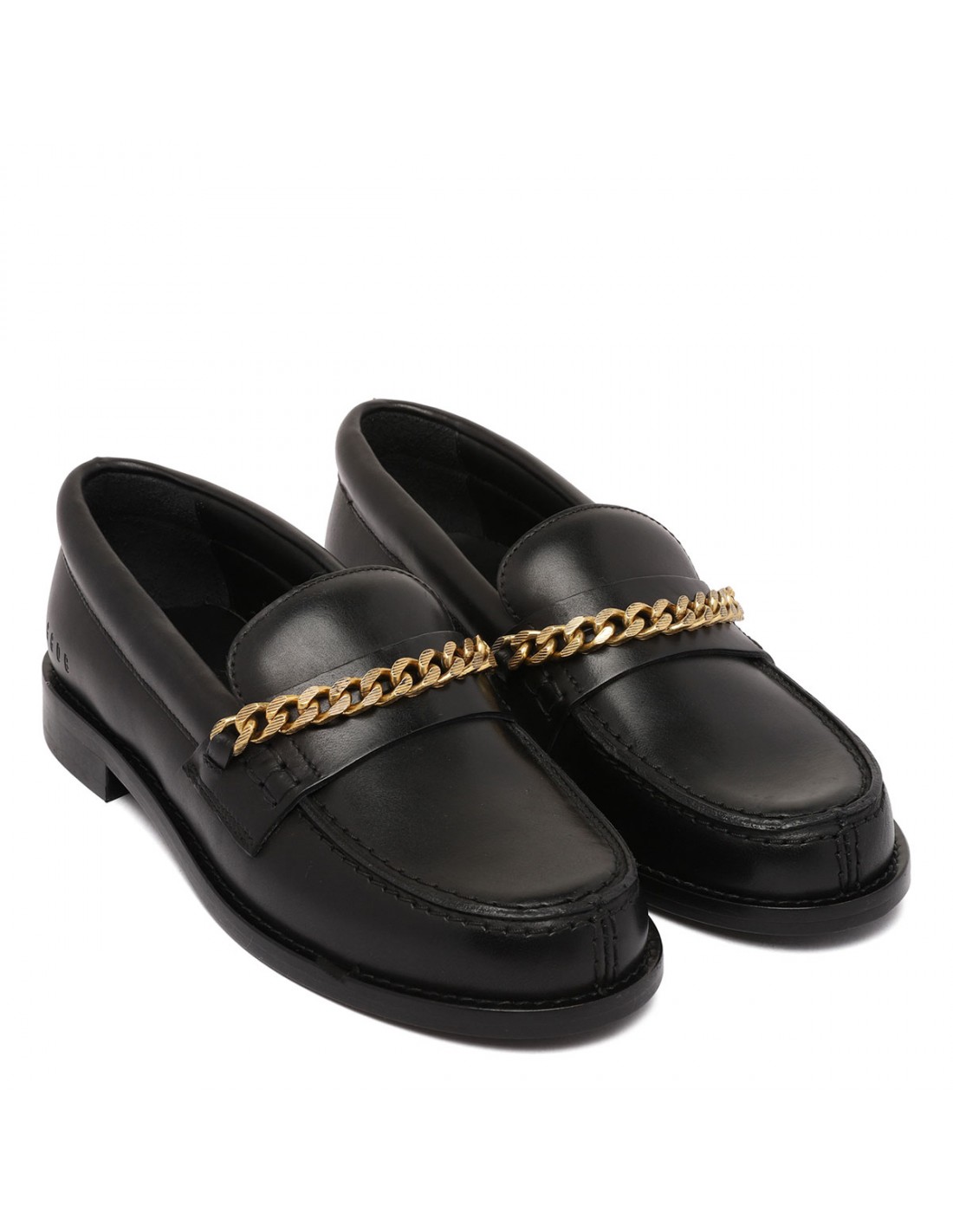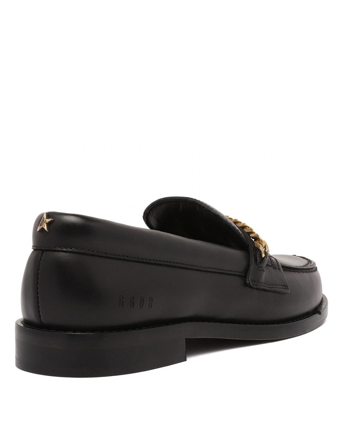 Black leather loafers from Golden Goose featuring gold-tone metal chain detail, galvanic antique gold metal star, GGDB lettering embossed on side, vintage finish, leather lining and sole.