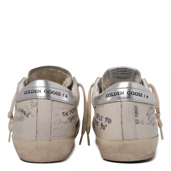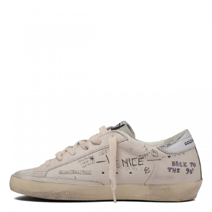 White leather SuperStar sneakers from Golden Goose featuring ice gray suede star on side, all-over contrasting black writing, metallic silver heel tab with logo, lace-up closure, logo tag on tongue, round toe, logo print on side, vintage finishing, rubber sole.