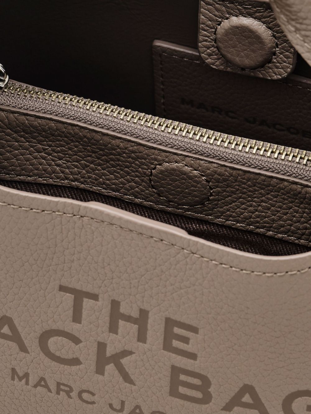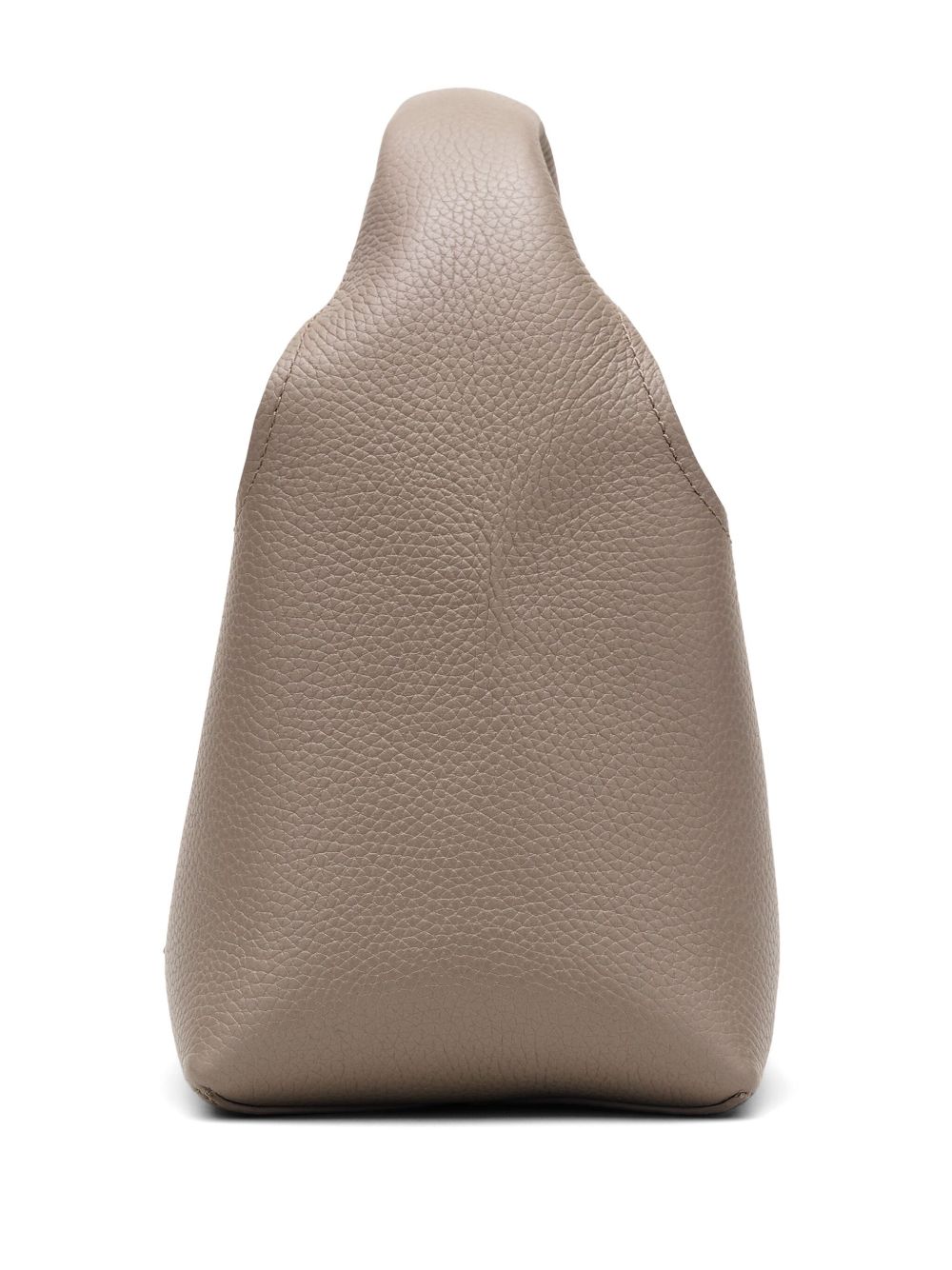 taupe grey leather grained texture debossed logo to the front applique logo single top handle concealed magnetic fastening main compartment removable pouch internal logo patch silver-tone hardware