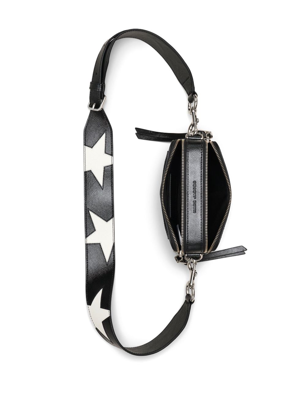 black/white leather patchwork design top zip fastening adjustable detachable shoulder strap silver-tone hardware star motif branded zip puller applique logo partitioned compartment internal logo tag