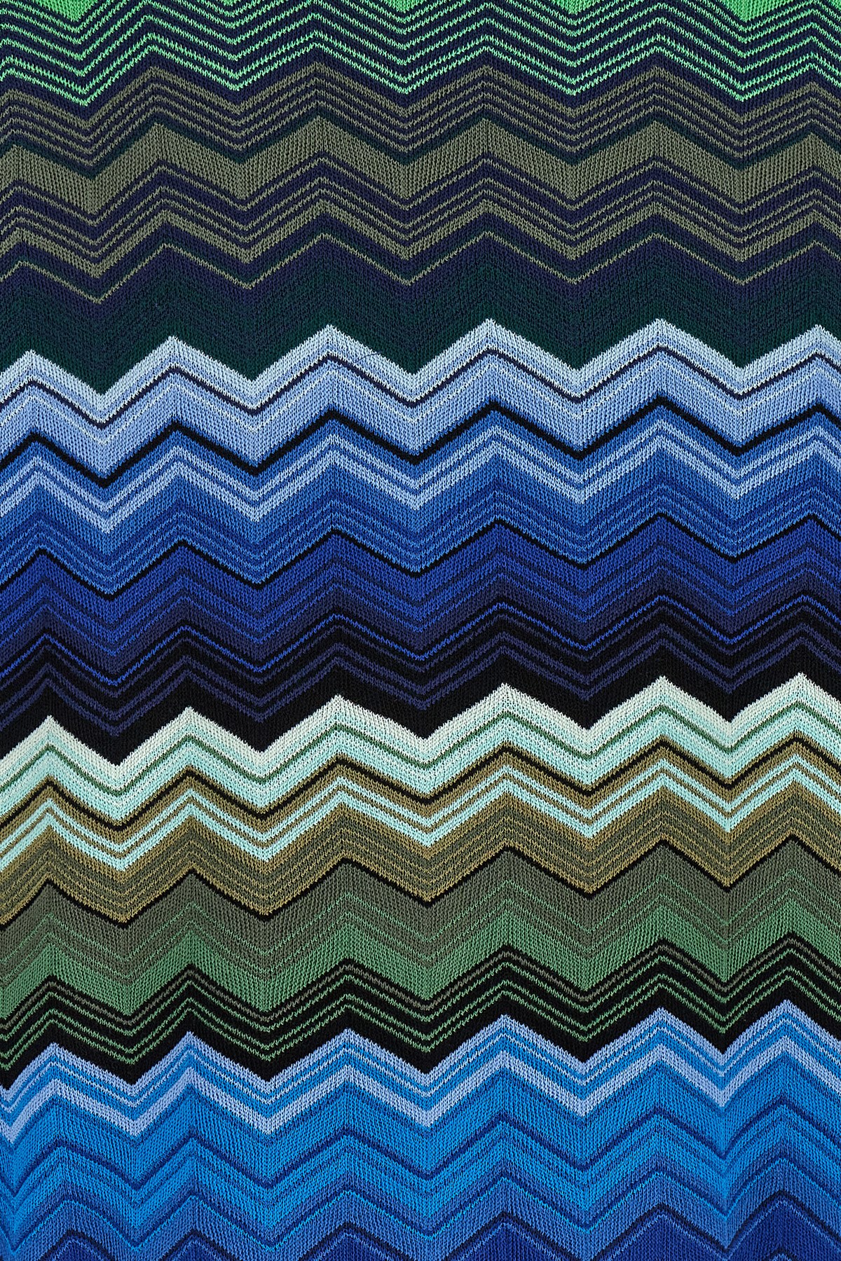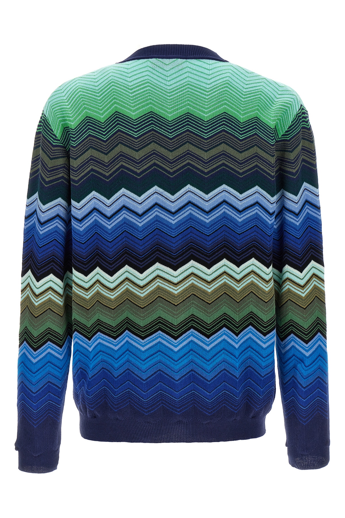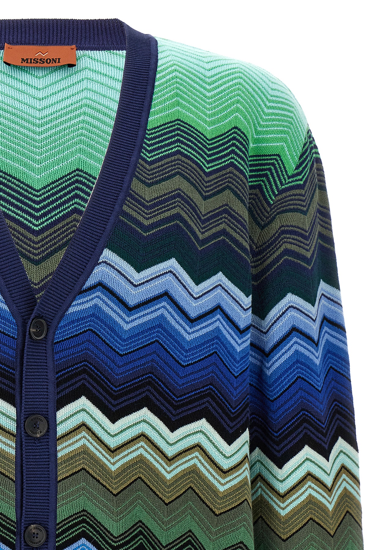 Knitted cotton cardigan with zigzag pattern, solid color piping, front button closure, V-neck, long cuffed sleeves.