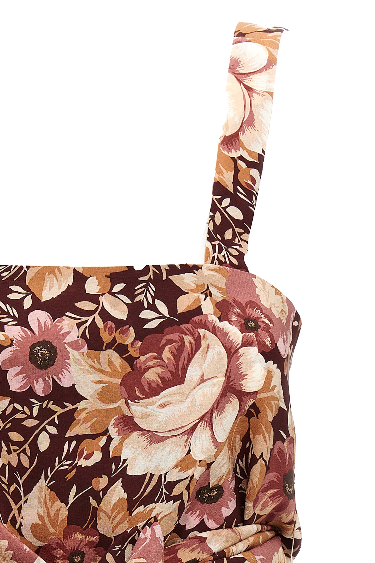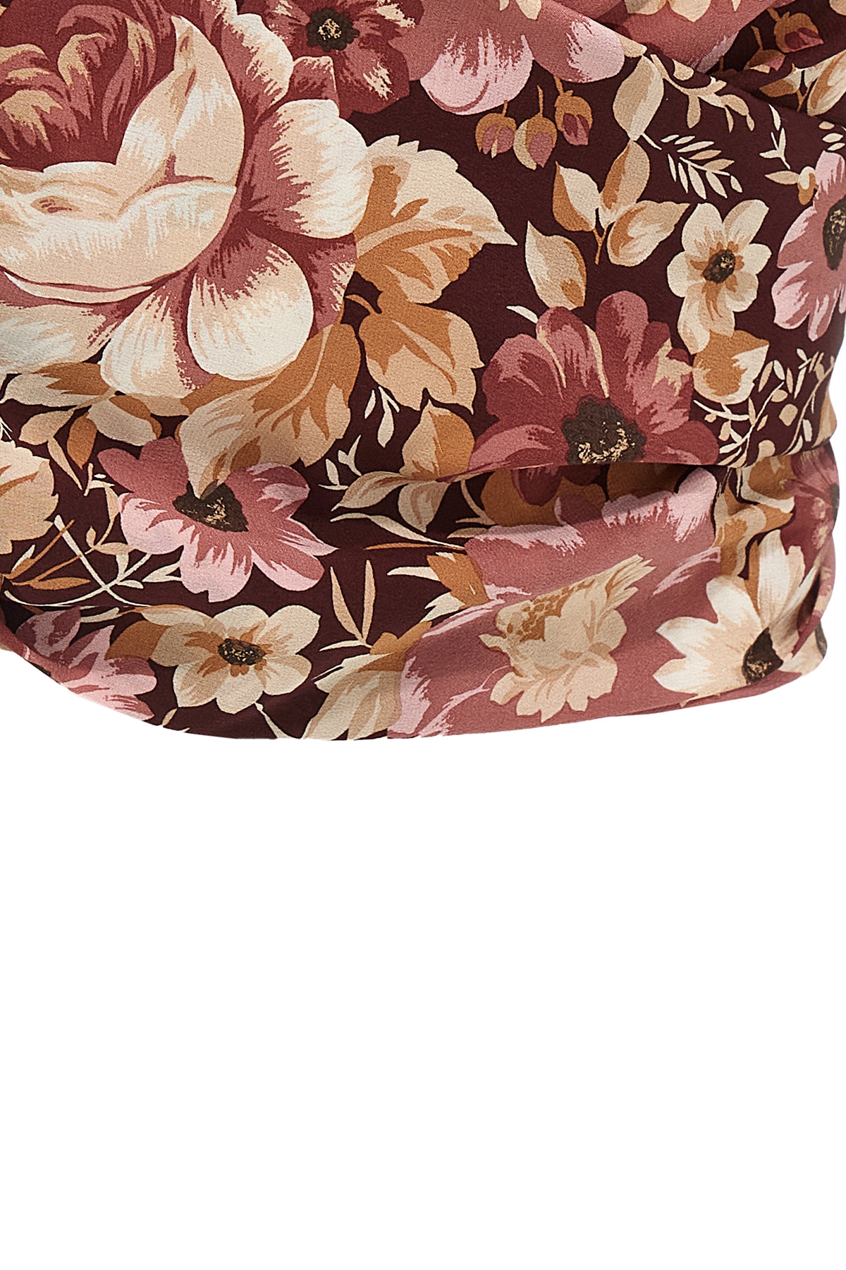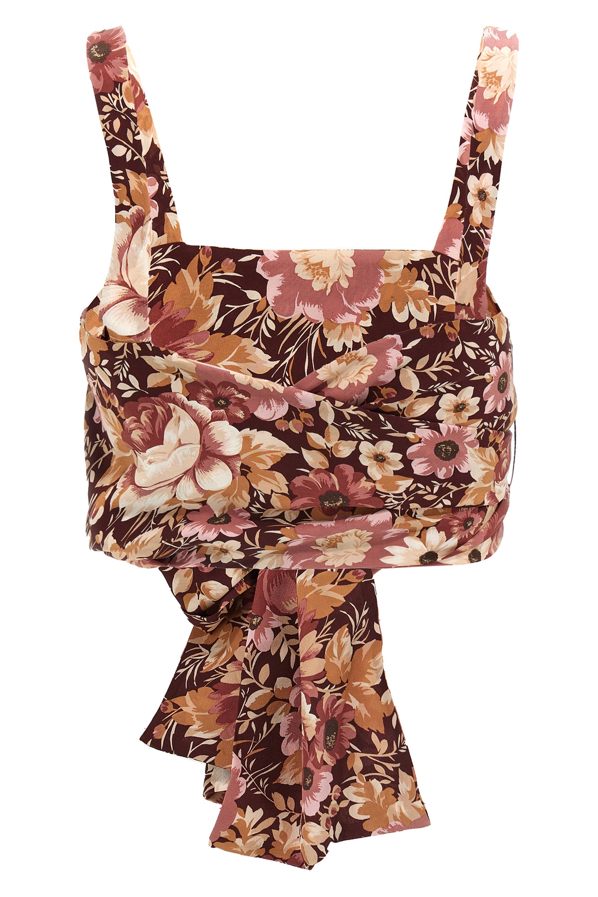 Floral print silk crepe de chine top, crop model with front ribbons to be tied as desired, square neckline.