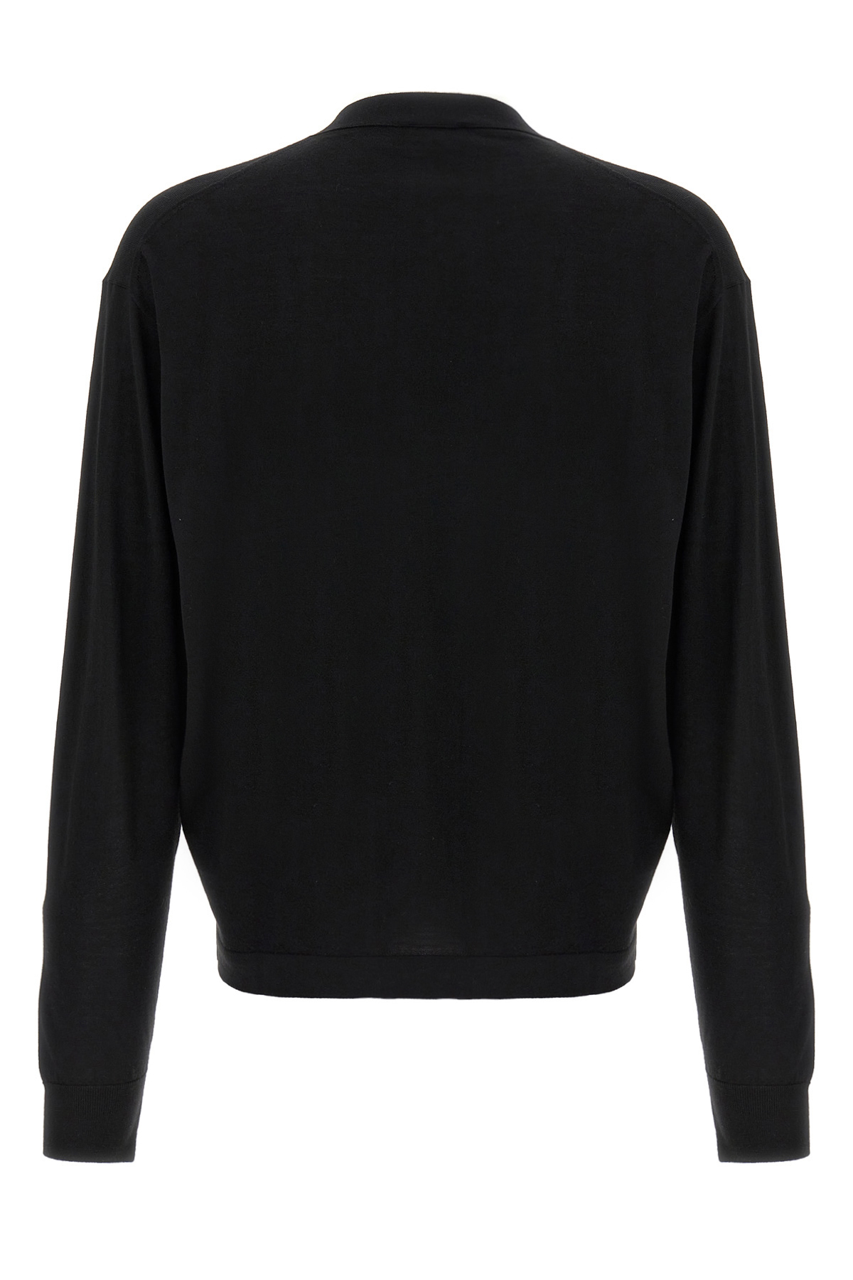 Fine wool cardigan, V-neck, front button closure, long cuffed sleeves.