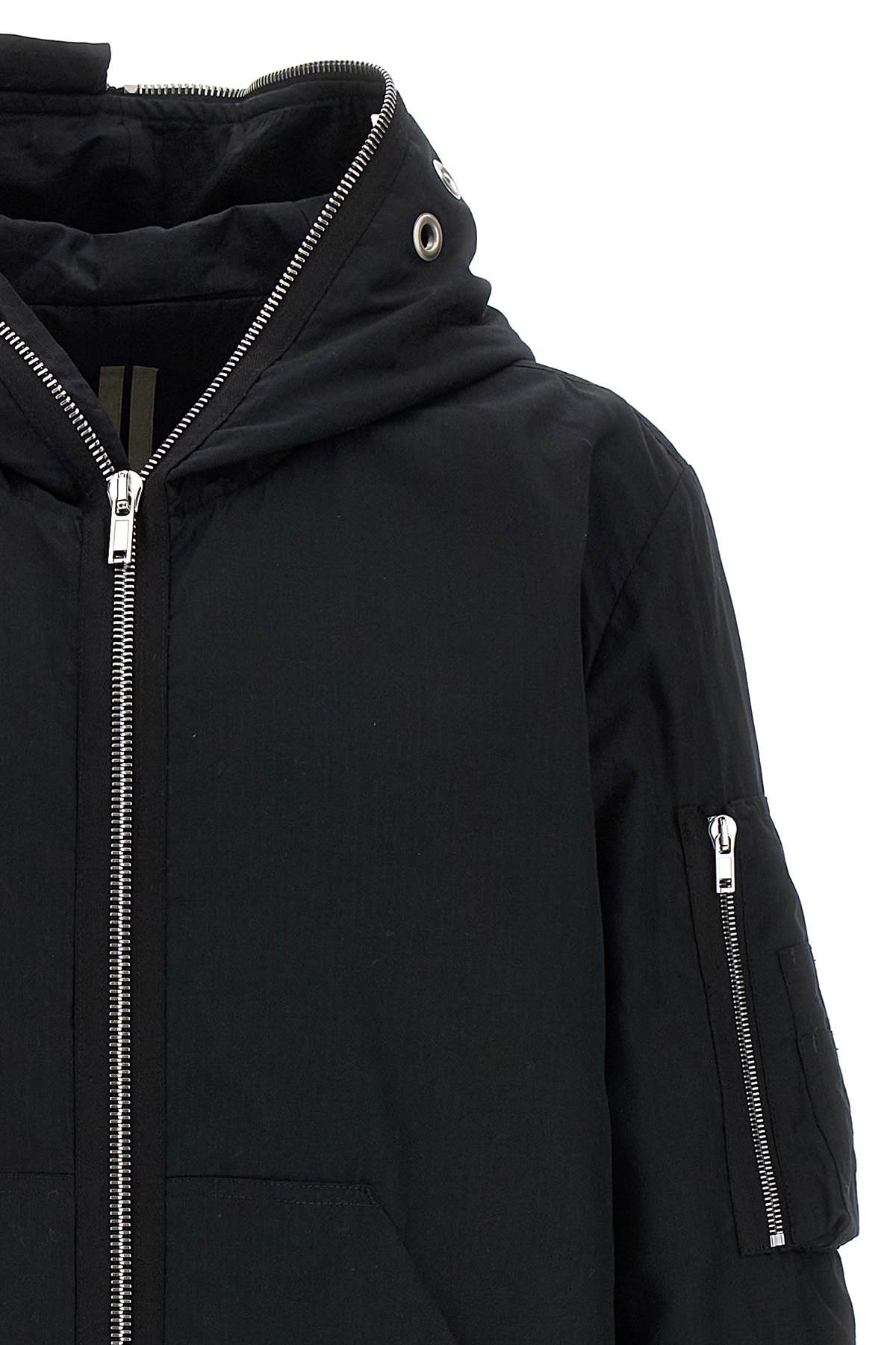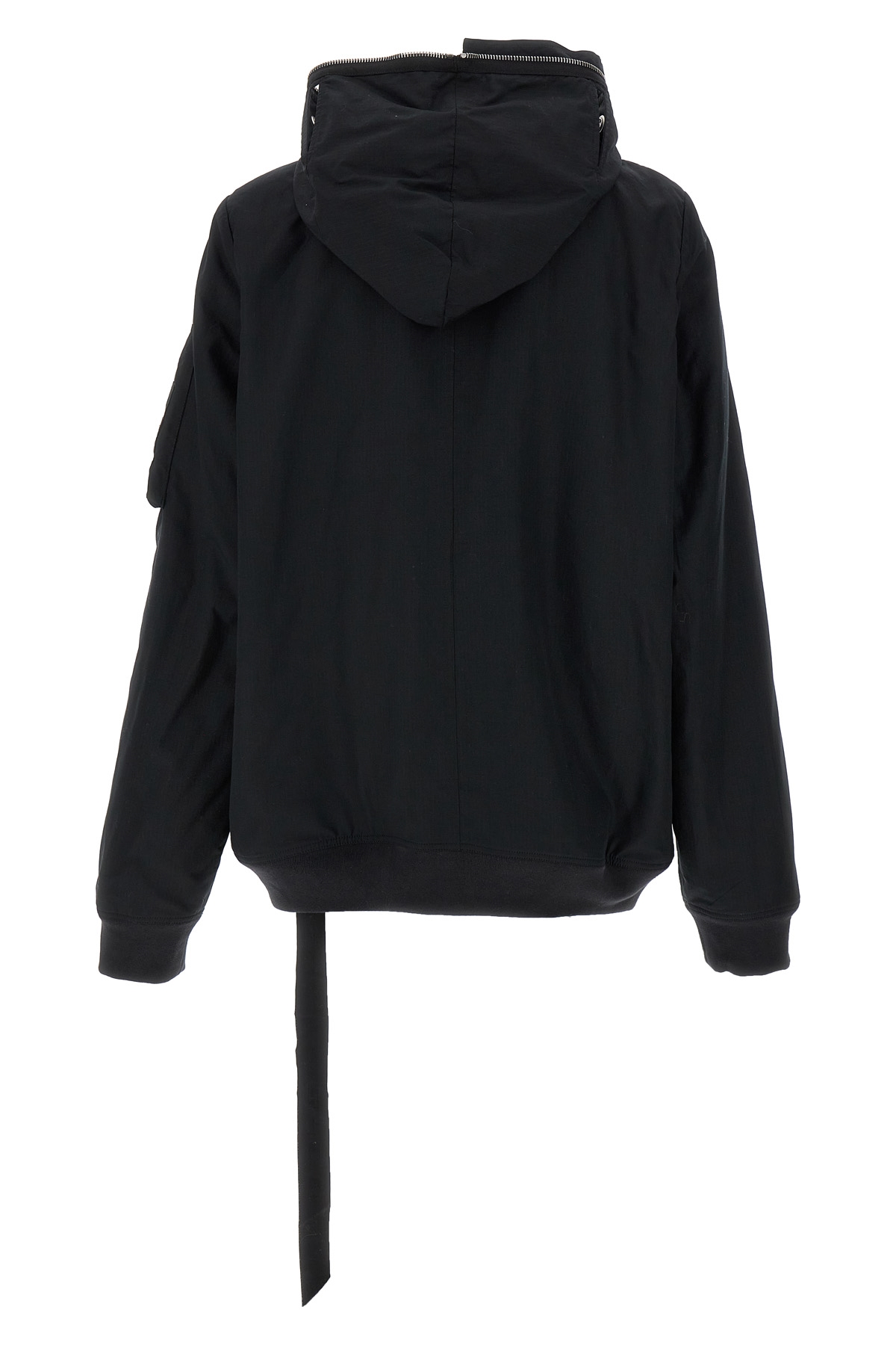 'Gimp Flight' water-repellent ripstop tencel bomber jacket with micro ribbed stretch knit details, front zip closure from the hem to the hood, hood with metal eyelets and eye slots, pockets, long cuffed sleeves.