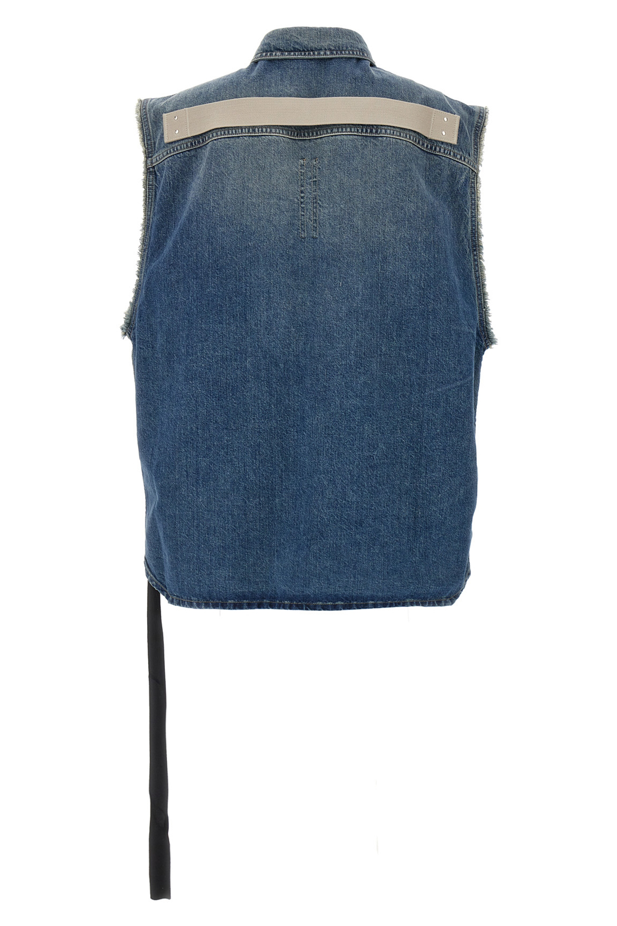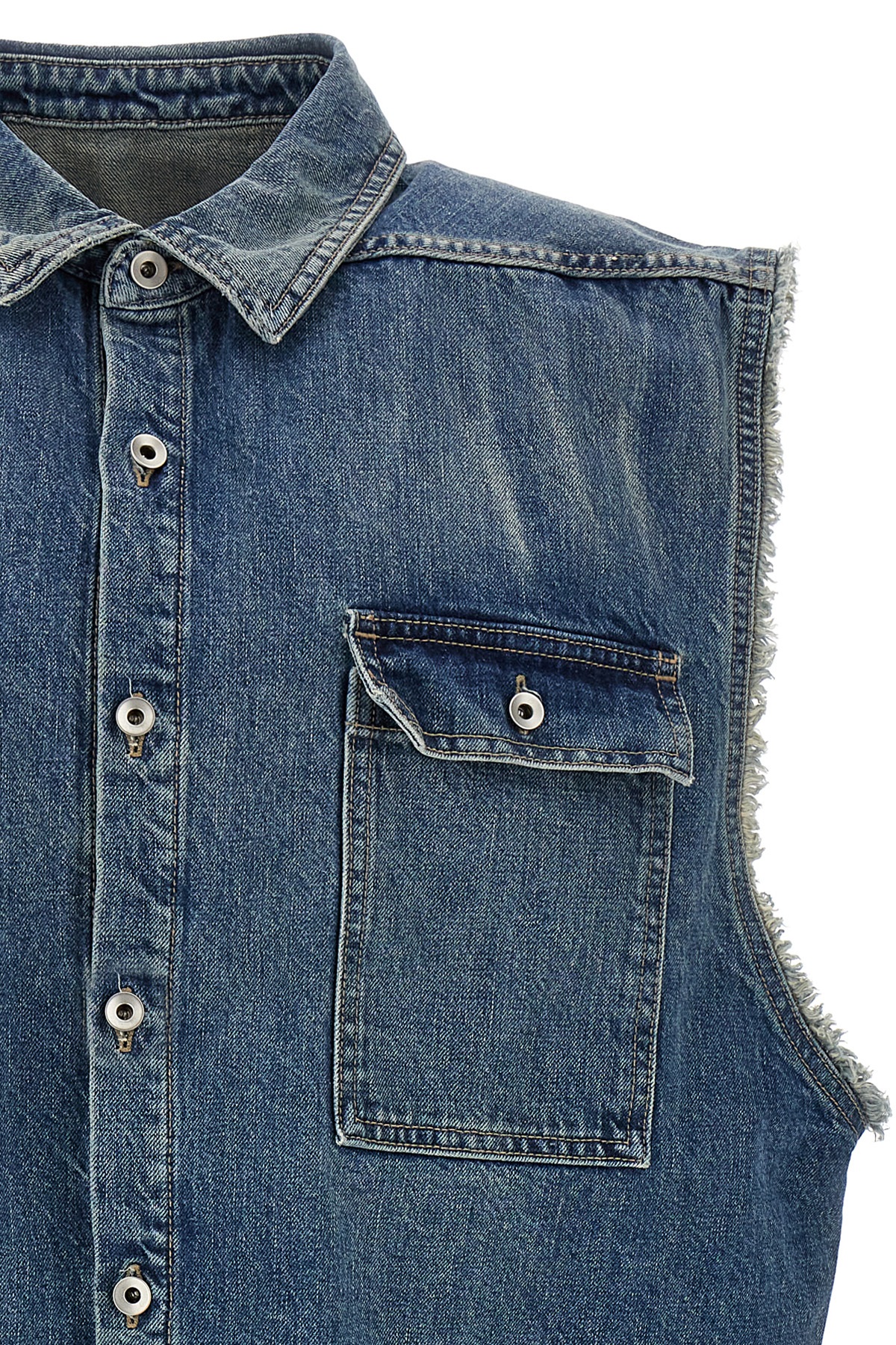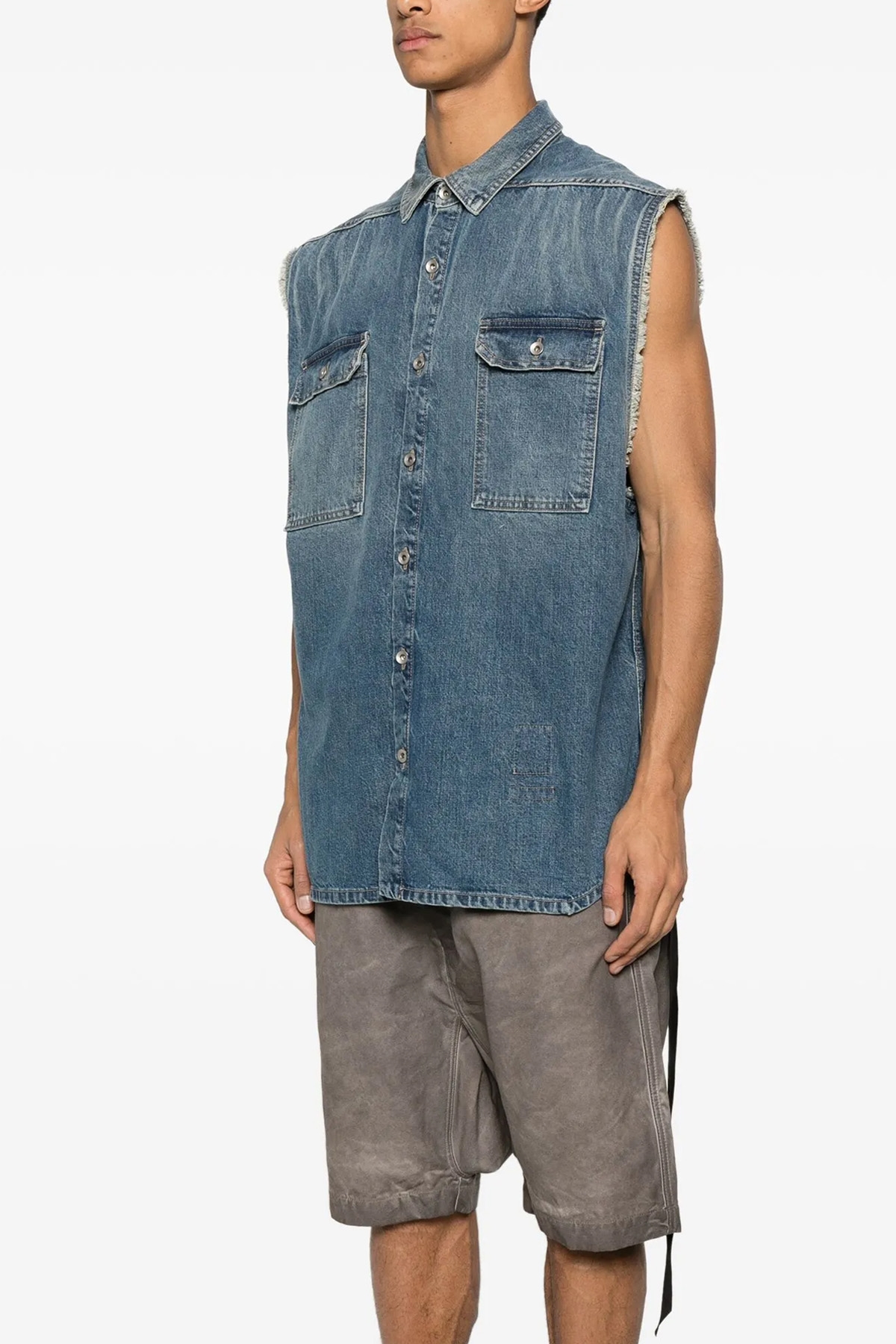 13-ounce Japanese indigo selvedge selvedge denim SL Tommy Jumbo shirt, front button closure, raw cut hem, pockets, contrast cotton tape with metal rivets at the back.
