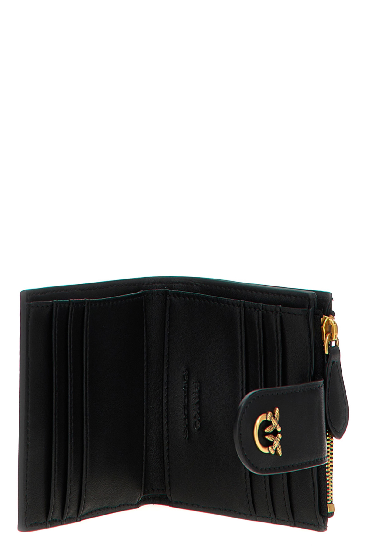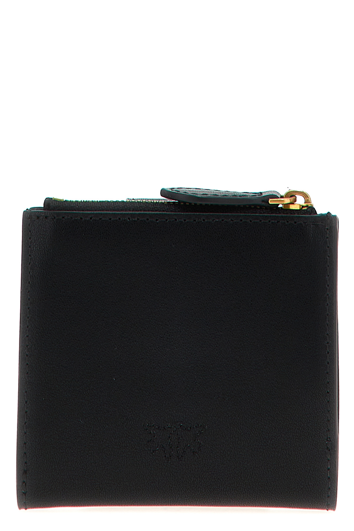 'Multi Purpose' leather wallet, button closure with metal logo applique, zip closure and card holder.