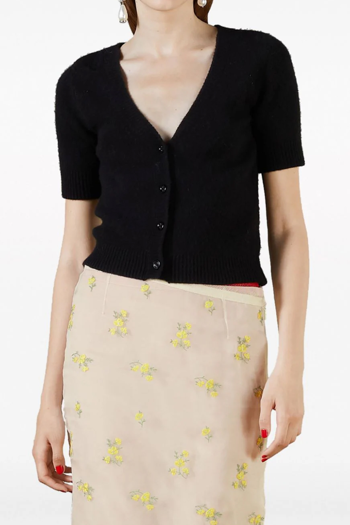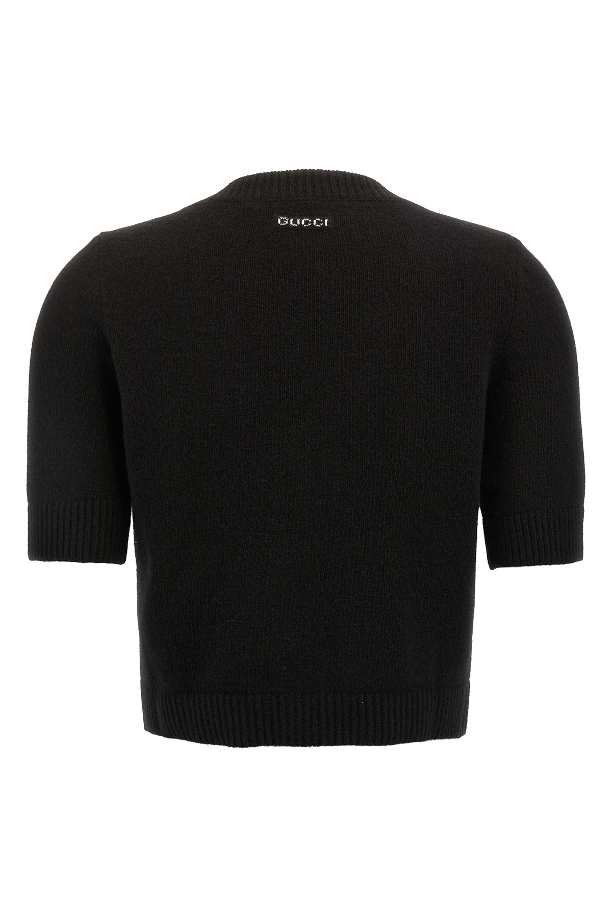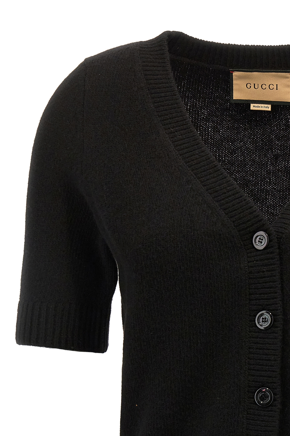 Cropped wool and cashmere cardigan with button closure, short sleeves.