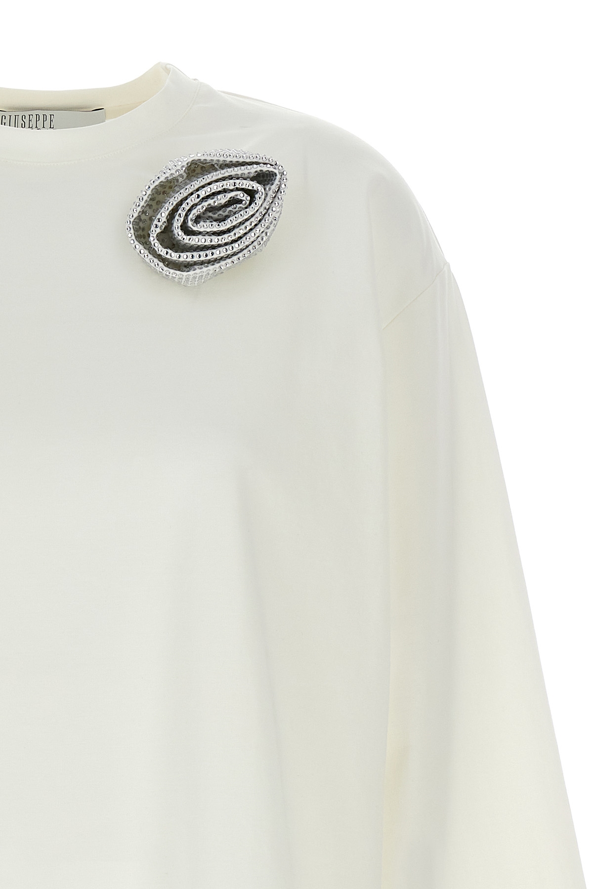 Cotton blend dress with floral brooch with rhinestones on the front, crew neck, long sleeves.