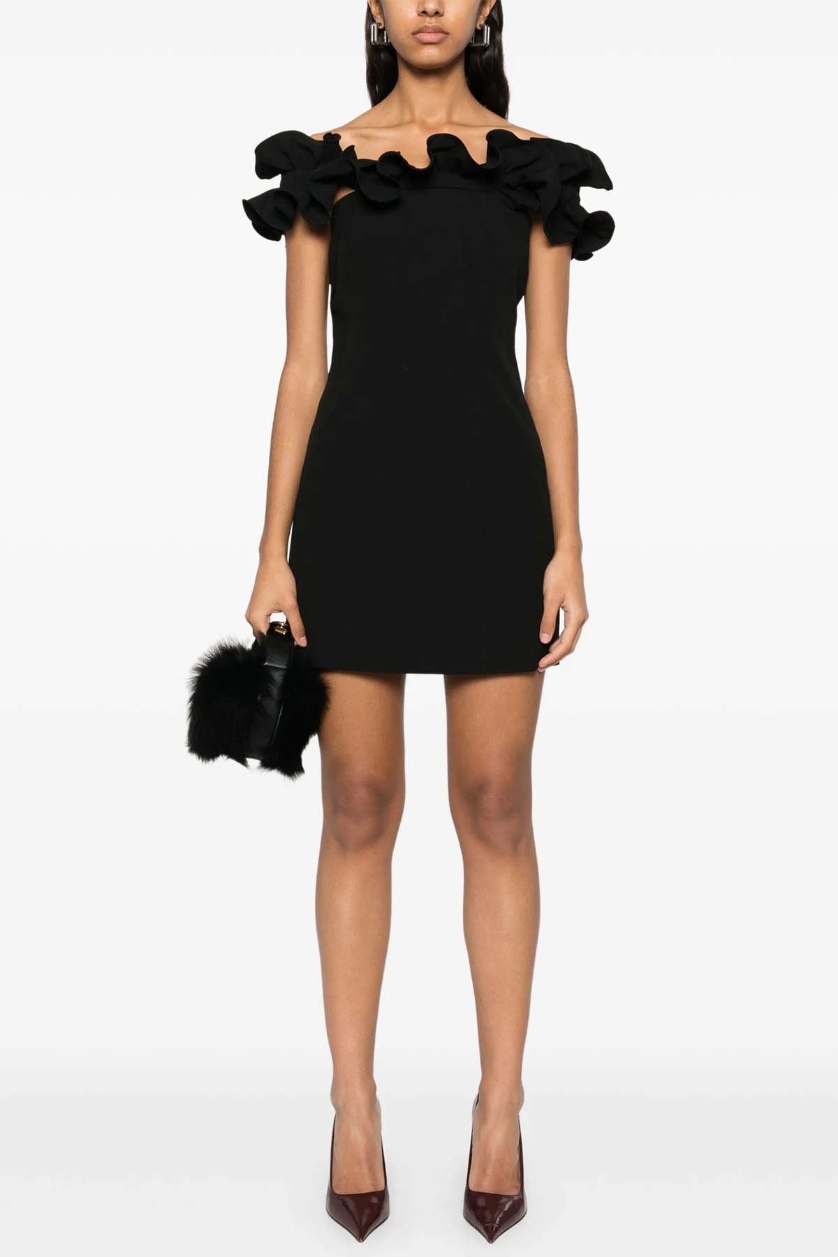 'Mini Ruffle' dress in viscose blend, off-the-shoulder style with ruffle decoration and back zip closure.