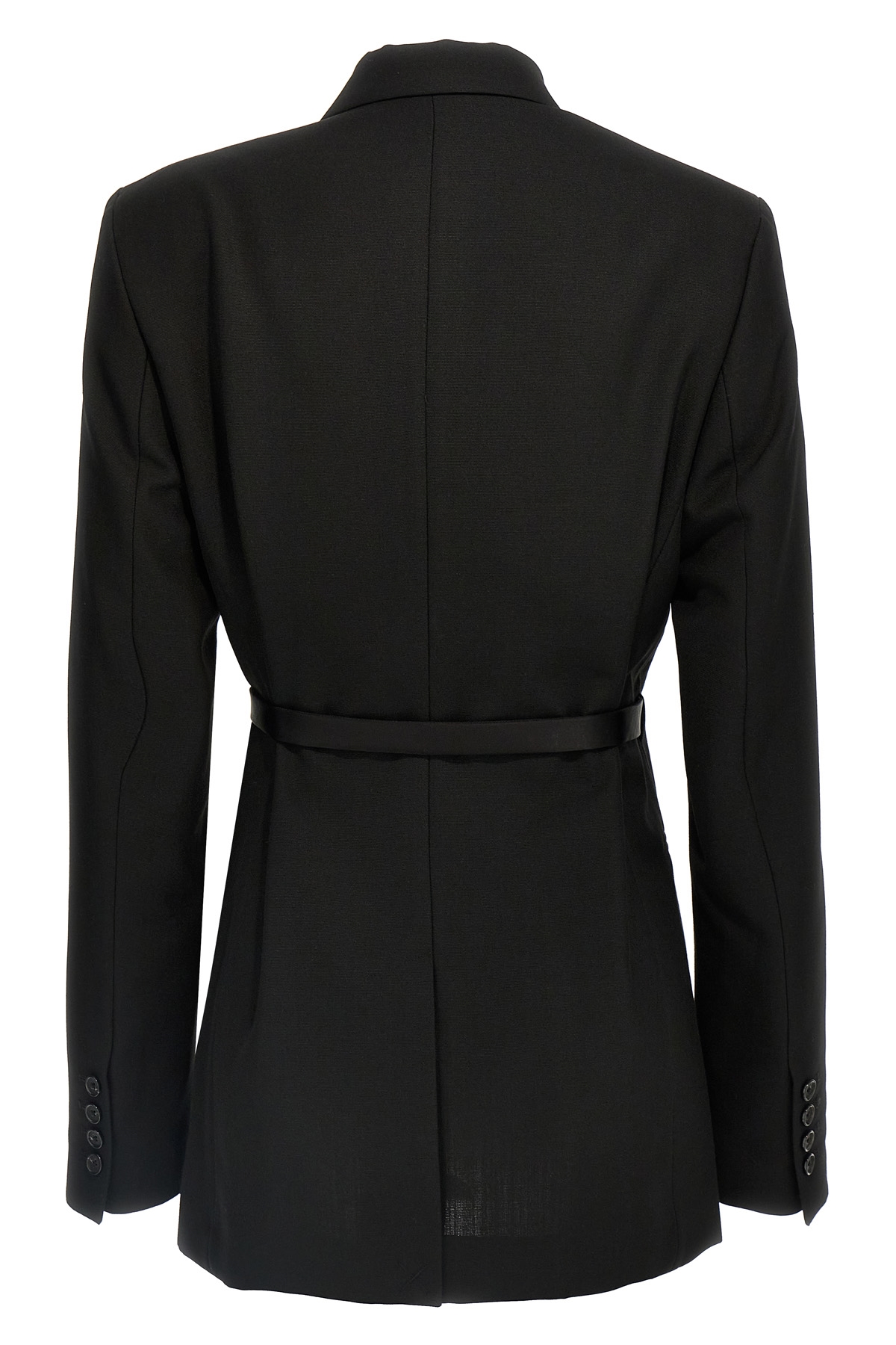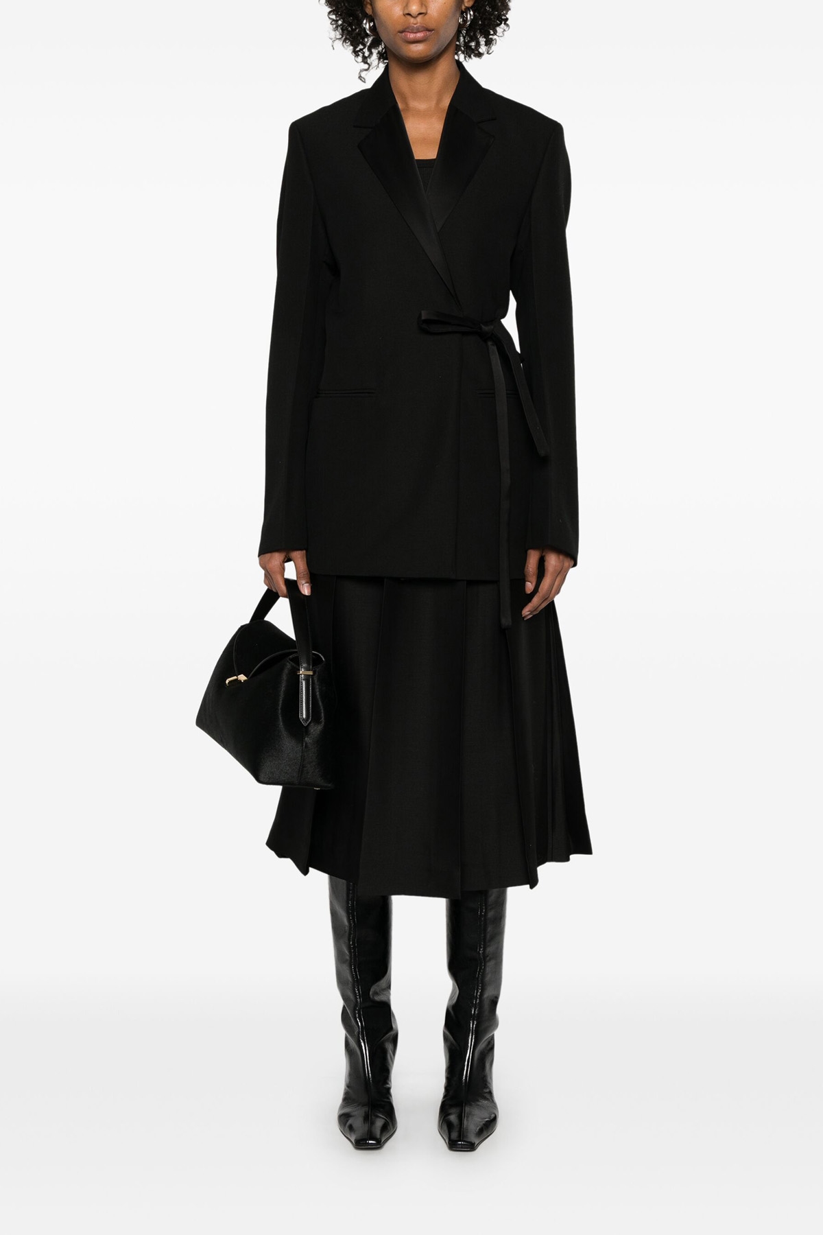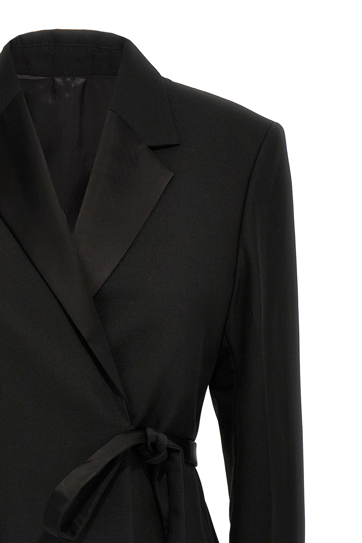 Viscose blend wallet blazer with glossy satin inserts, lace-up closure, mirror lapels, long sleeves, and back split.