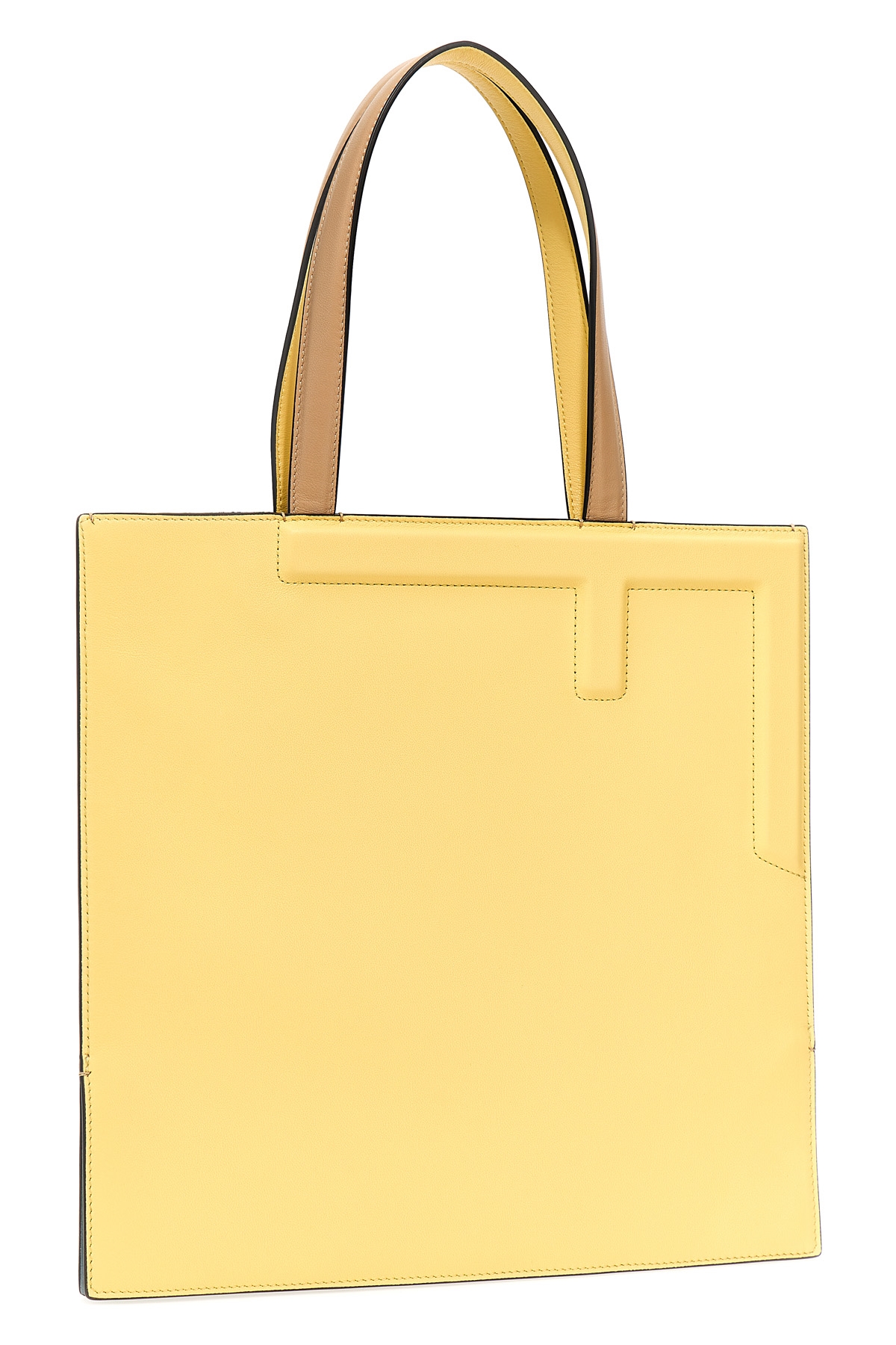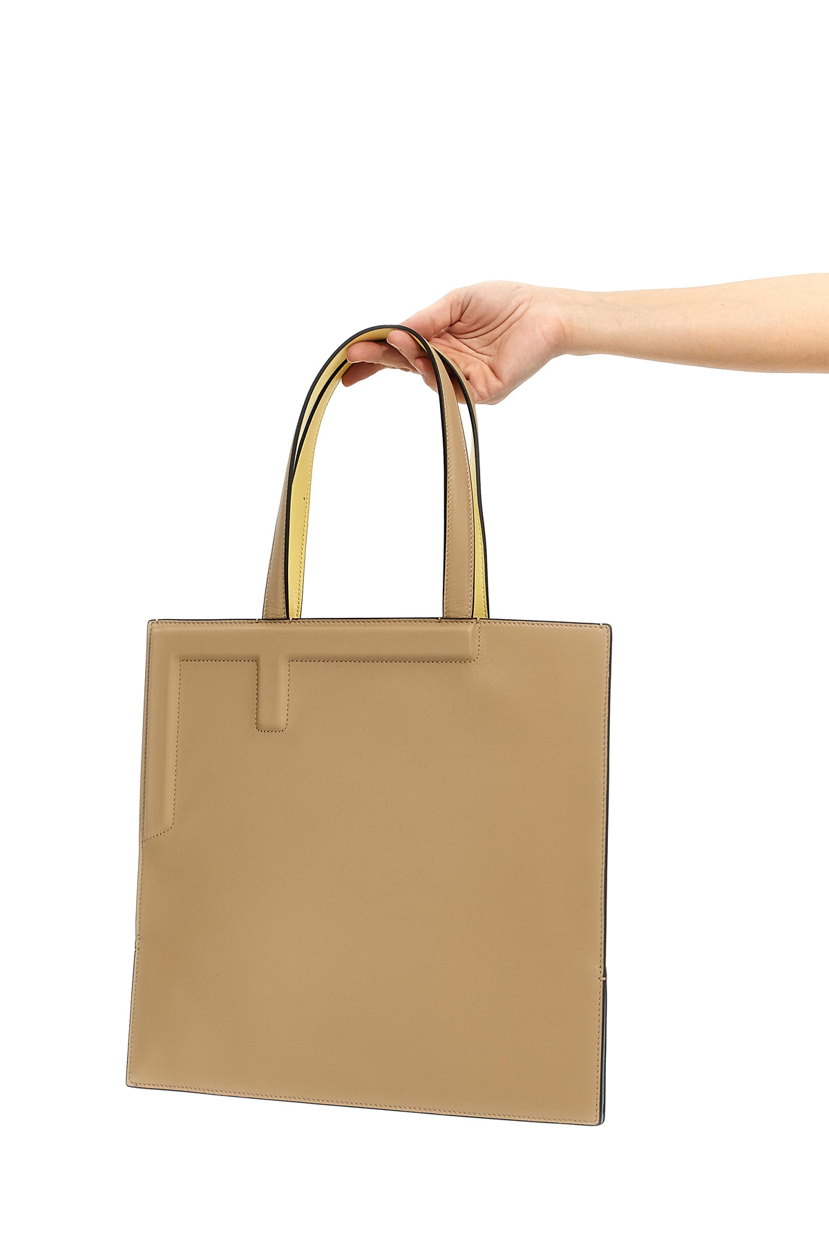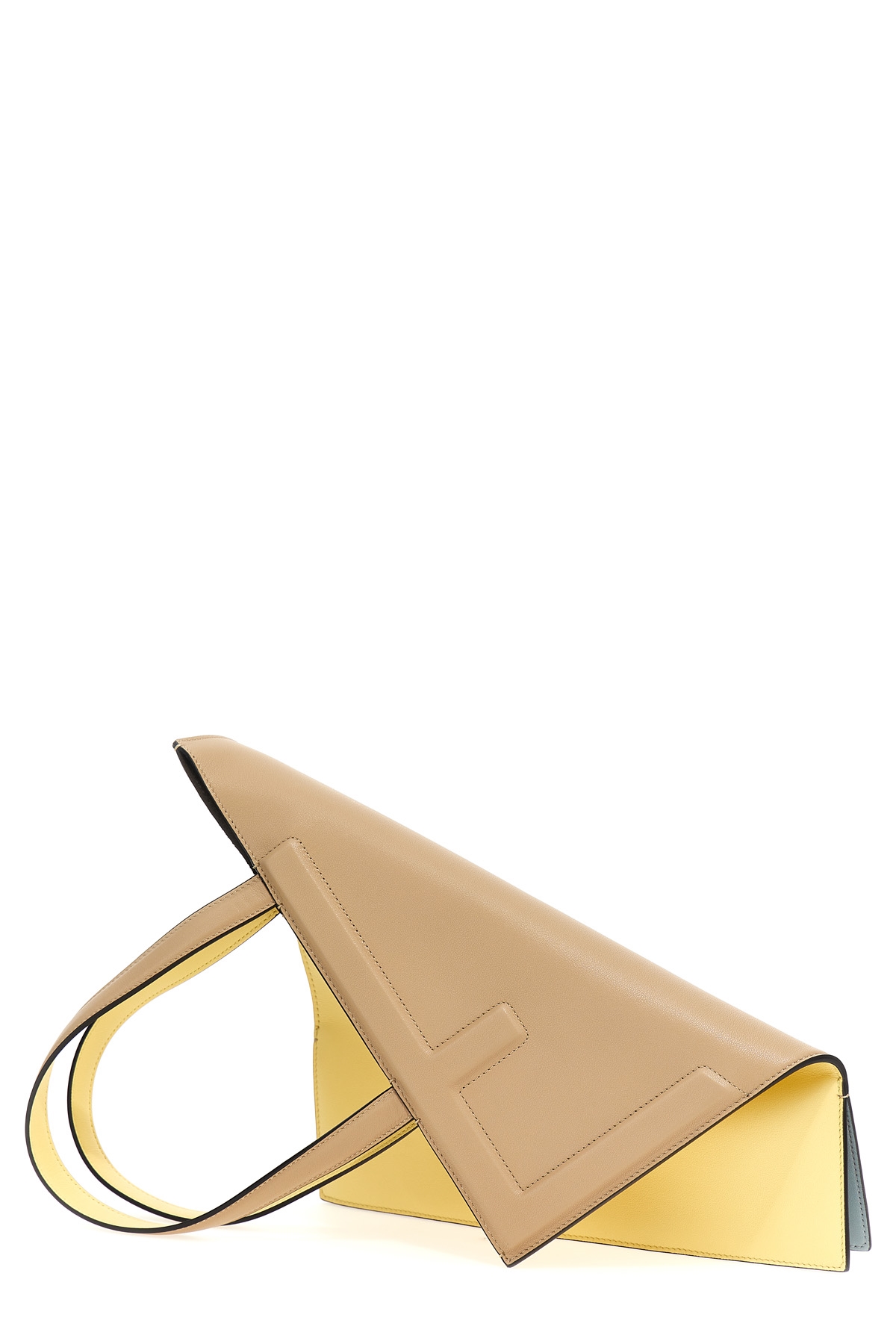 'Fendi Flip Medium' leather shopping bag with contrast colorblock panels, embossed F macro logo on the corner on both sides, double handle. This bag can be folded and carried as a clutch.