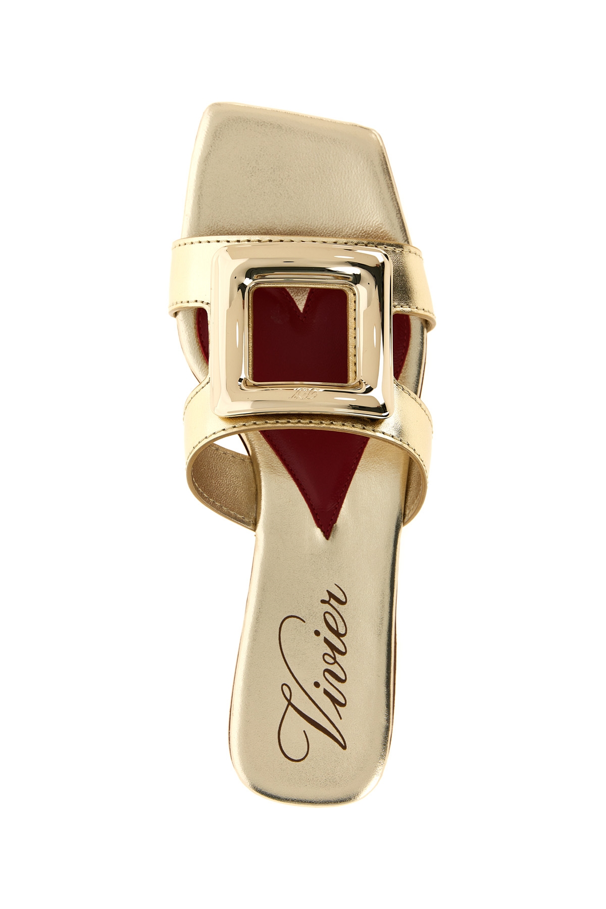 'New Metal Buckle' metallic leather mules, gold buckle with engraved logo and cut-out details, leather insole, leather sole.
