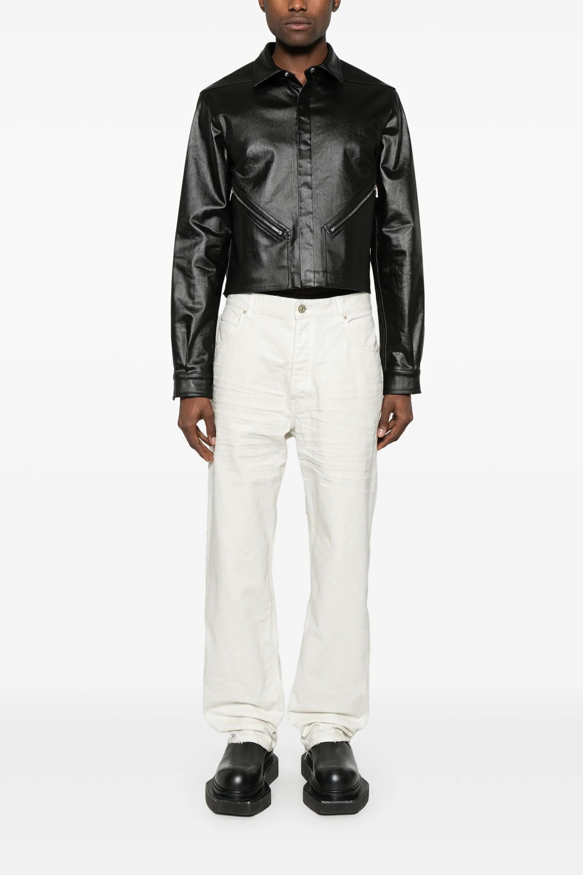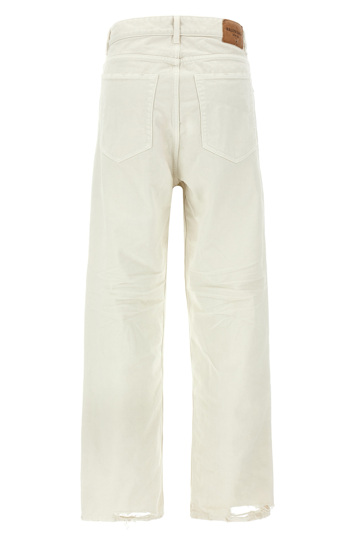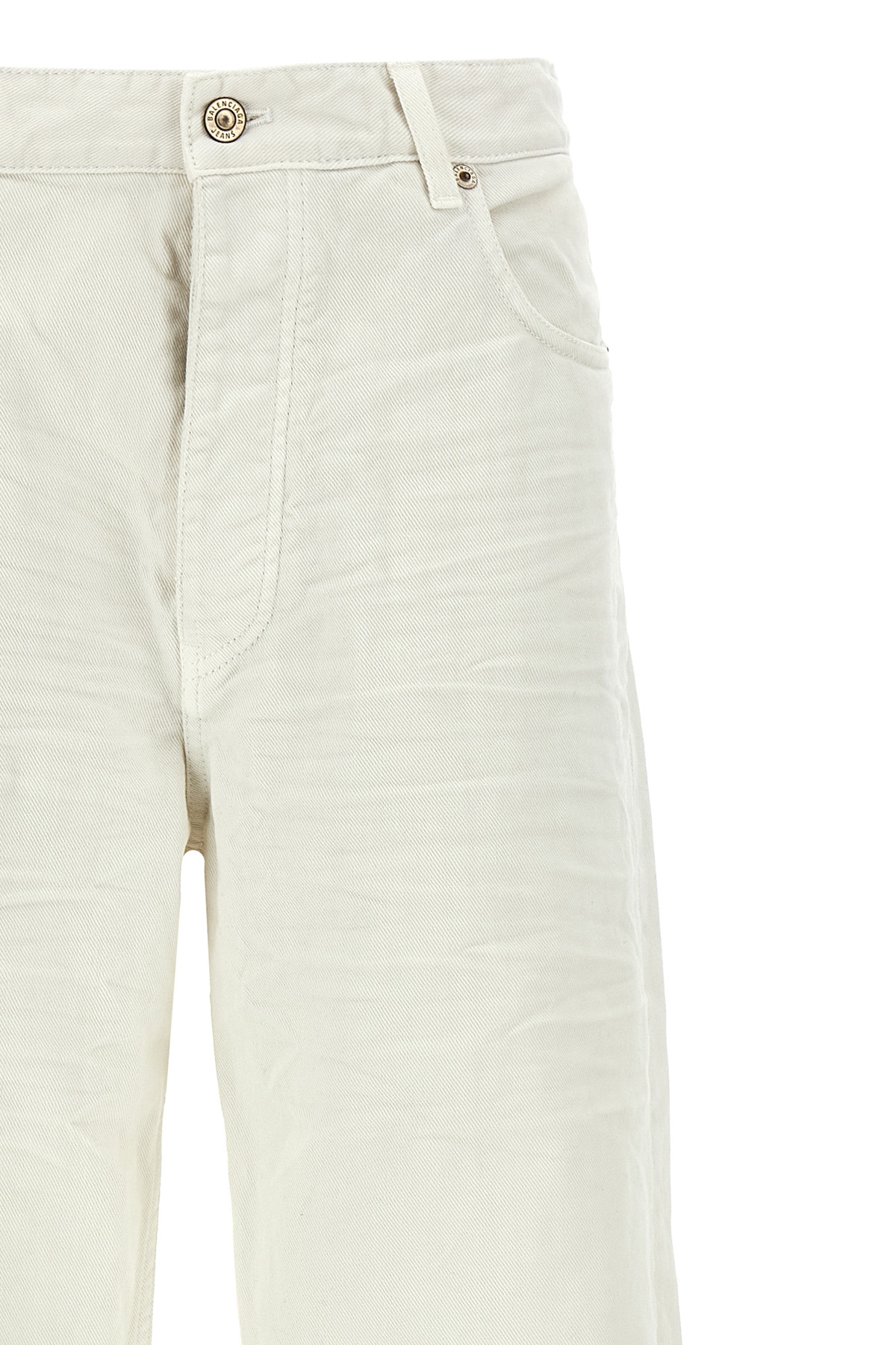 Vintage wrinkled cotton denim jeans with medium waist with wide leg, five pockets, front button closure, back logo tag.