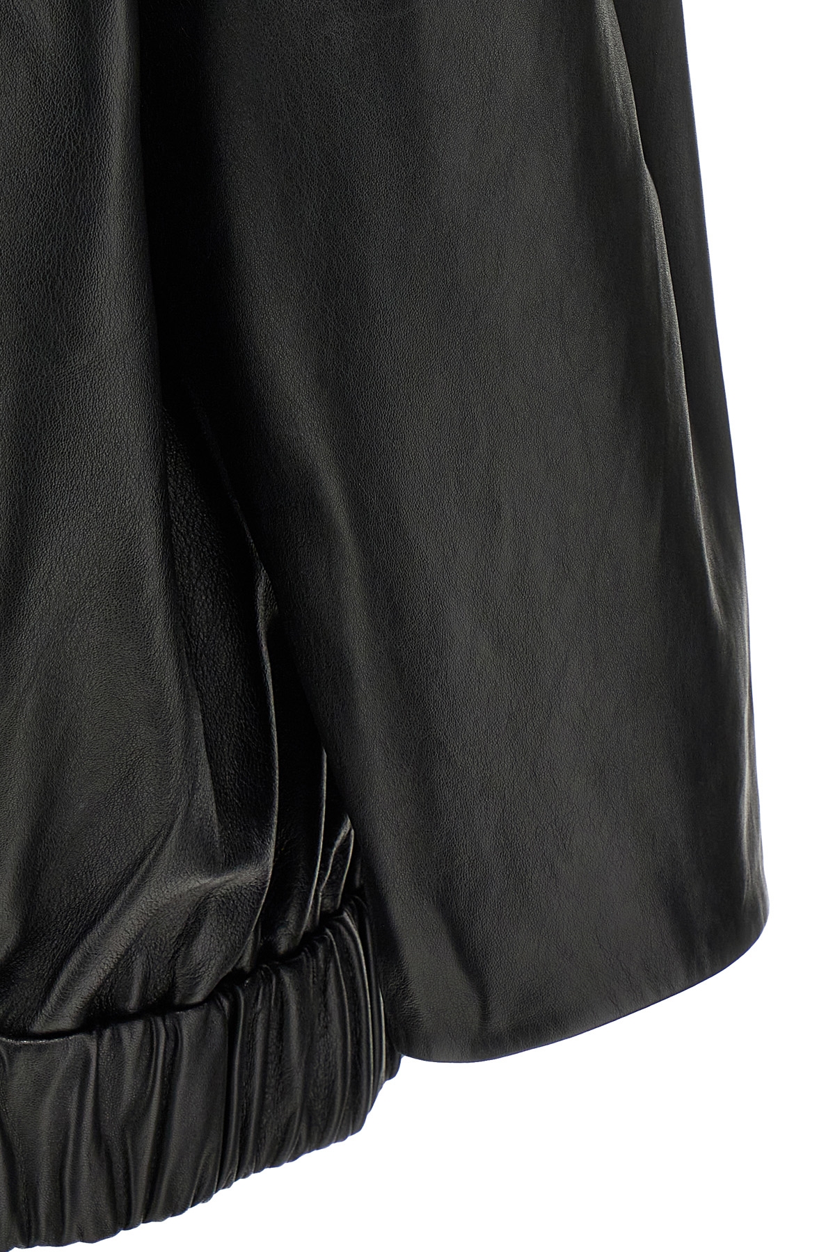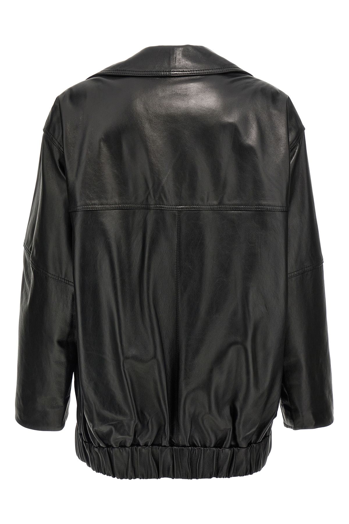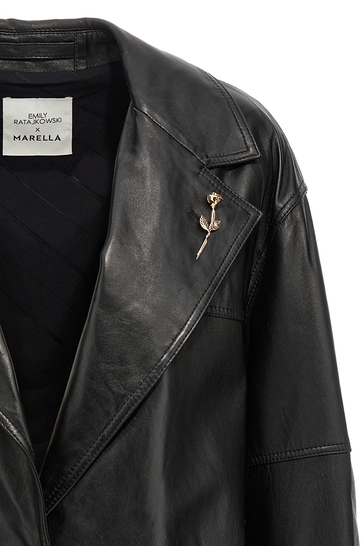 Emily Ratajkowski x Marella leather capsule bomber jacket with button closure, long sleeves with dropped shoulder, pockets, elastic hem, removable brooch.