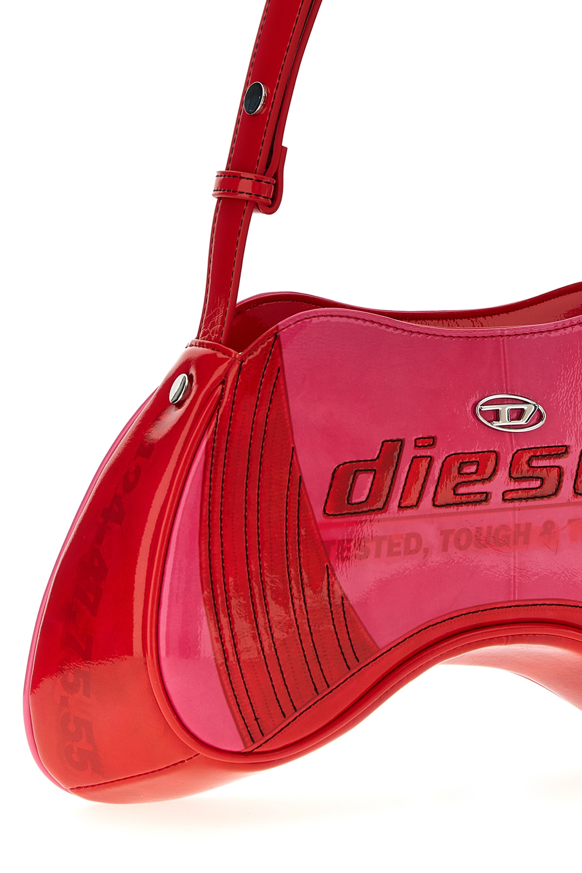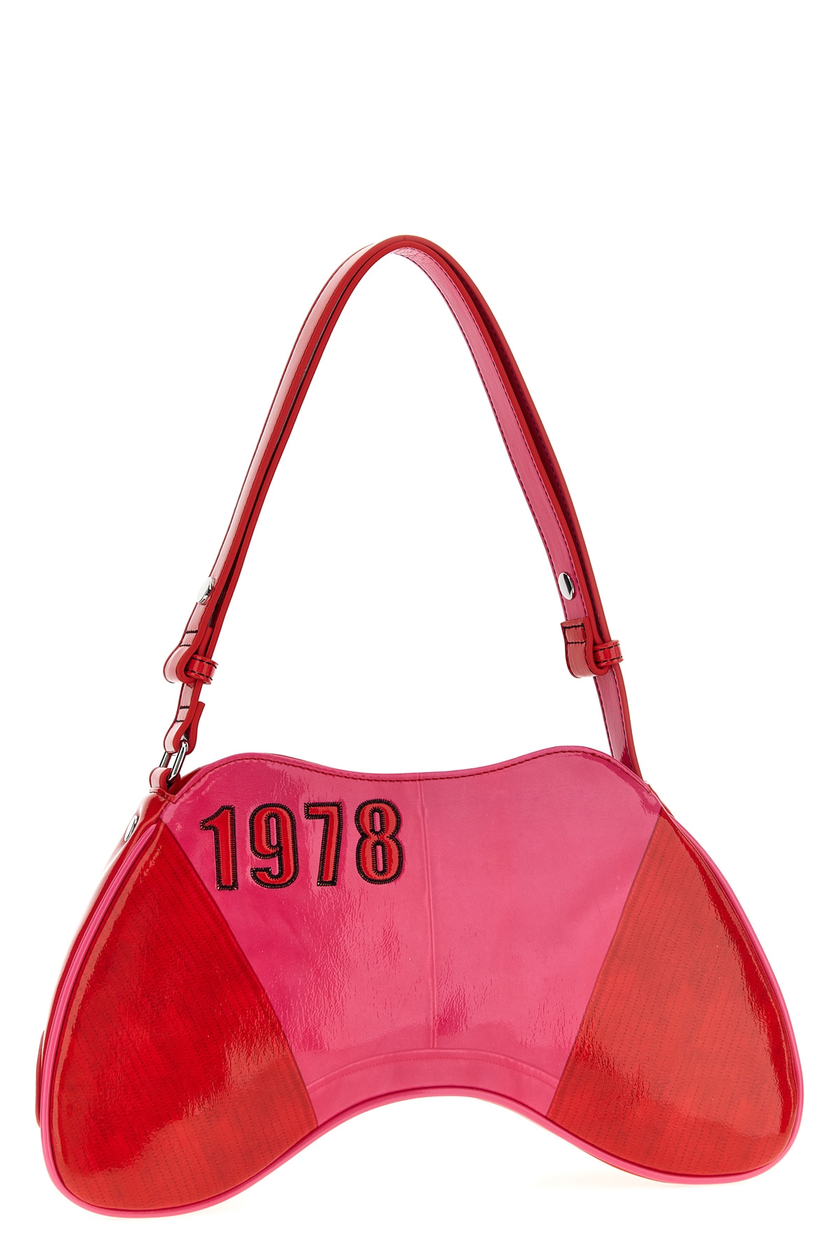 'Play Shoulder' shoulder bag in printed shiny PU with colour block, biker details, logo patch, exposed stitching, front metal logo, zip closure, adjustable handle.