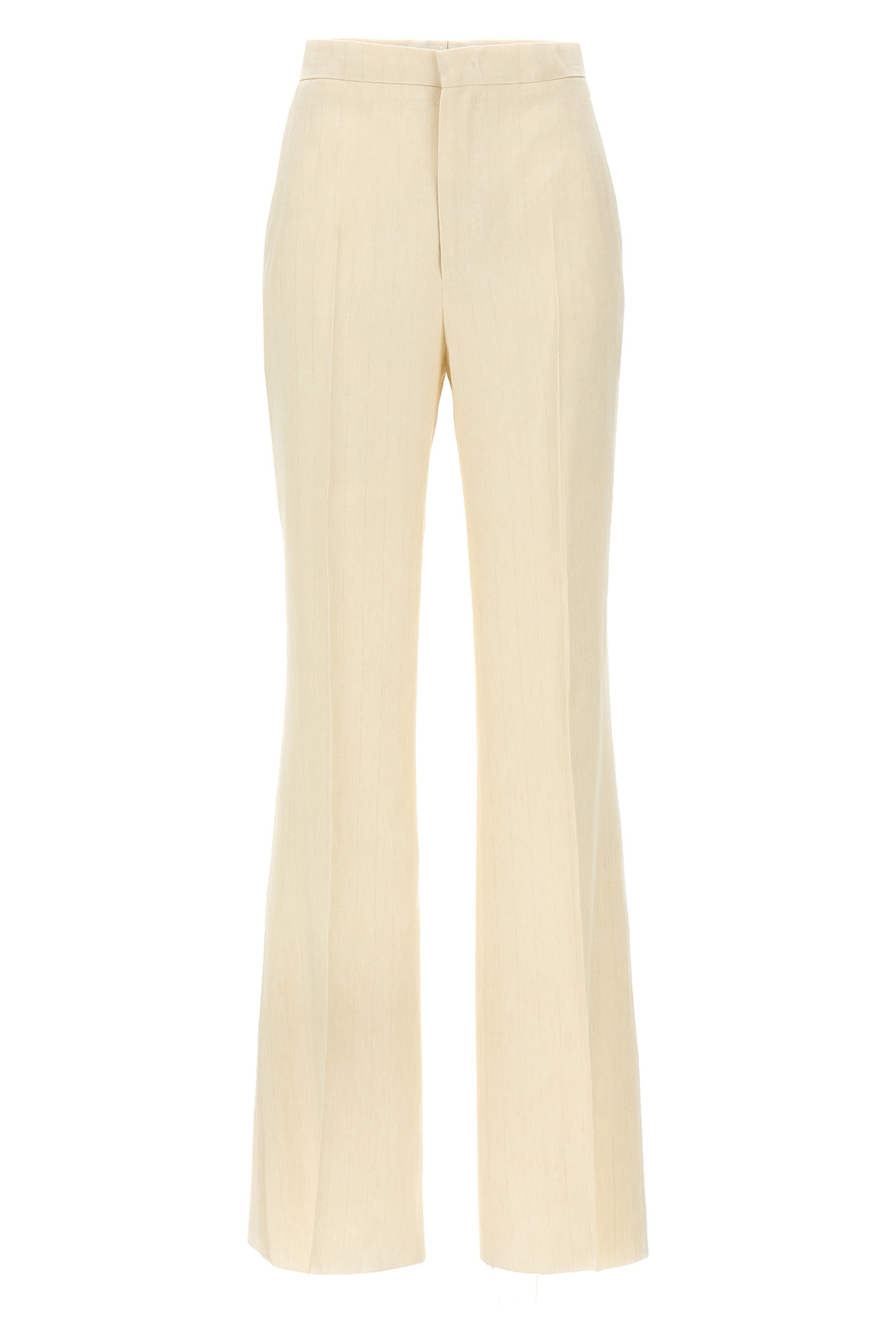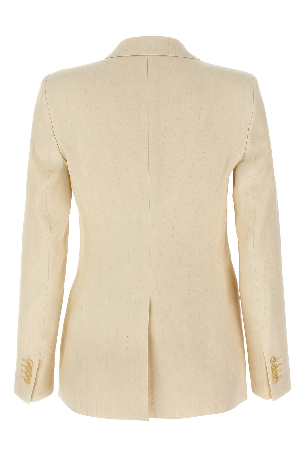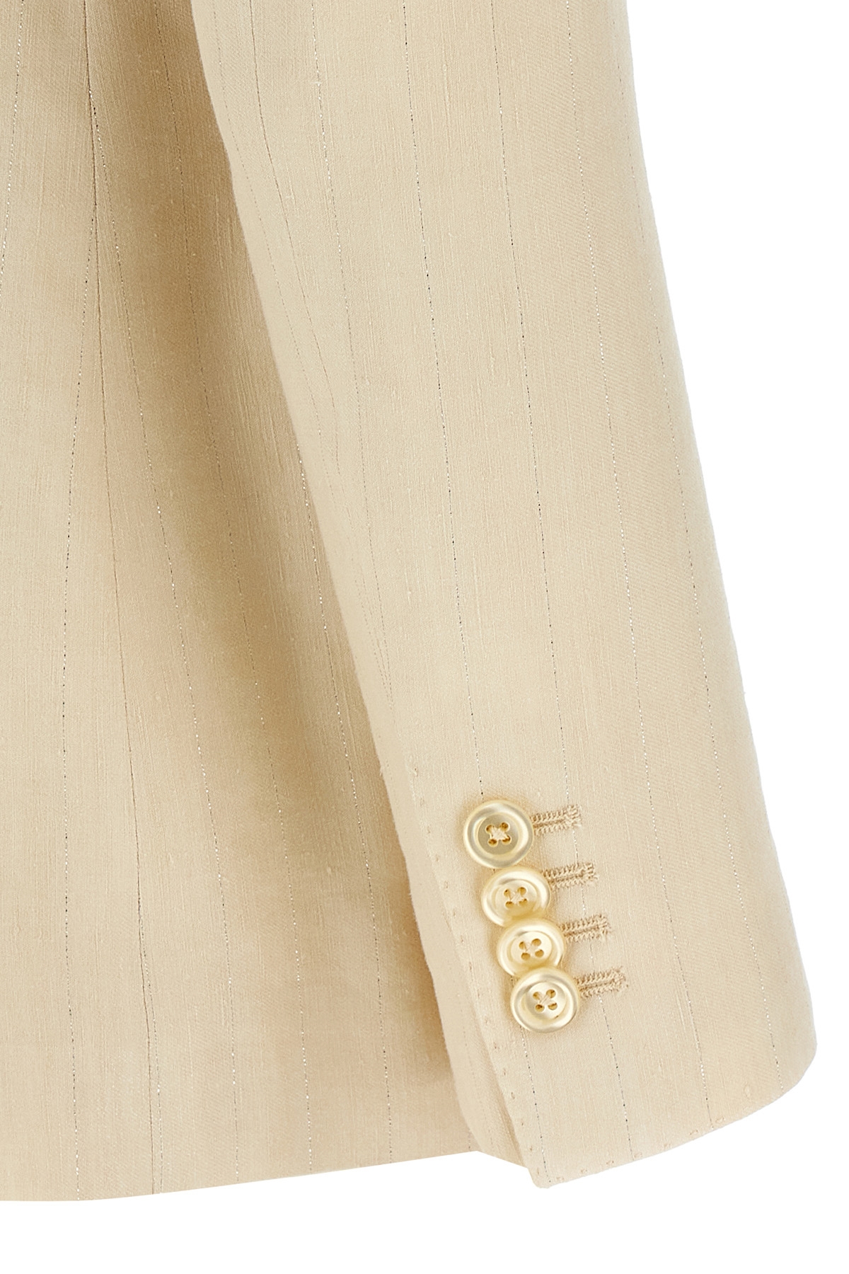 'Parigi' dress in linen and pinstripe viscose blend with lurex stripes consisting of double-breasted blazer with button closure, padded shoulders, long sleeves, back split and trousers with ironed pleat, zip and hook closure, pockets.