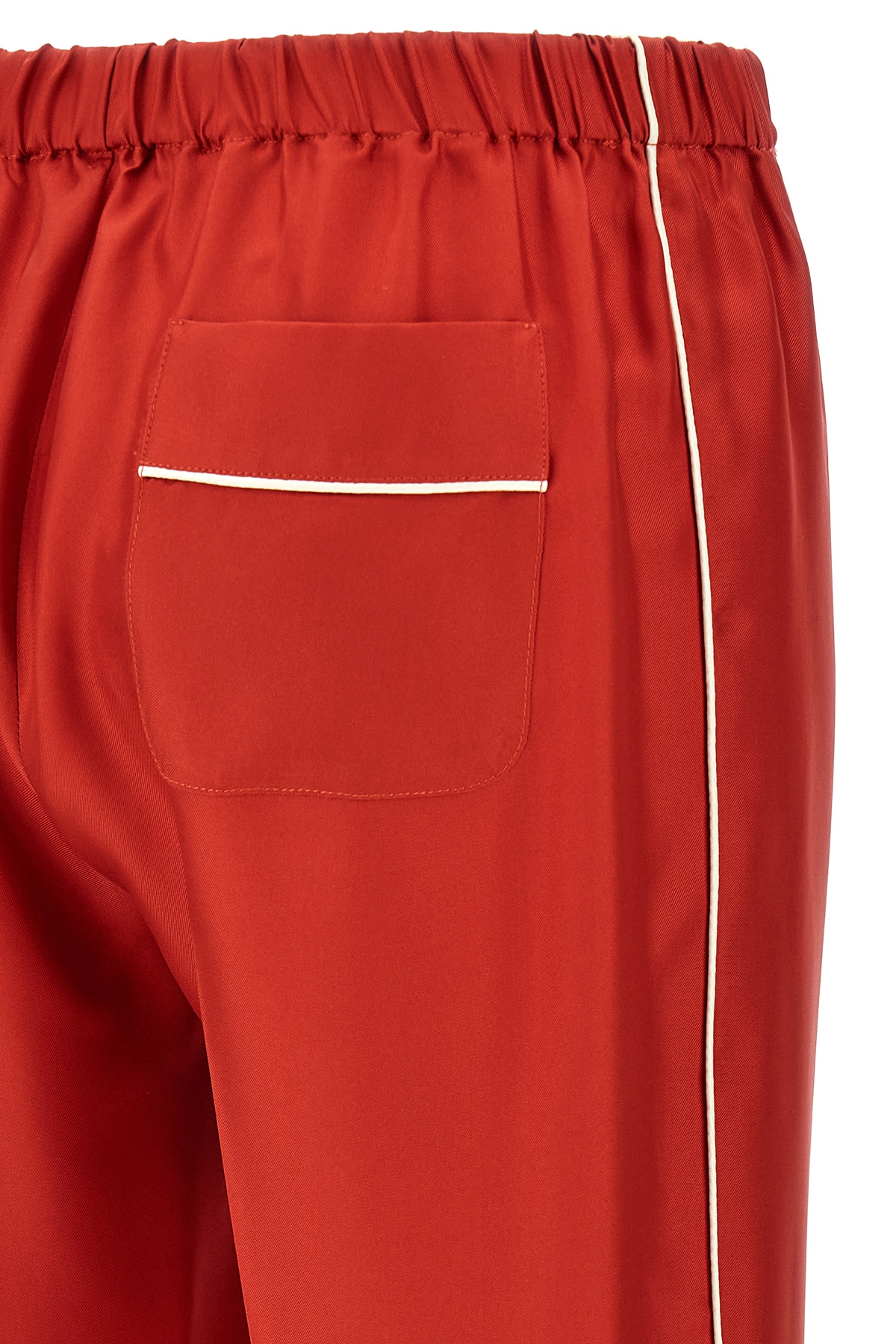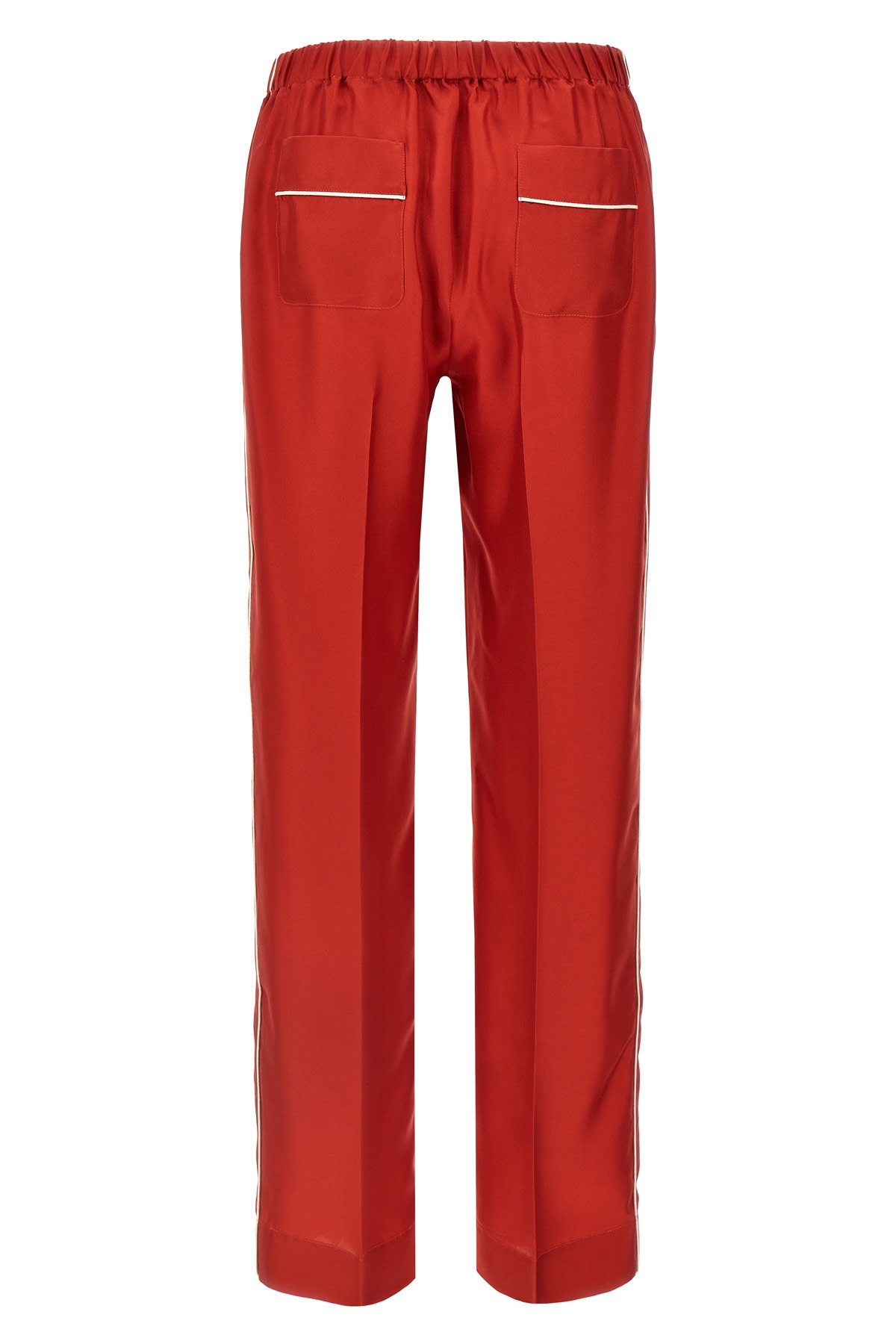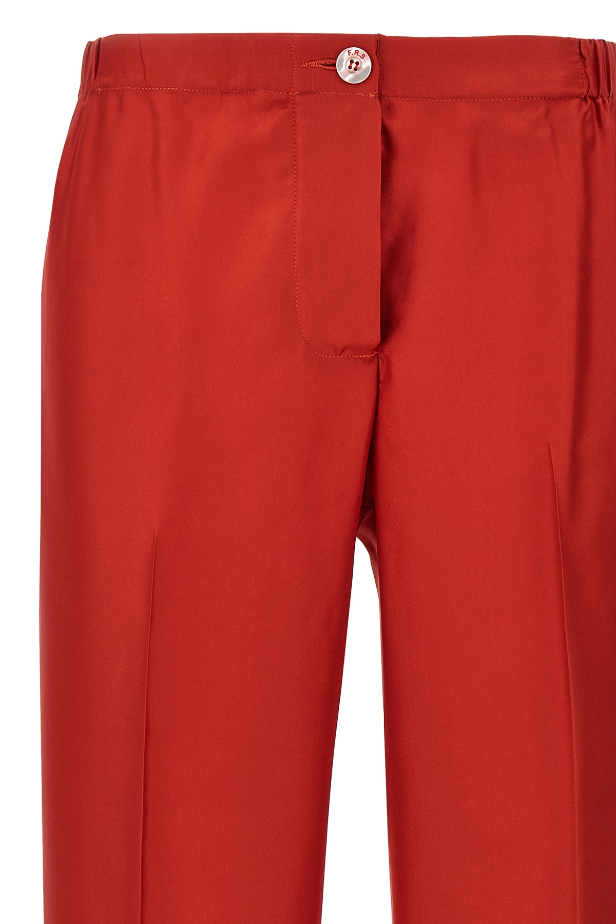 'Etere 6°' silk twill pants with contrast piping, flap with buttons, elastic waistband, pockets, straight leg with stretched crease.