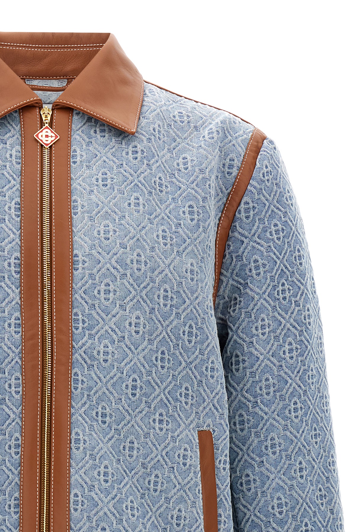Cotton denim jacket with jacquard 'Monogram' logo and contrast leather piping, zip closure, collar, pockets, long cuffed sleeves.