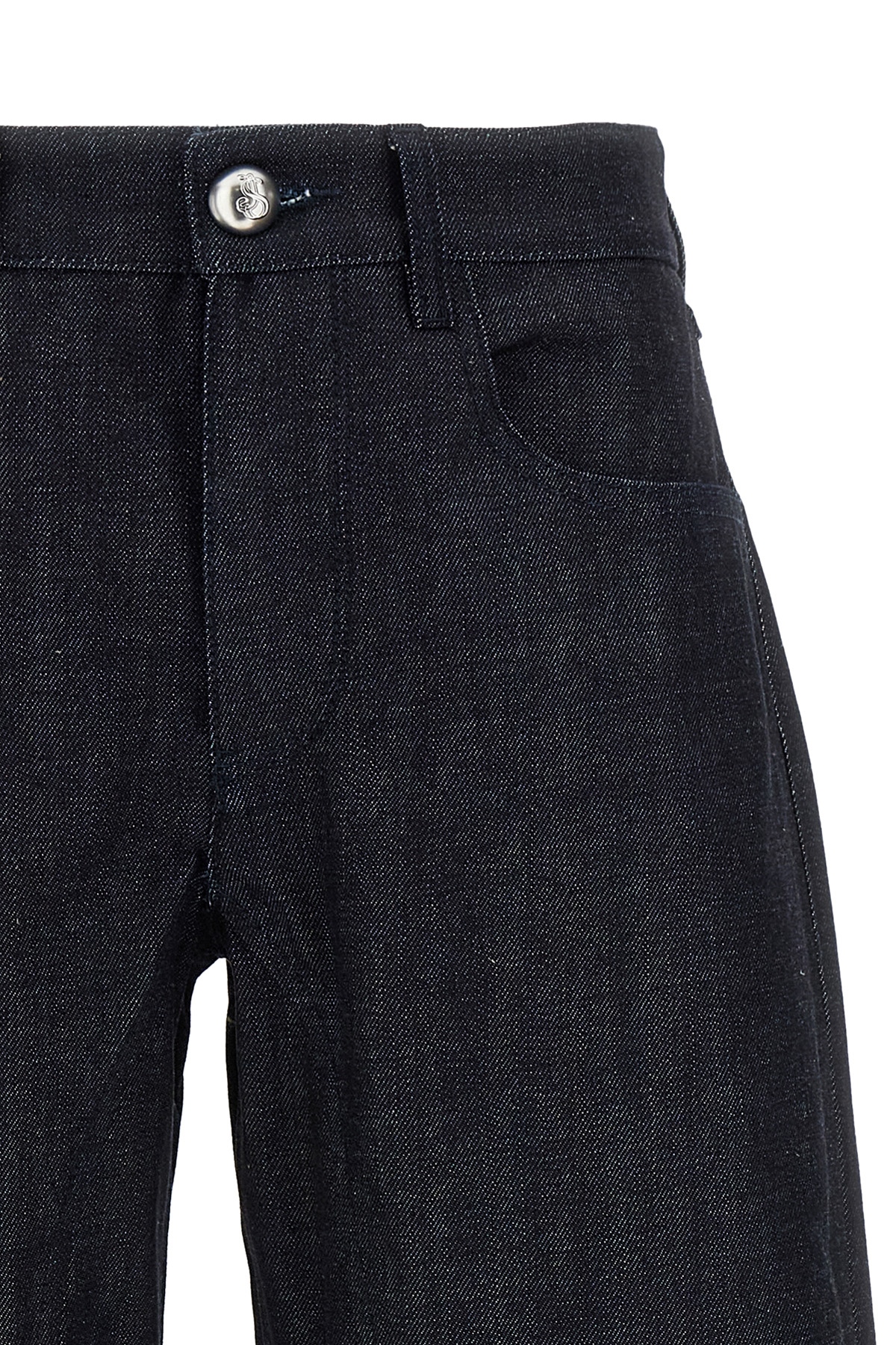 High-waisted cotton denim jeans with zip and button closure, five pockets, raw cut hem, and leather logo label at the back.