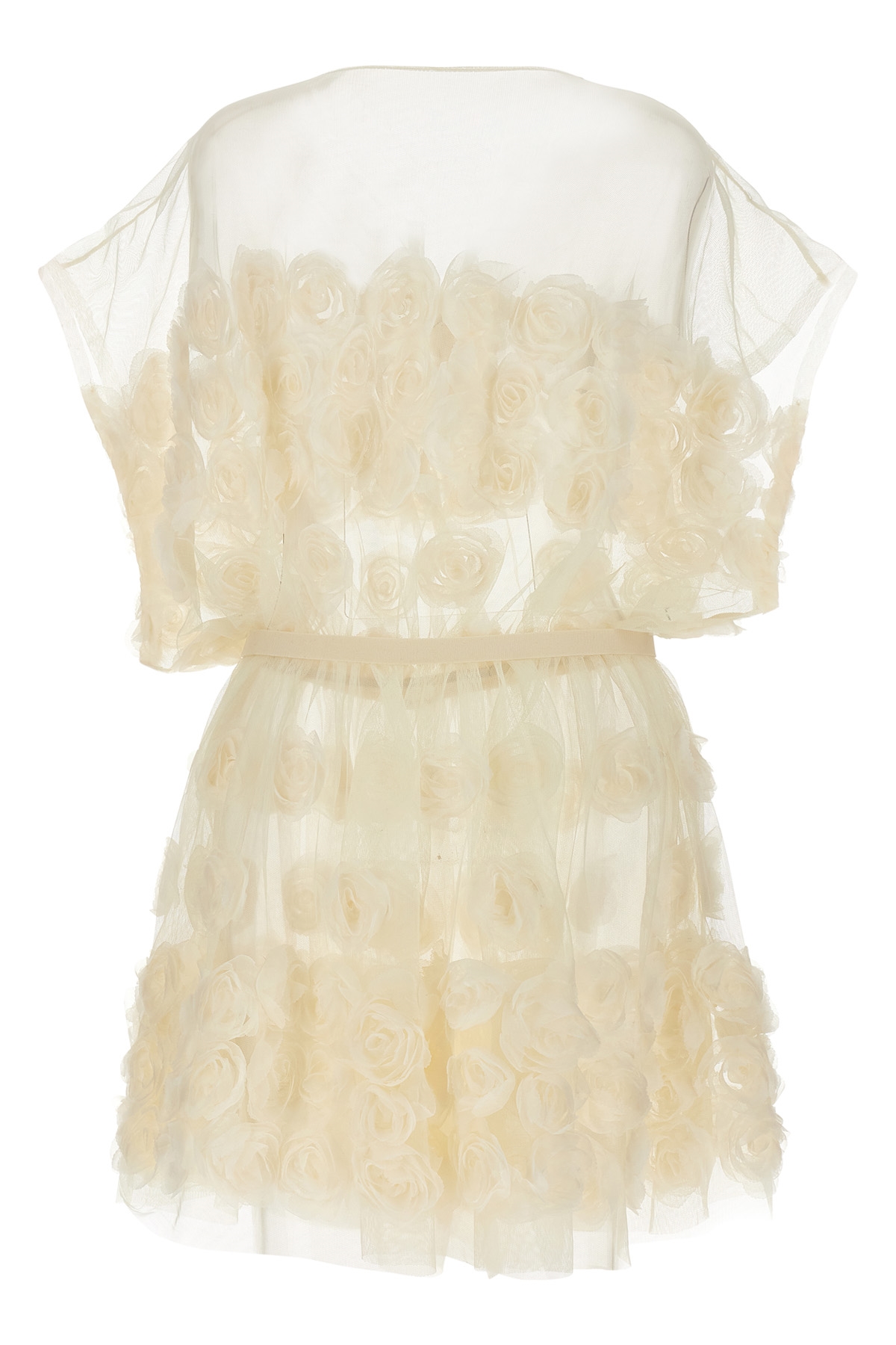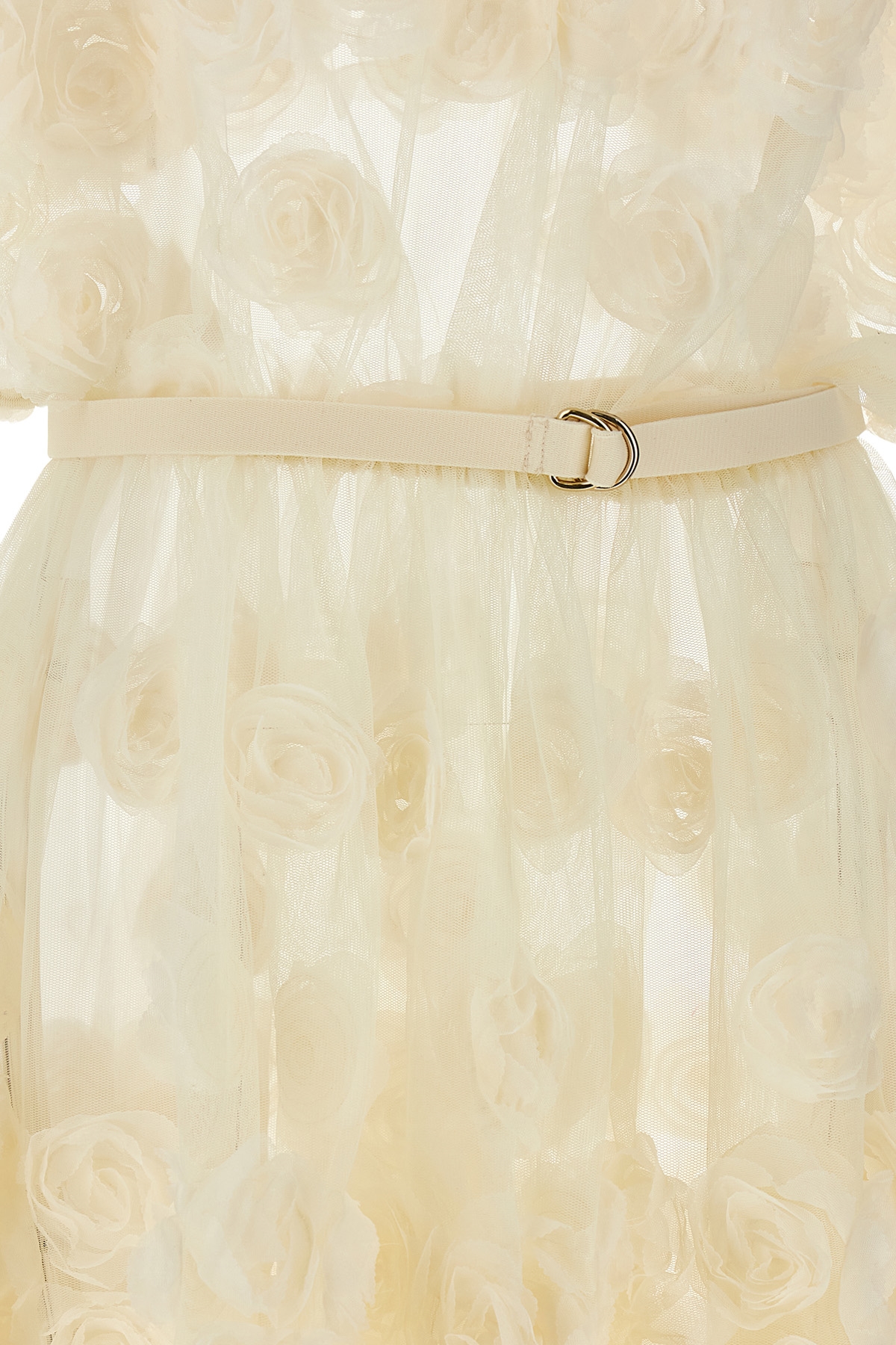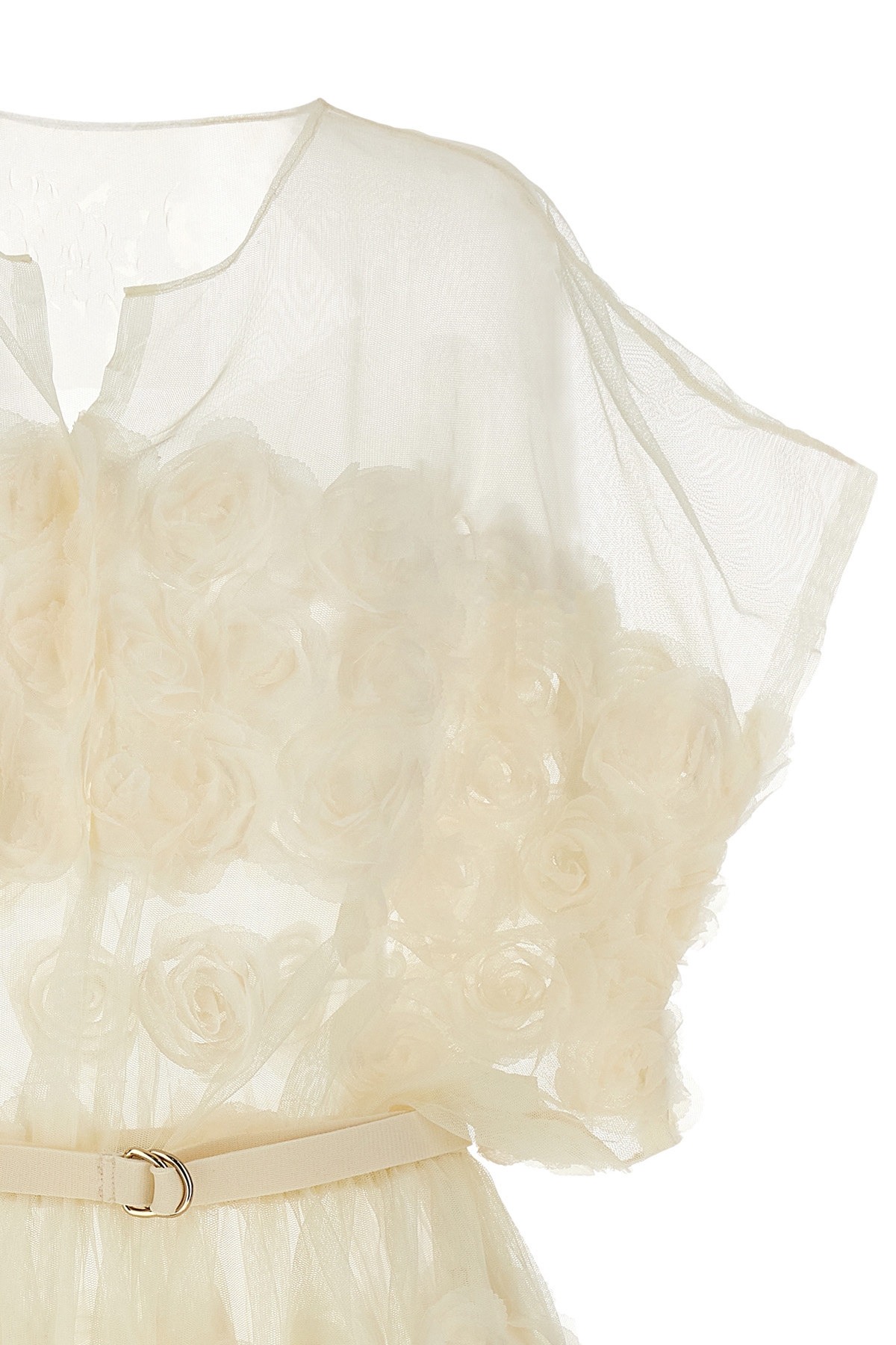 'Super OS' transparent tulle mini dress with 3D flower application, V-neck, short sleeves, elastic waistband, removable belt.