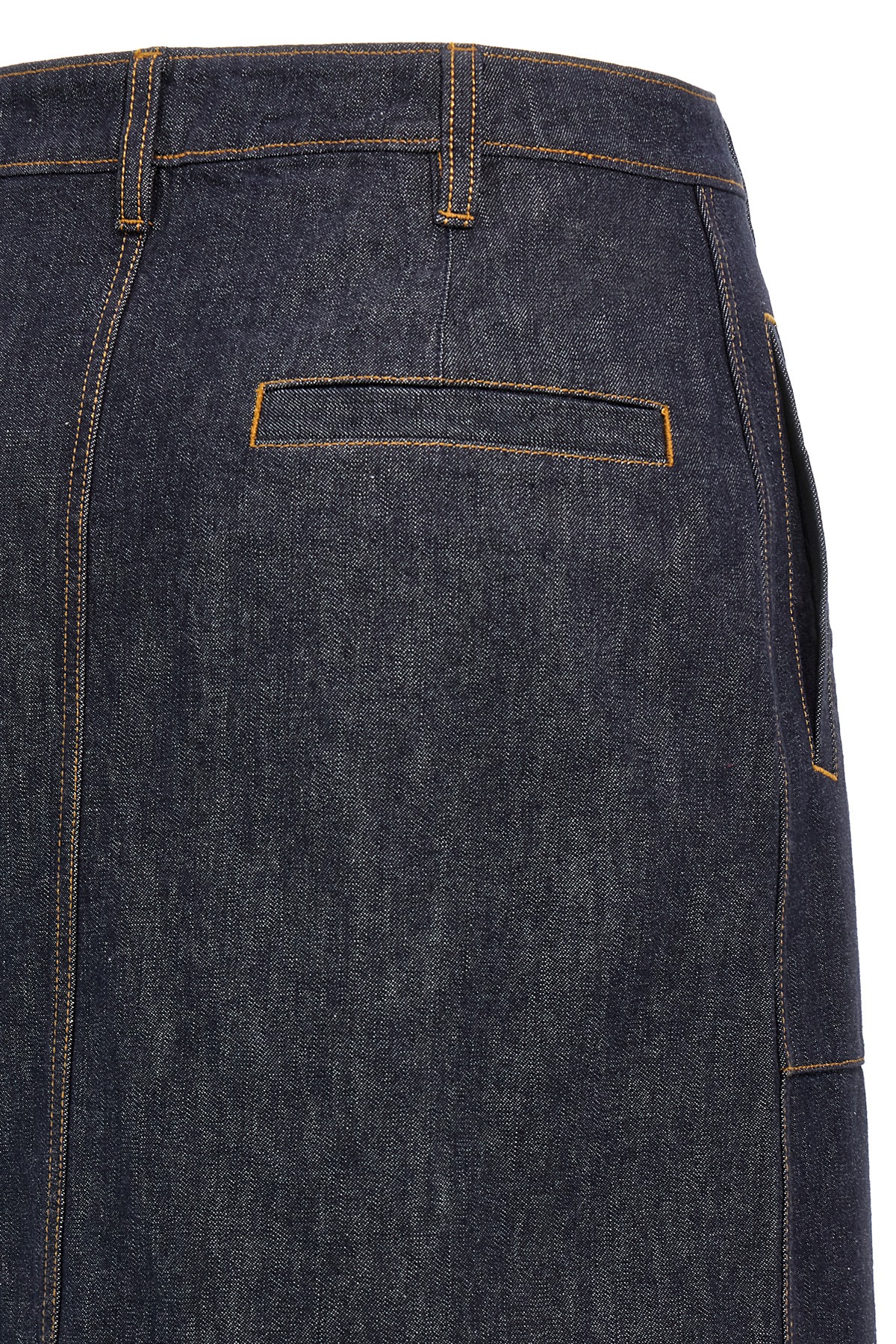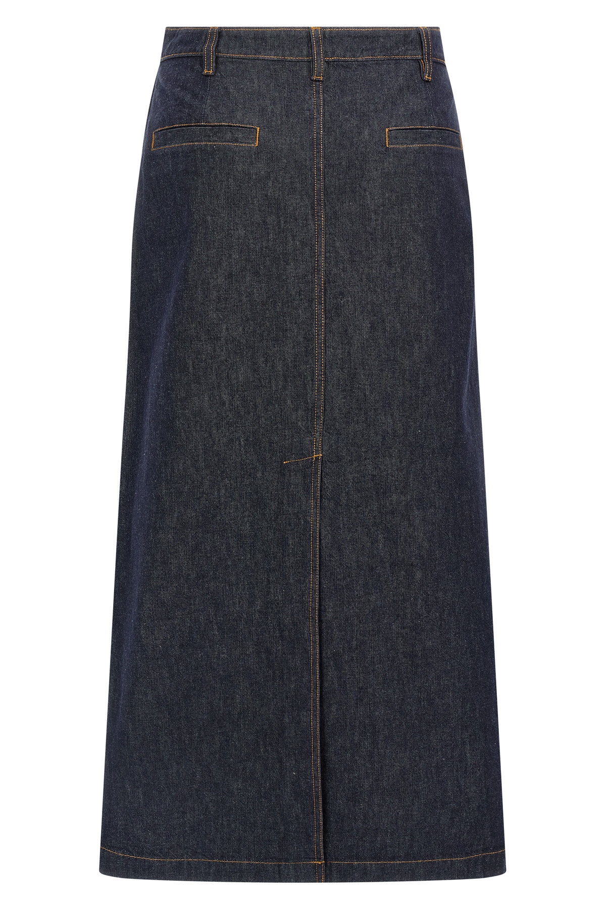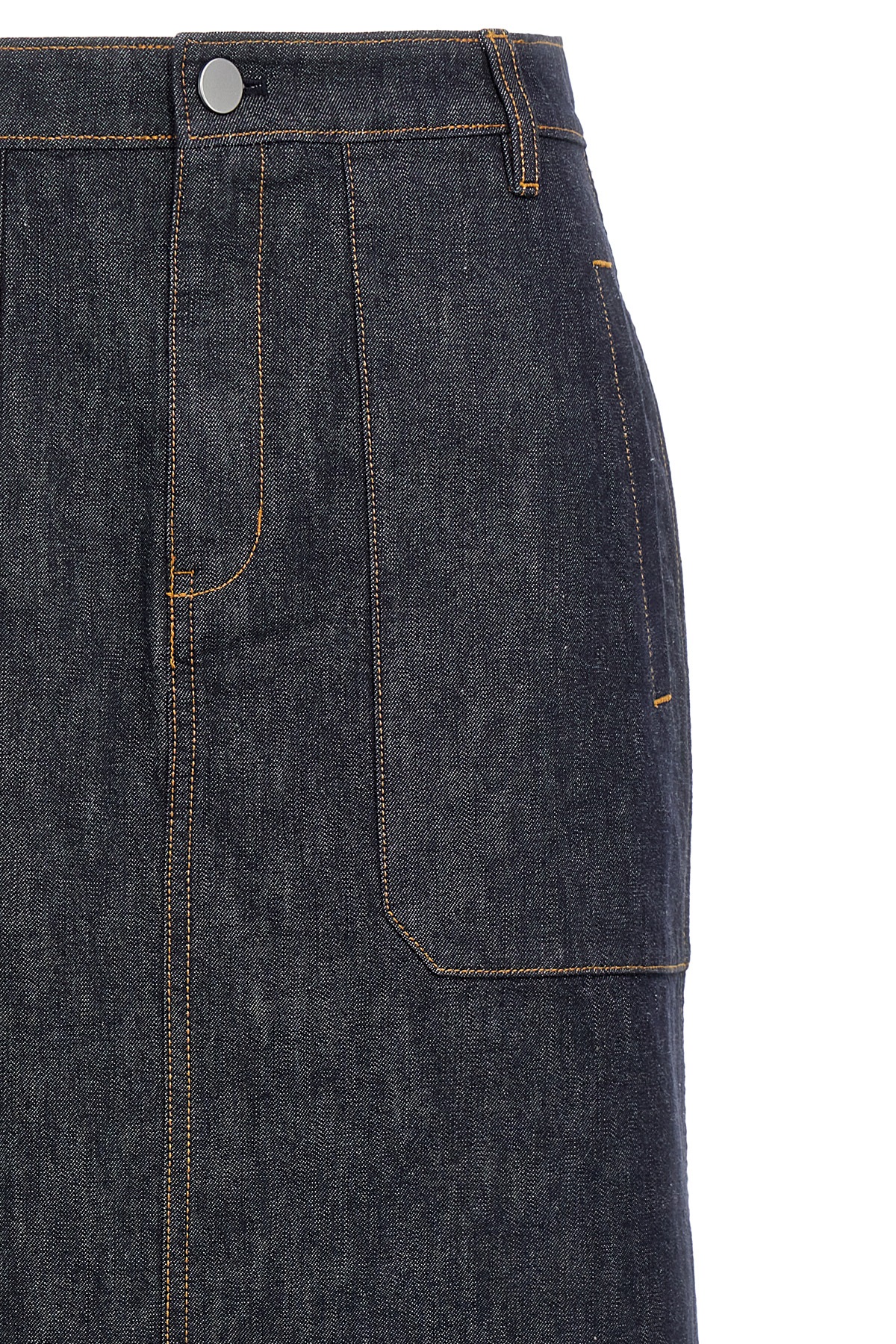 Midi skirt in denim with contrasting stitching, pockets, zip and button closure.