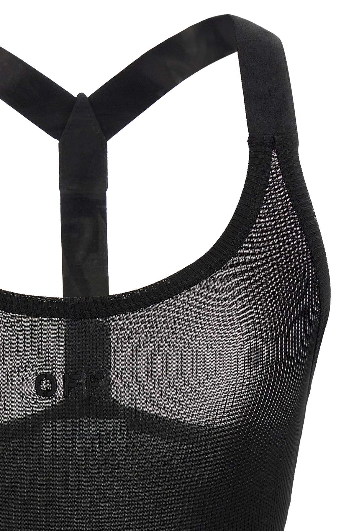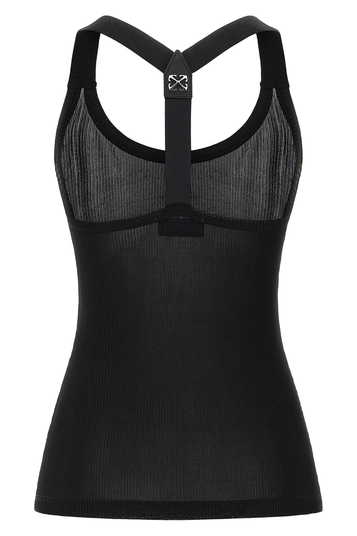 Ribbed stretch viscose tank top, suspender-style shoulder straps with back metal logo detail, tone-on-tone logo embroidery on the front.