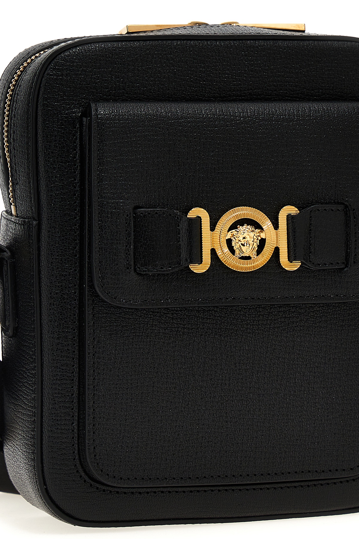 Granulated leather crossbody bag with gold metal 'Medusa Biggie' applique, zip closure, adjustable shoulder strap.