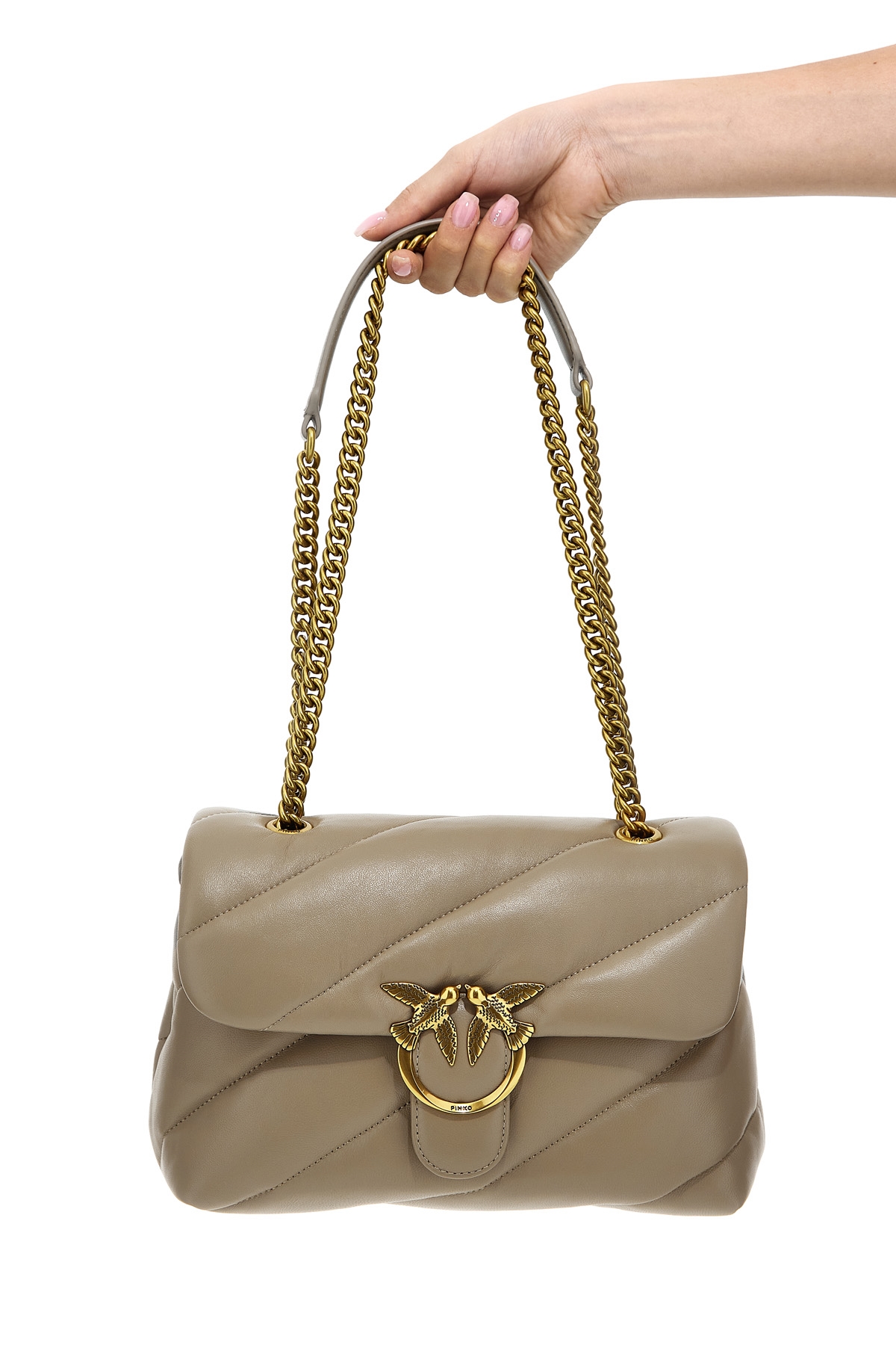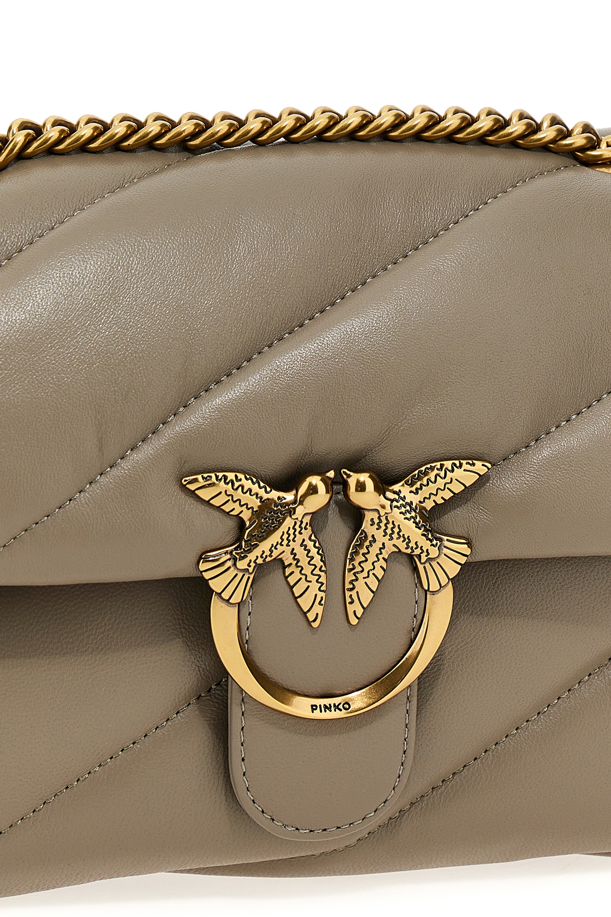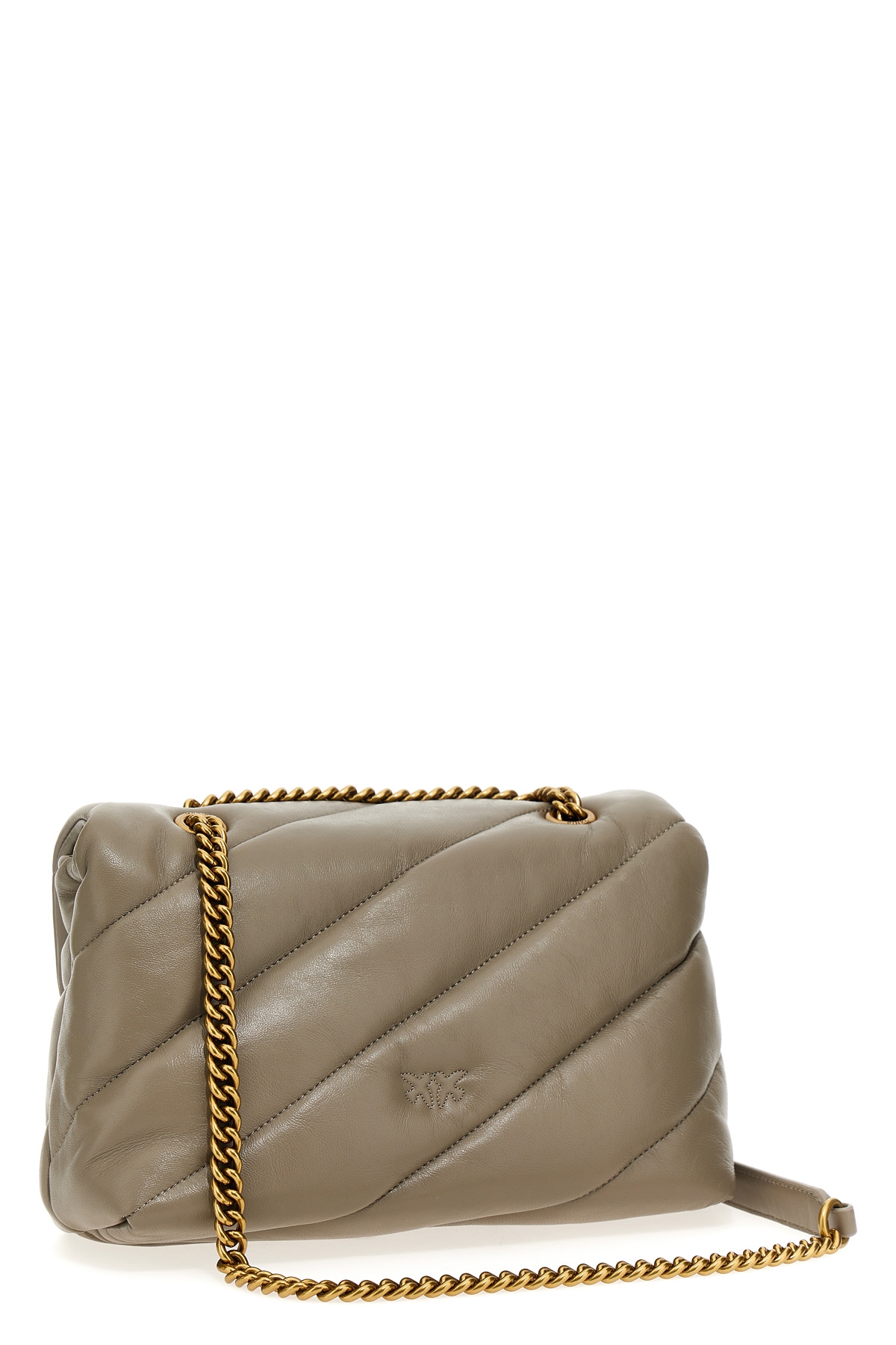 Love Classic Puff' matelasse leather crossbody bag with magnetic flap closure with front metal logo application, leather shoulder strap and adjustable chain.