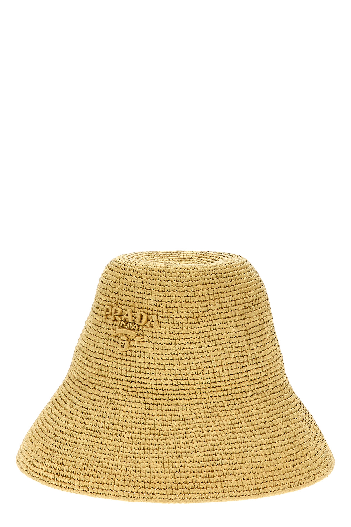 Crochet raffia bucket hat with front logo embroidery.
