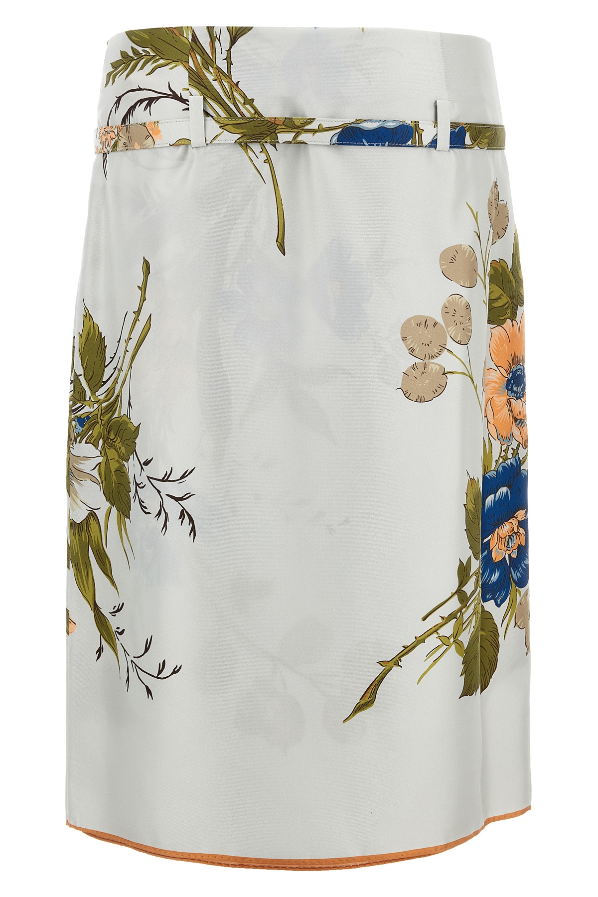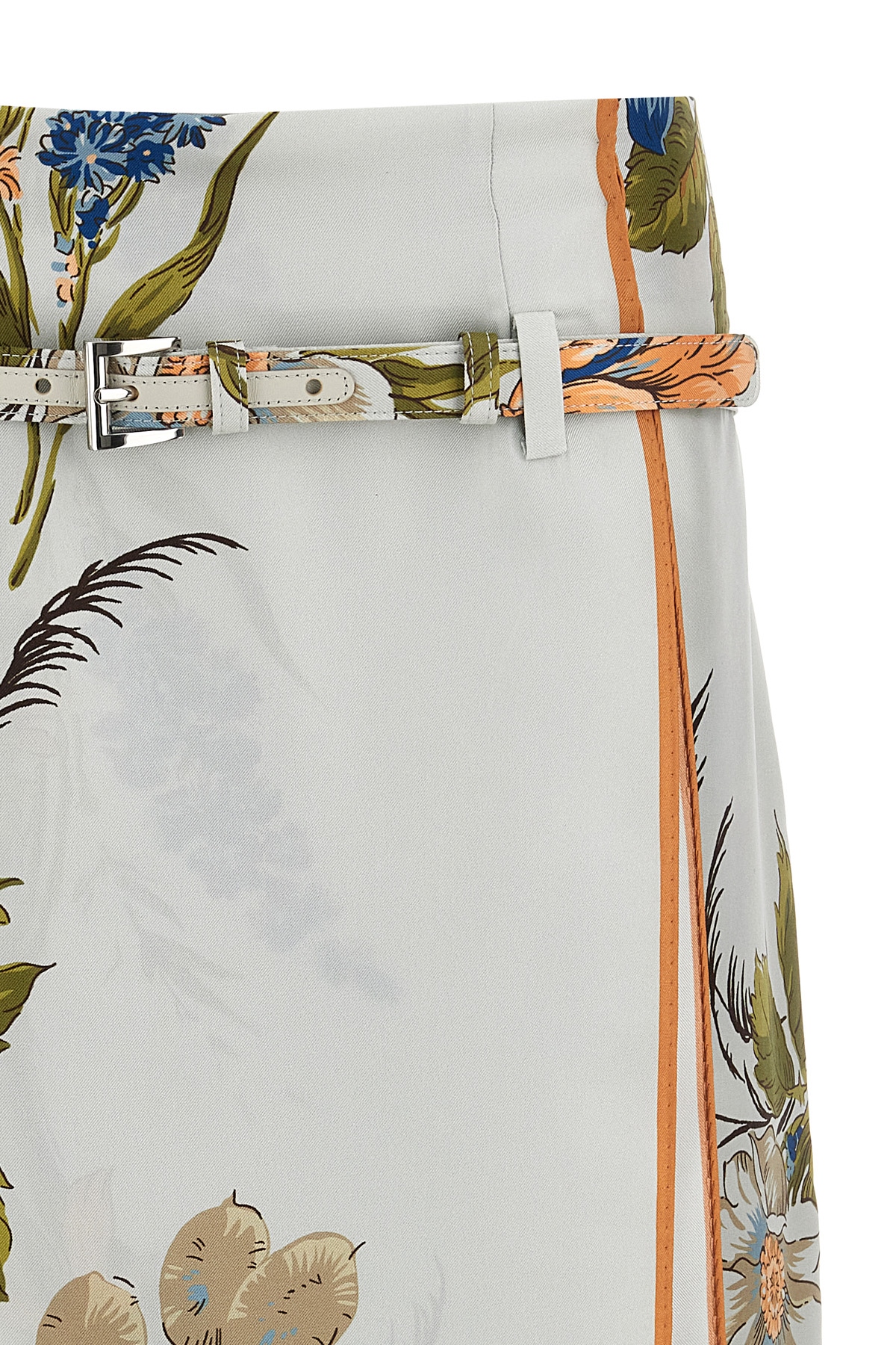 'Genziana' skirt in printed silk twill, side hook and button closure, matching belt.