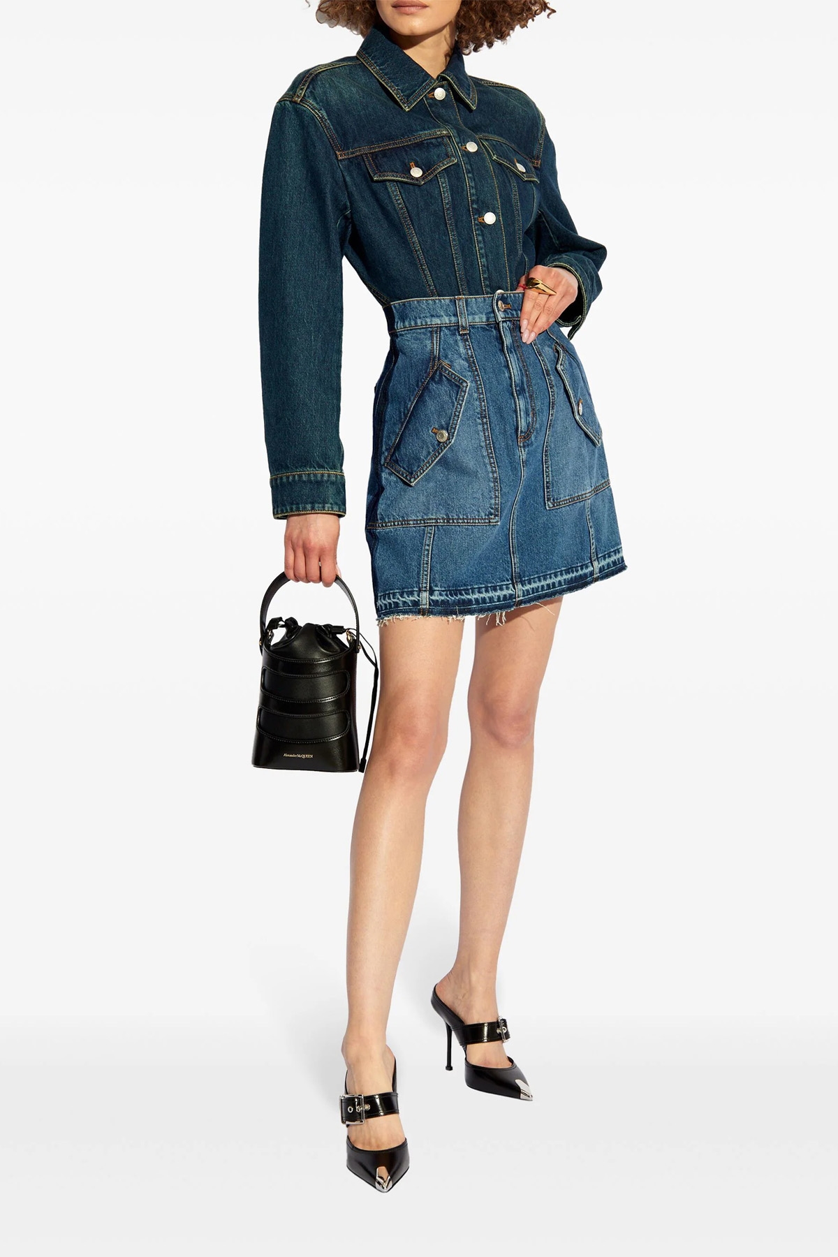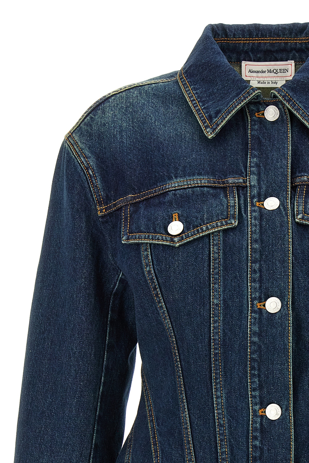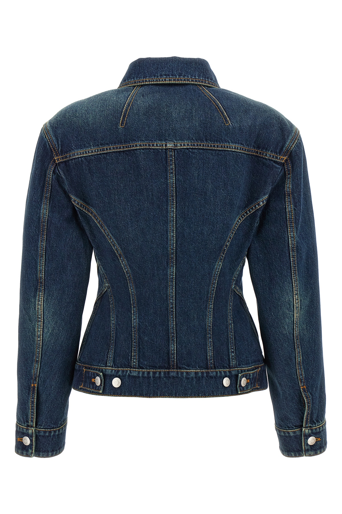 Cotton denim jacket with front button closure, contrast stitching, long sleeves with cuffs and button.