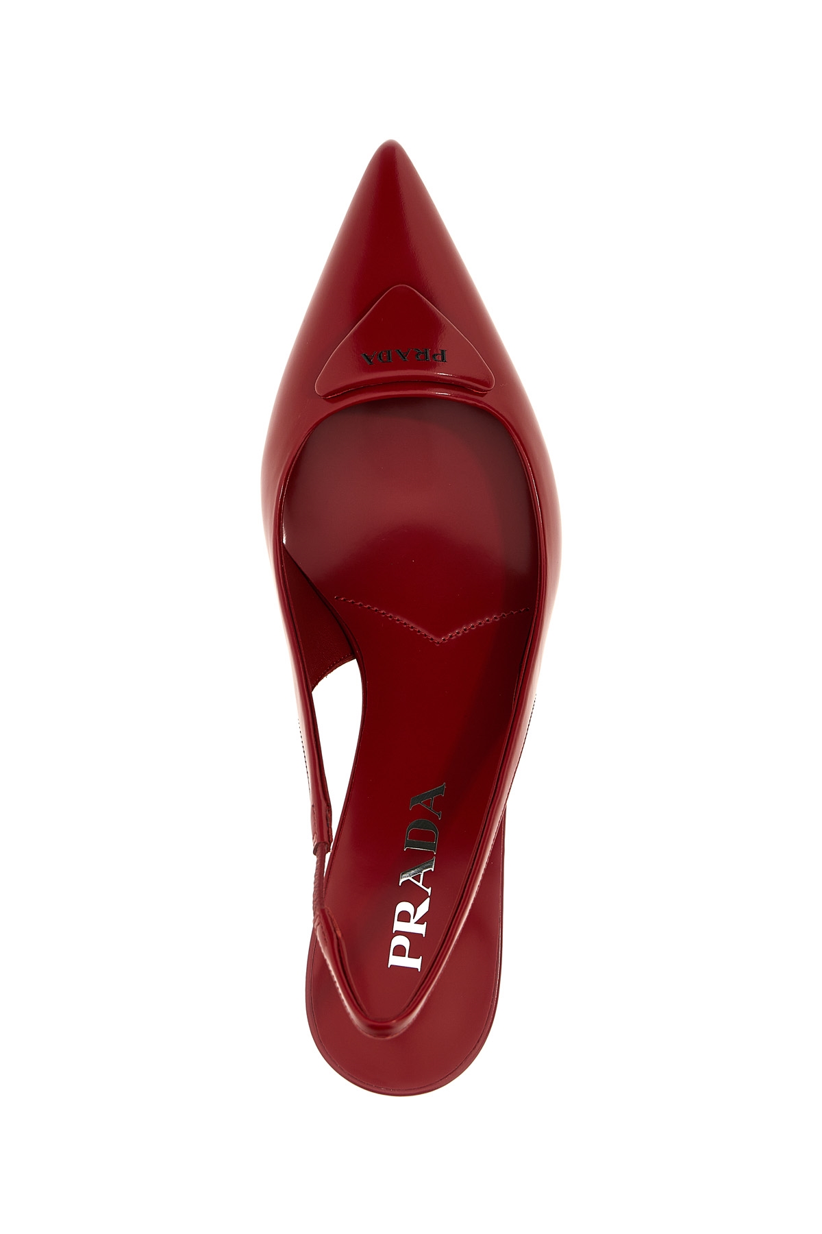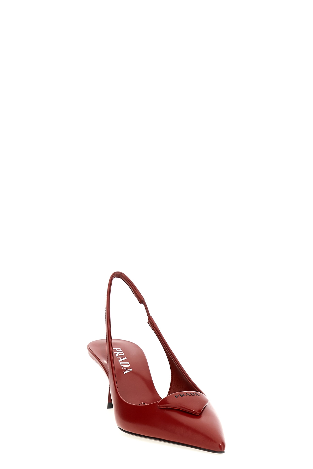 Leather slingbacks with triangle leather logo application on the front, elastic strap, sculptural heel.