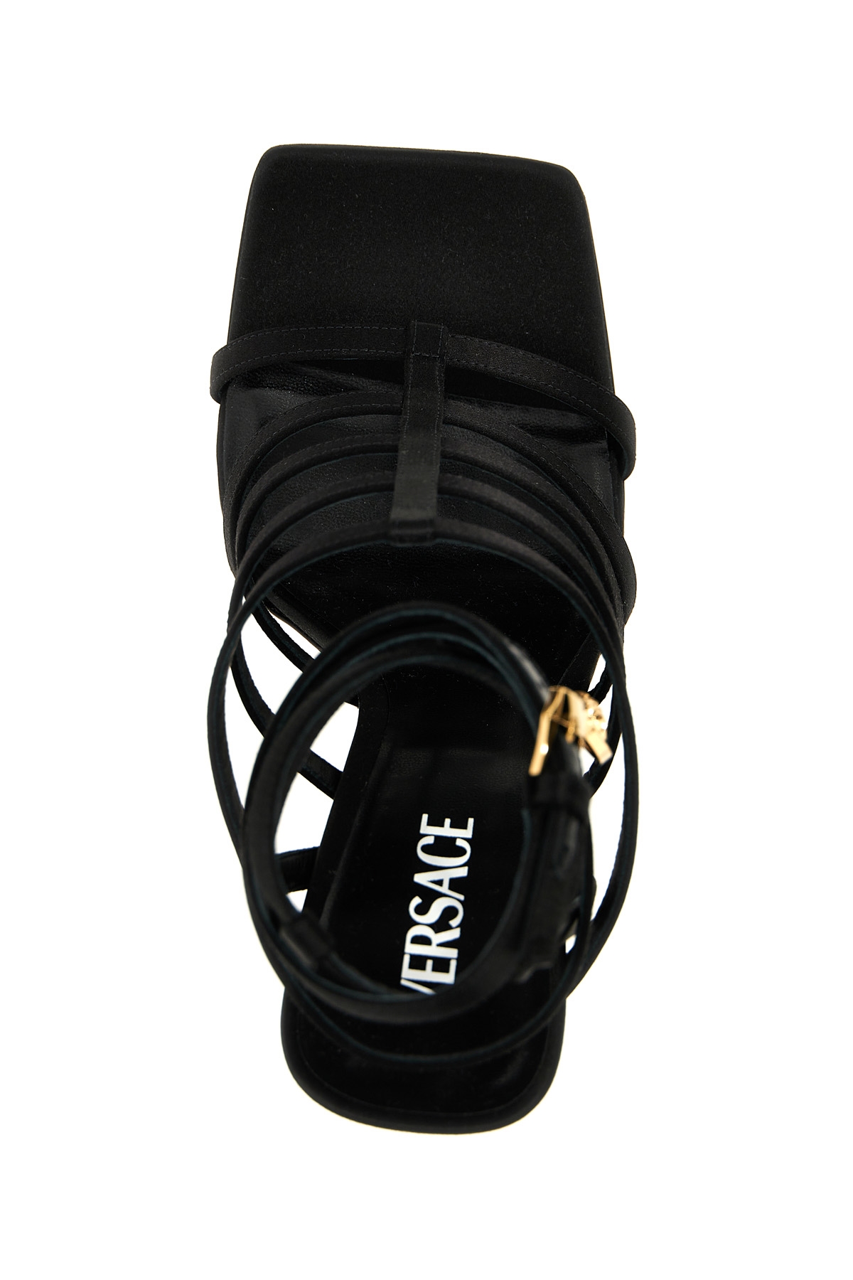 'Lycia' satin sandals with adjustable ankle strap, square toe, heel, leather sole. The right sandal is embellished with a 'Medusa '95' pendant on the ankle strap