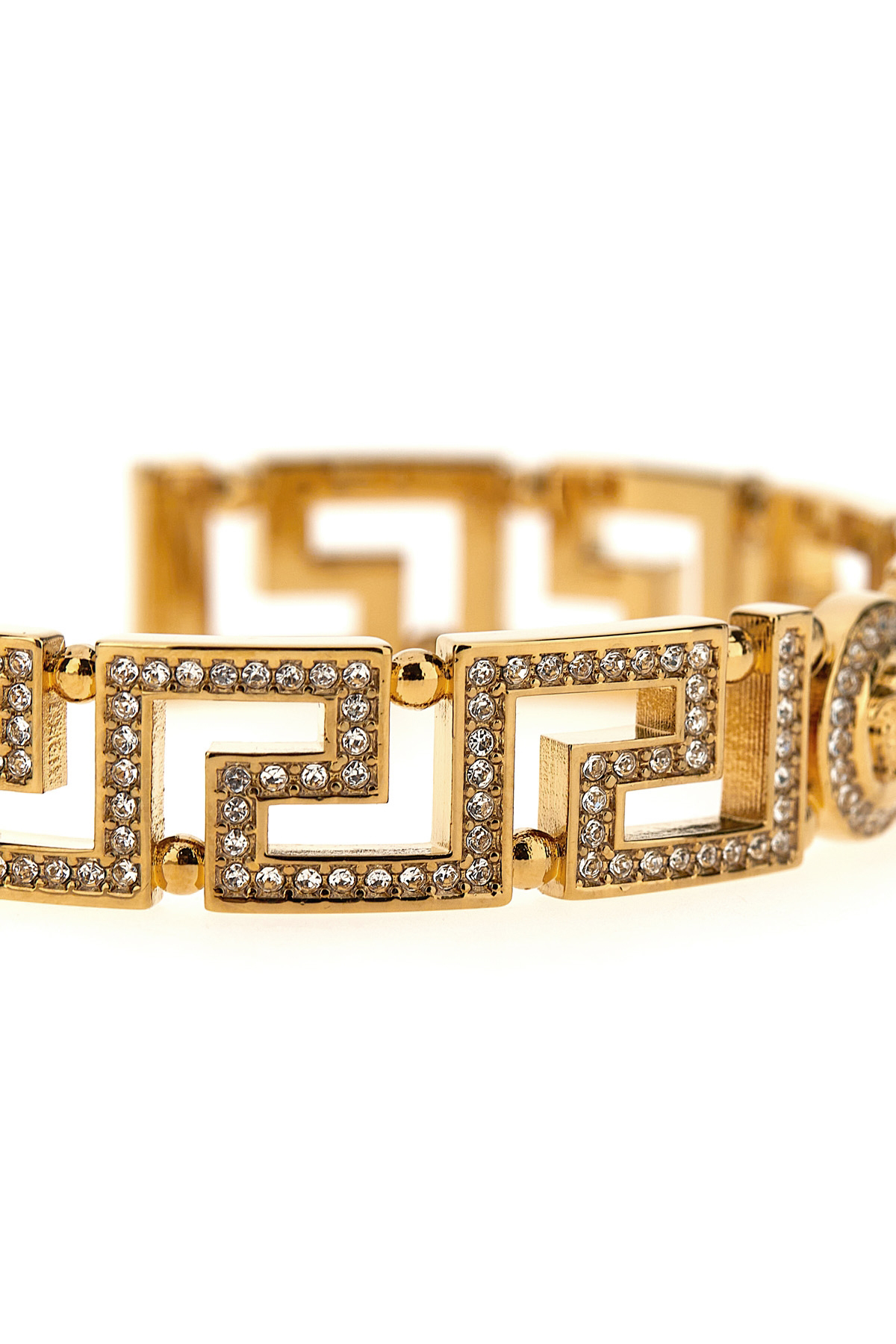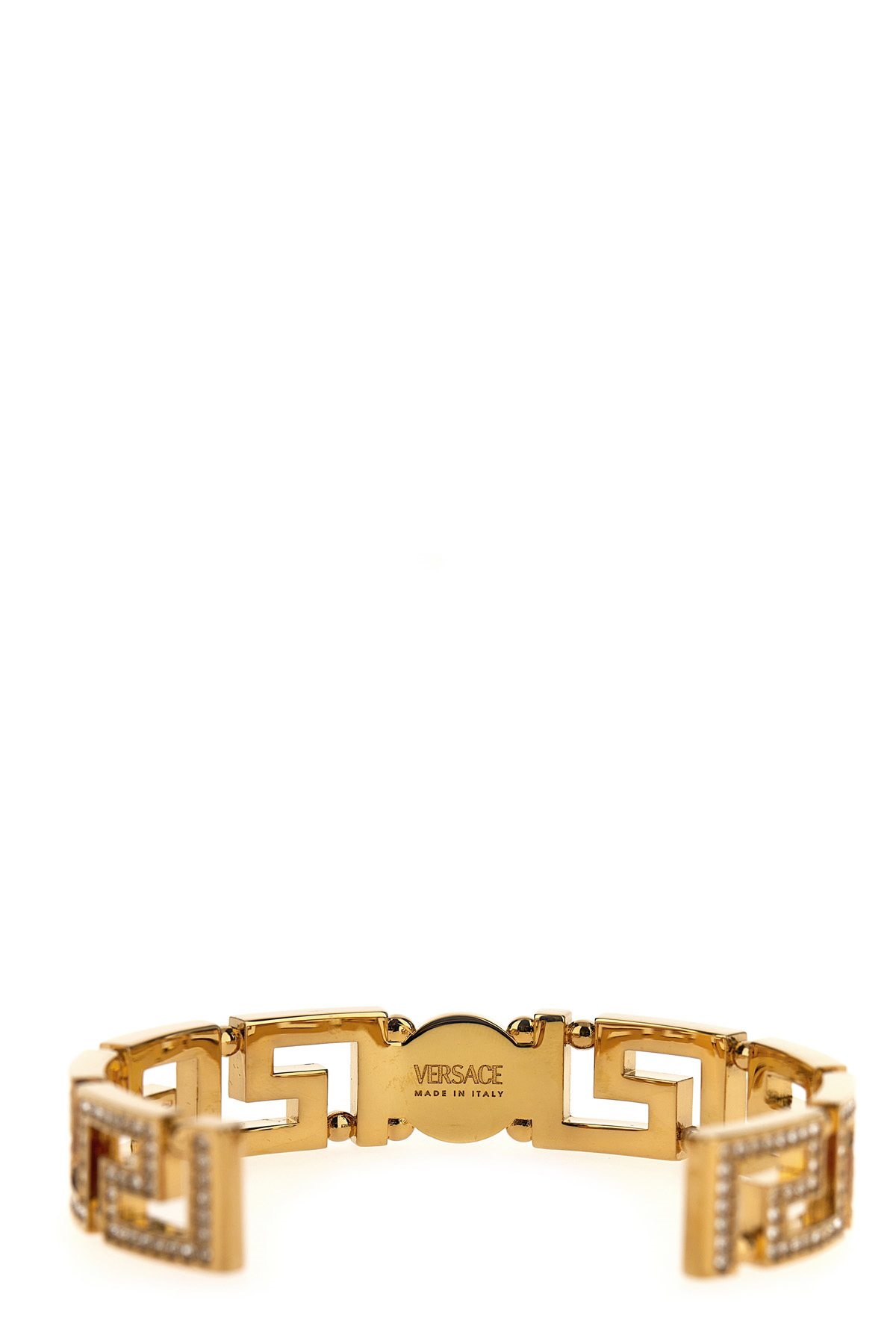 Gold metal and Swarovski crystals bangle, Medusa in the center, 'Versace Greca' design.