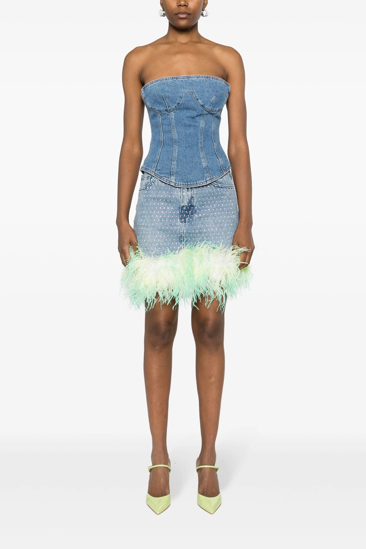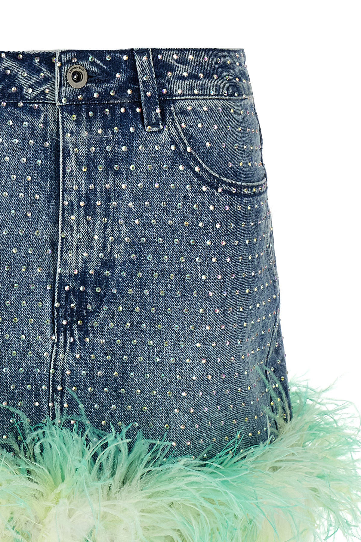 'Blue Rhinstone Feather Denim' cotton denim miniskirt with all-over rhinestones and feathers on the hem, zip and button closure, five pockets.