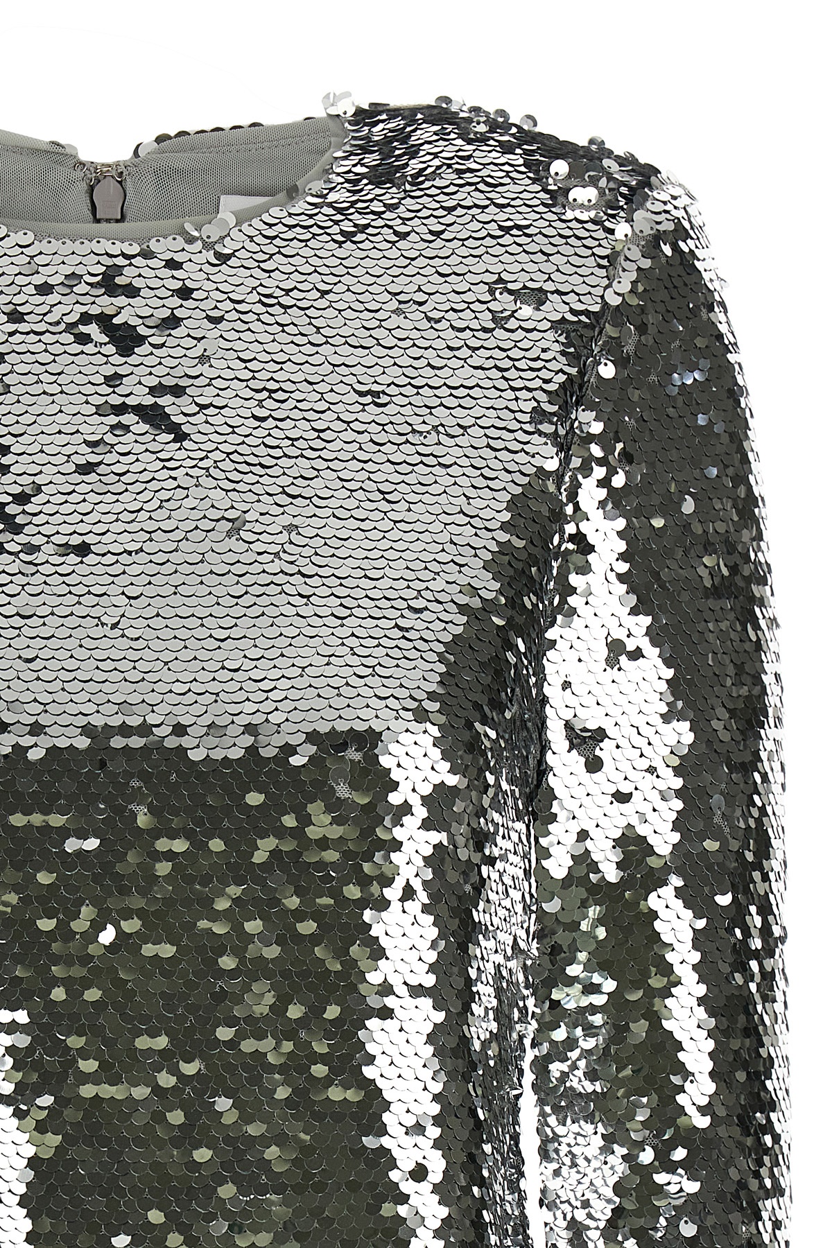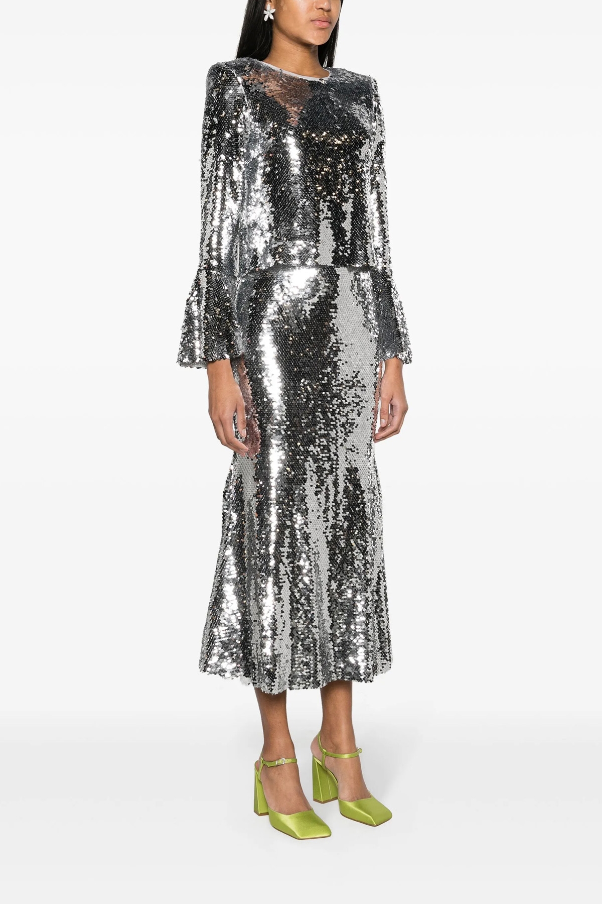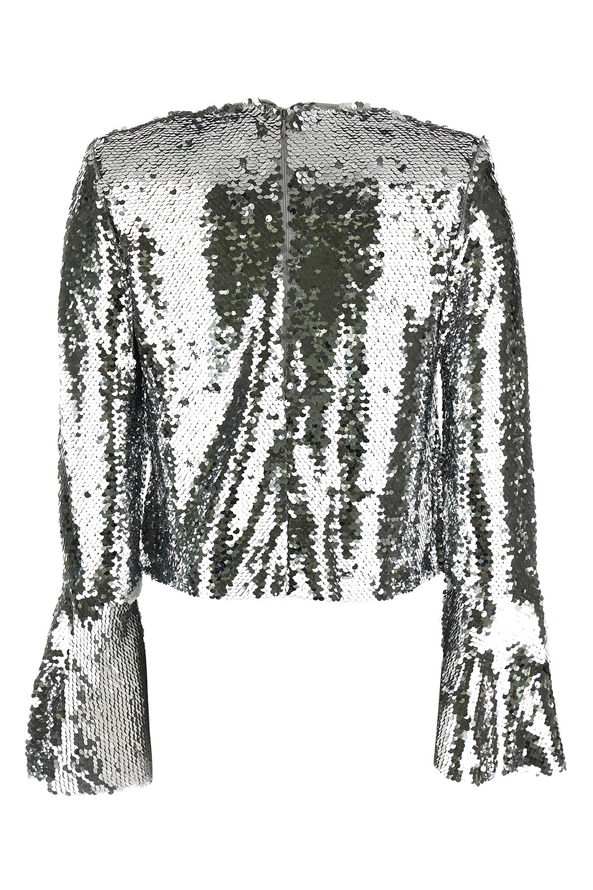 'Silver Sequin Flared Sleeve' sequin-covered fabric top with crewneck, back zip closure, long sleeves with bell hem, padded shoulder strap, petticoat.
