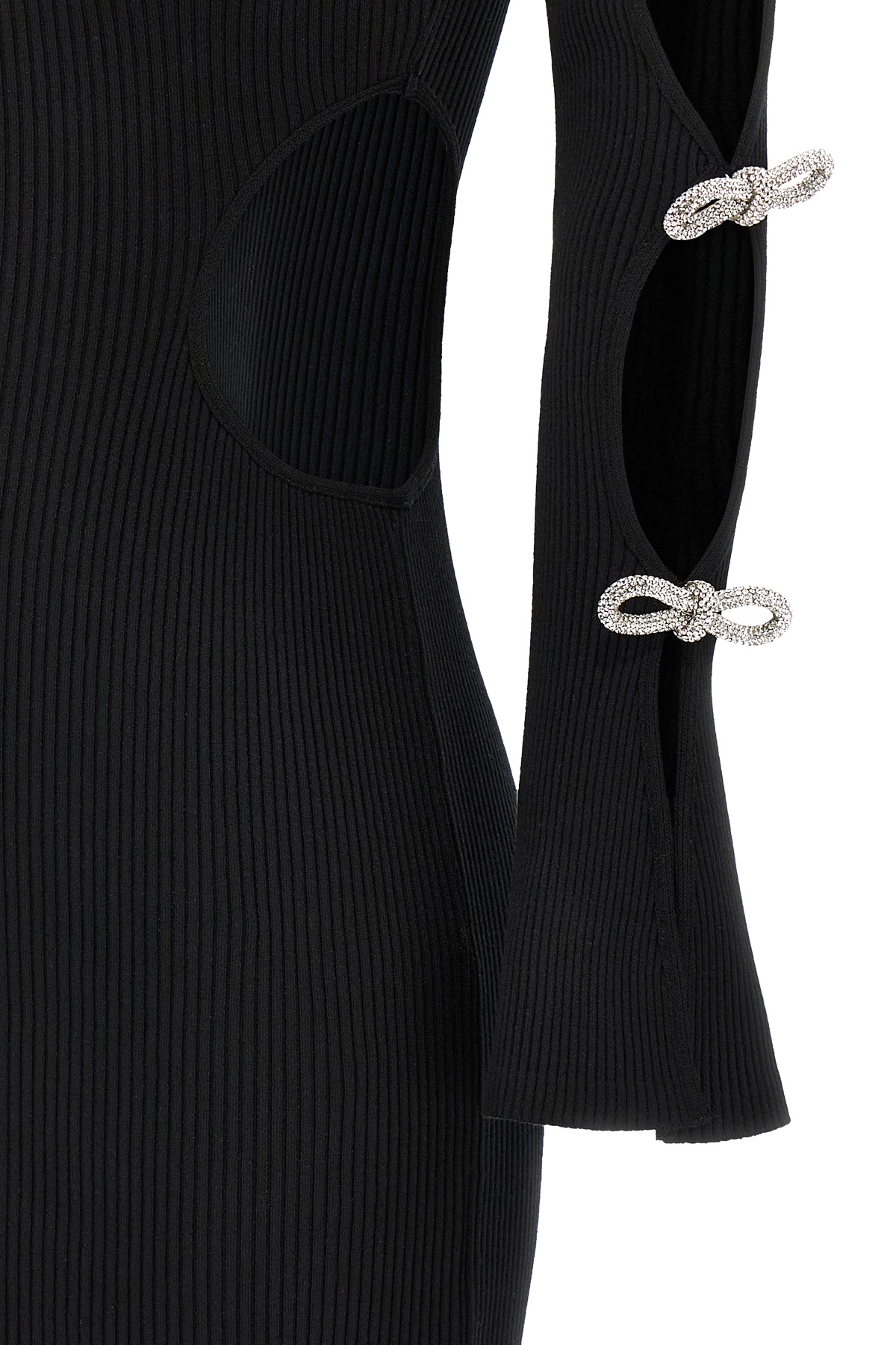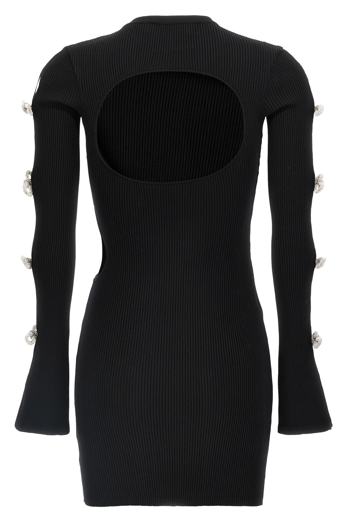 'Cut-Out Crystal Bow' mini dress in stretch viscose blend with all-over cut-out details, crew neck, long sleeves with rhinestone bow decoration.