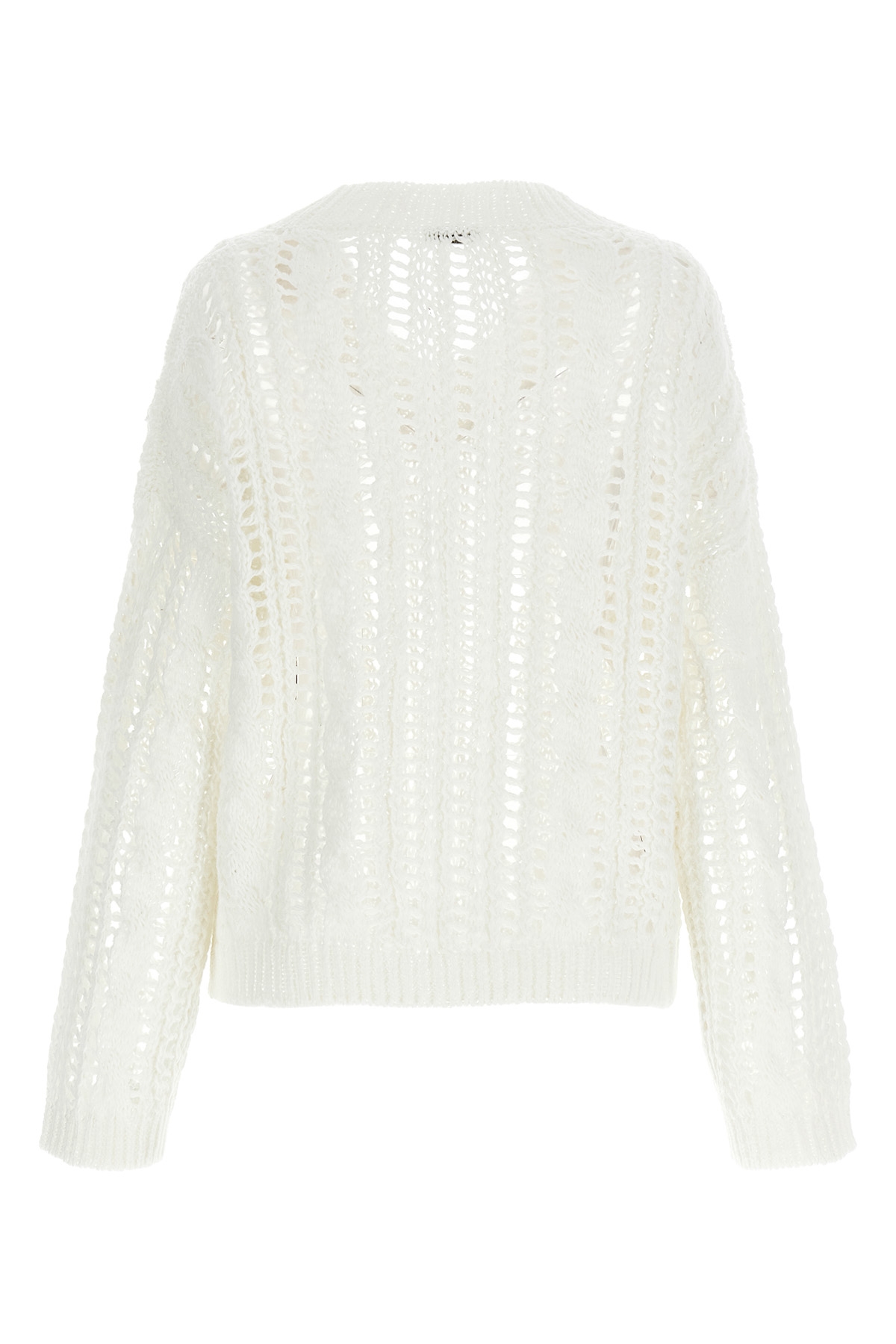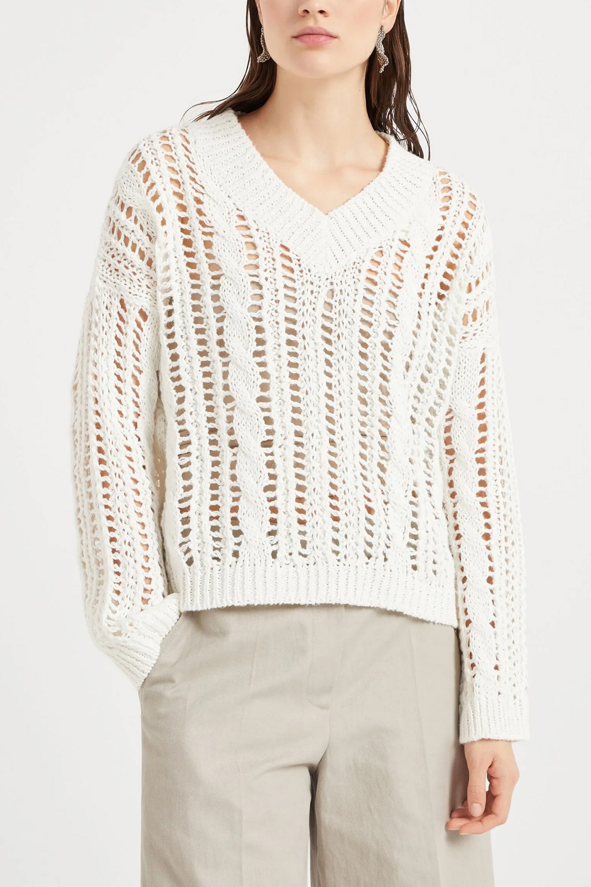 Jute and cotton thread crochet sweater, V-neck, long sleeves with cuffs and dropped shoulder.