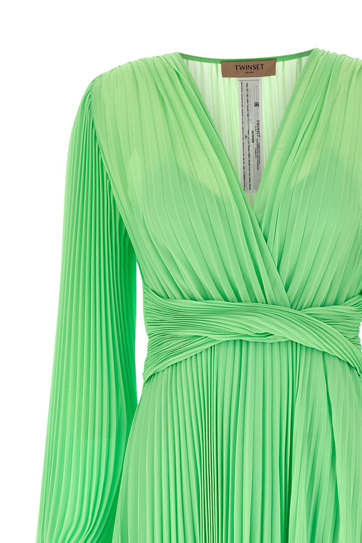 Long pleated dress with deep V-neck, curled detail at the waist, long sleeves with elastic on the hem.