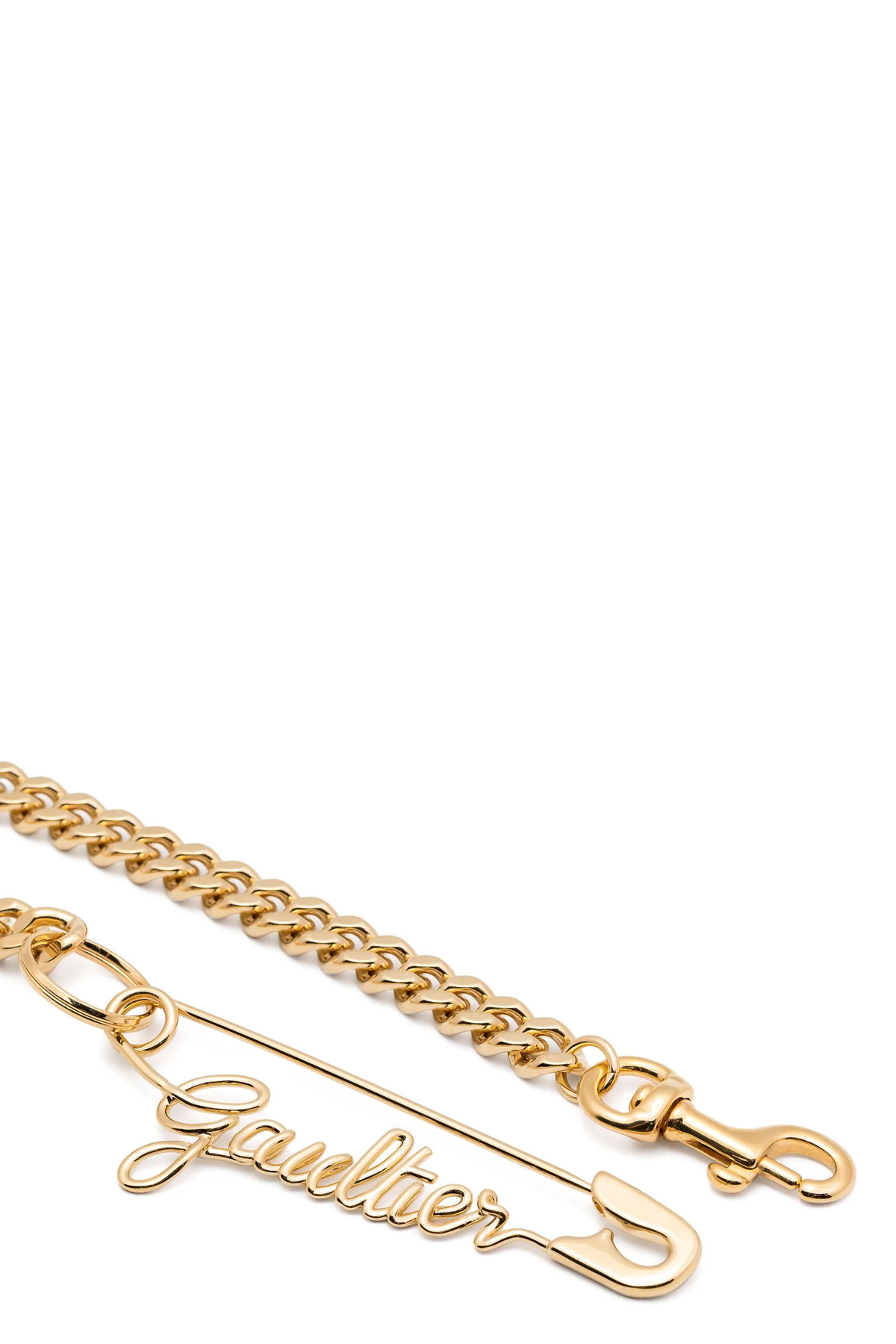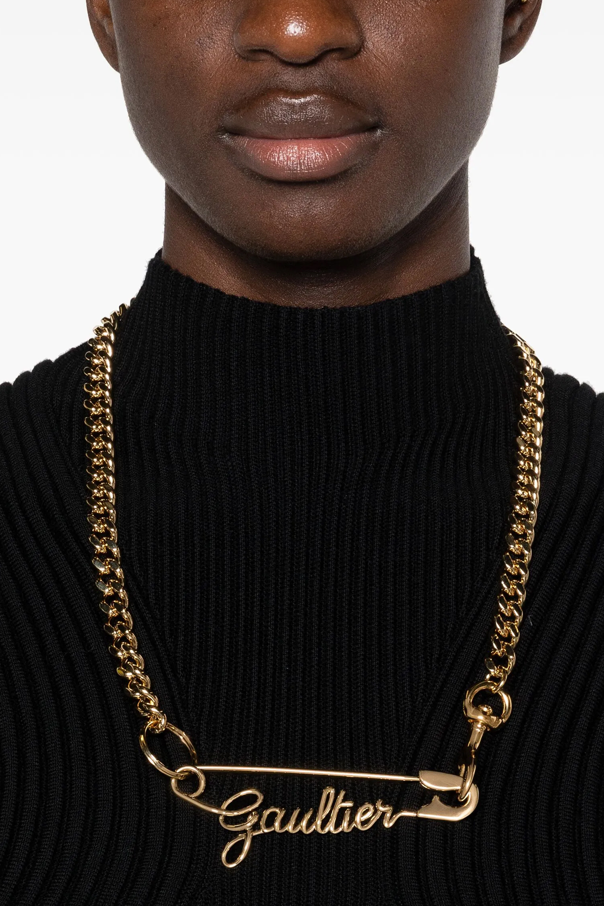 Gold metal chain necklace with front 'The Gaultier Safety Pin' and carabiner closure.