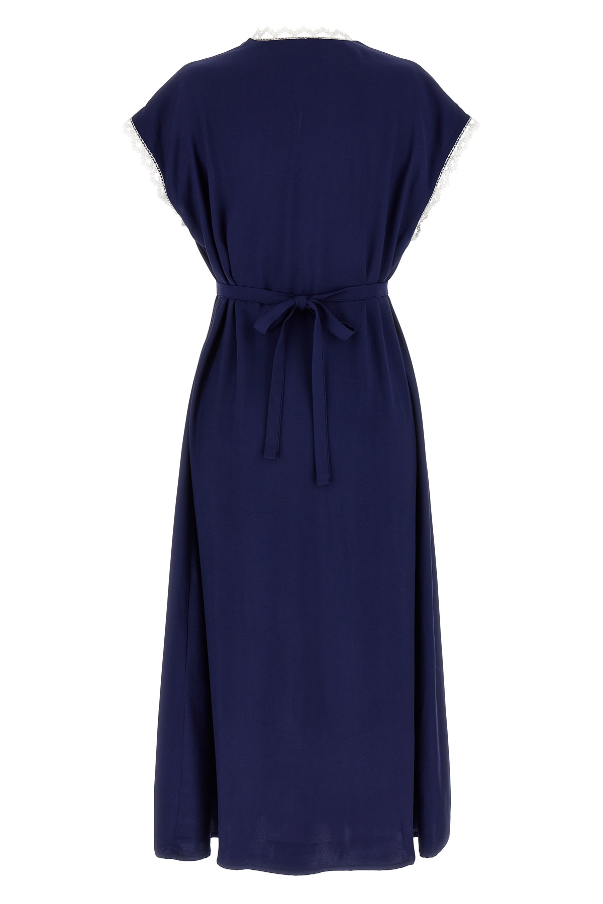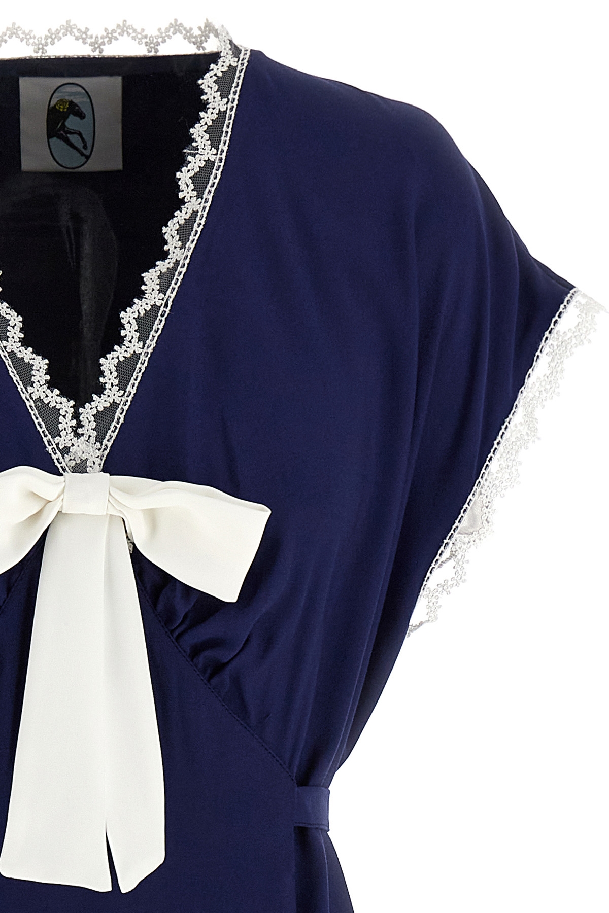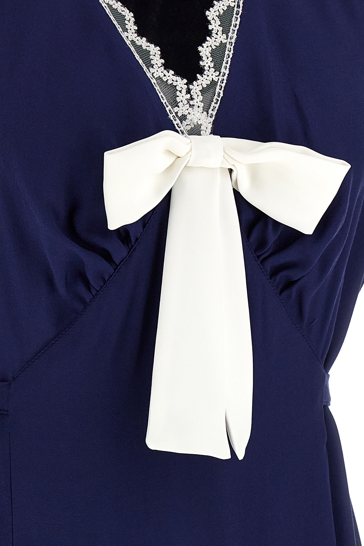 The Bow' satin midi dress made of EcoVero™ certified rayon with contrast lace details, front pincers, V-neck with bow detail, short sleeves, belt at the waist.