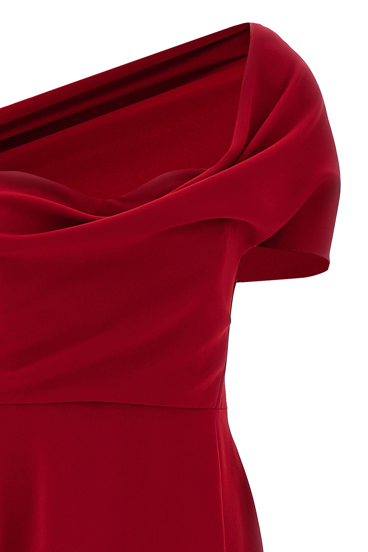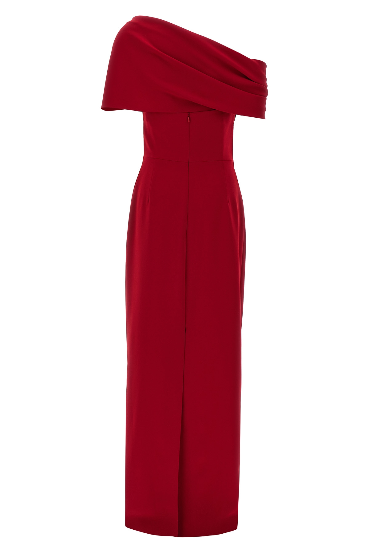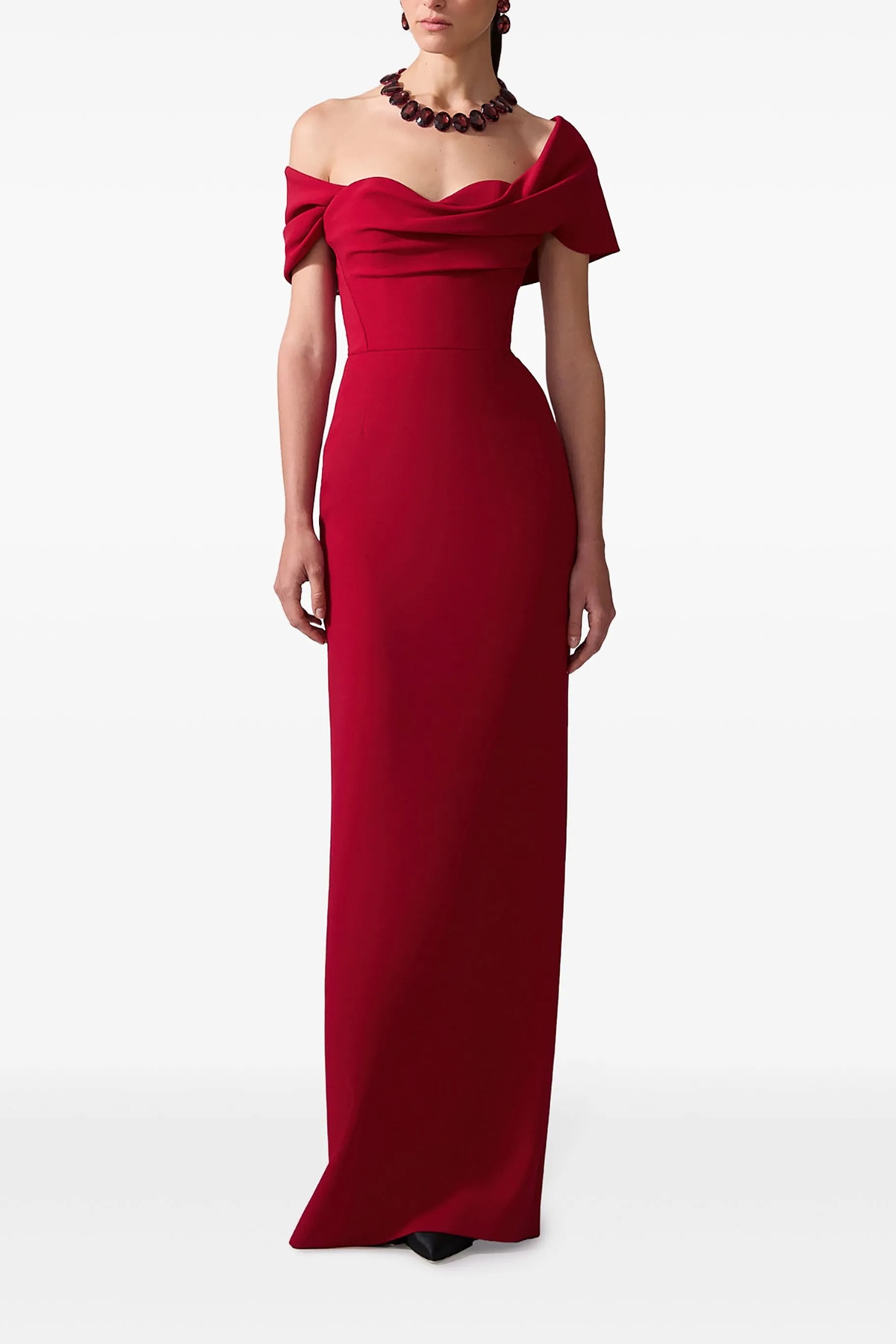 Off-the-shoulder column dress in crepe with front drapes, sweetheart neckline with bodice structured, zip closure and back split.