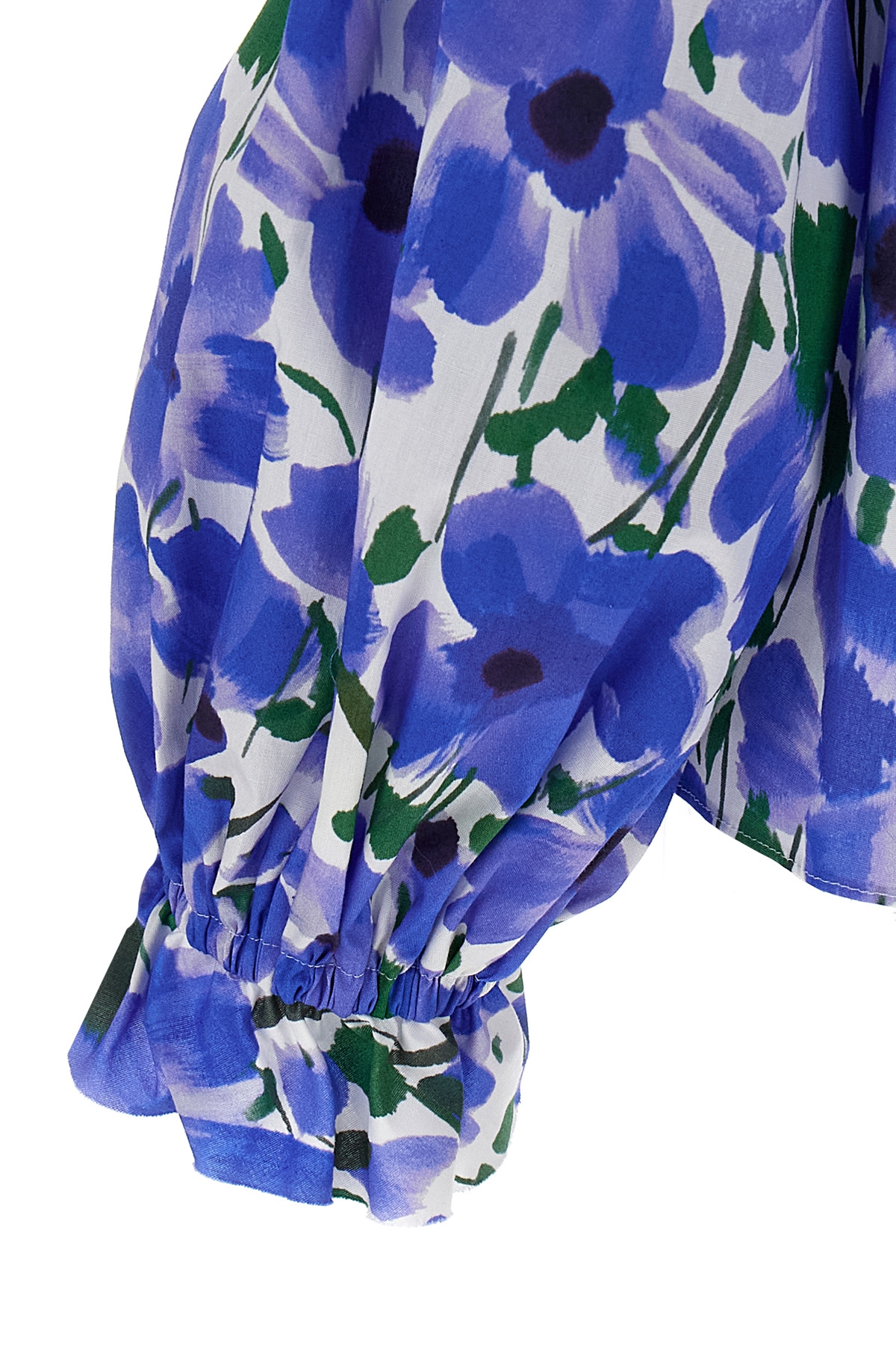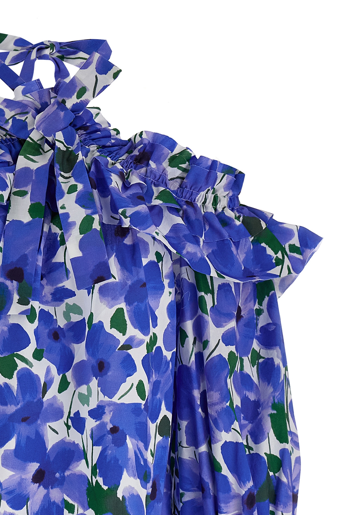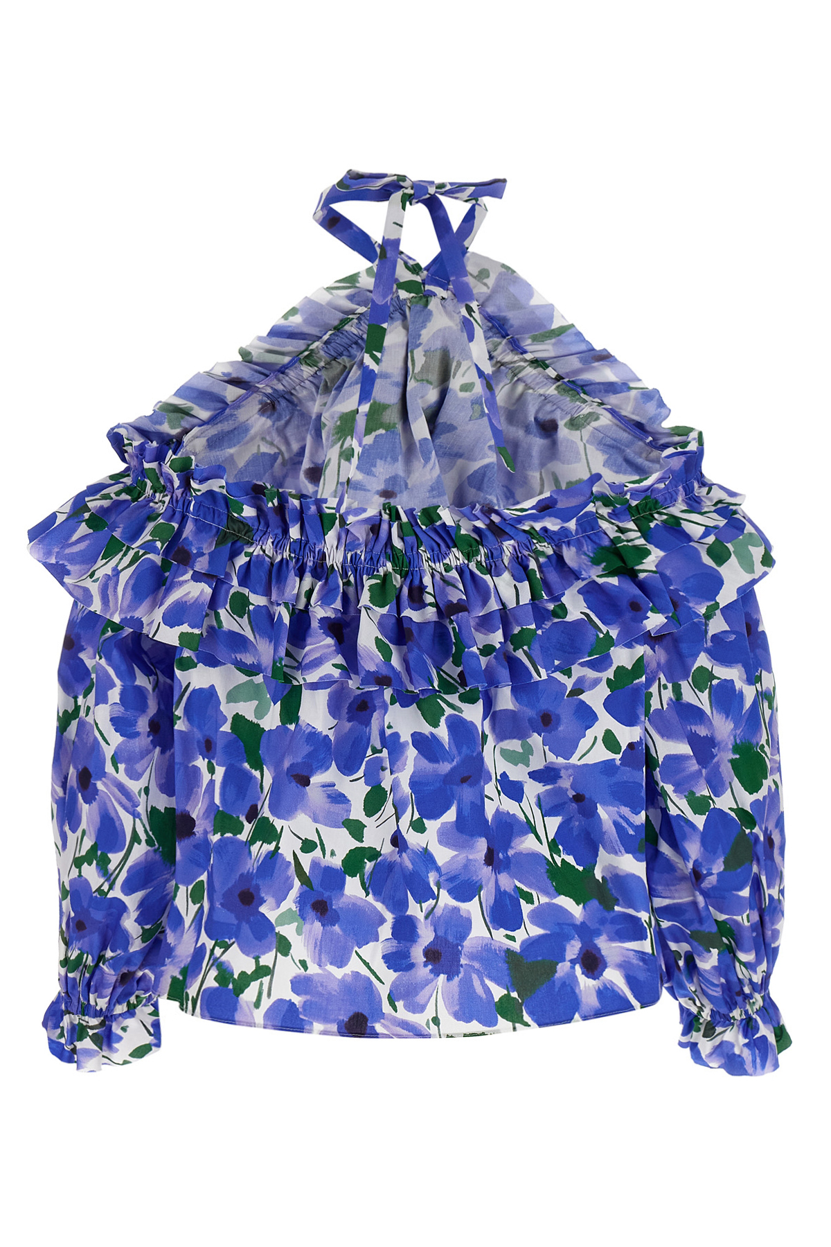 Floral-print stretch cotton top with 3D ruffle details, off-the-shoulder style with tied neck, stretch halterneck, long sleeves with elastic cuffs.