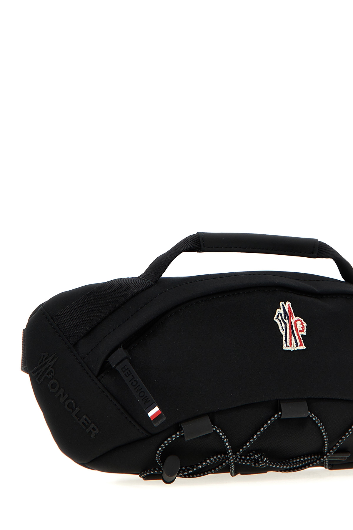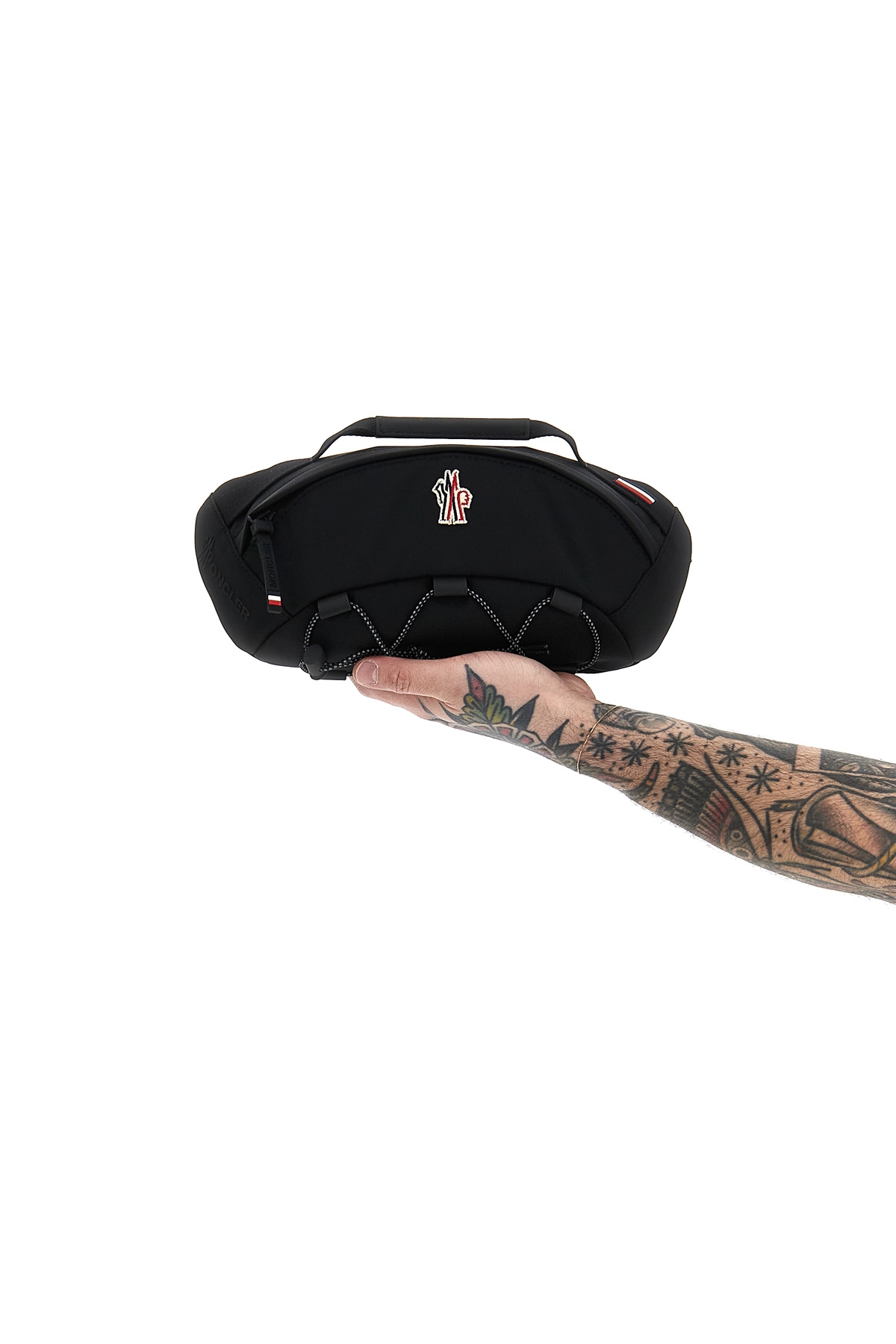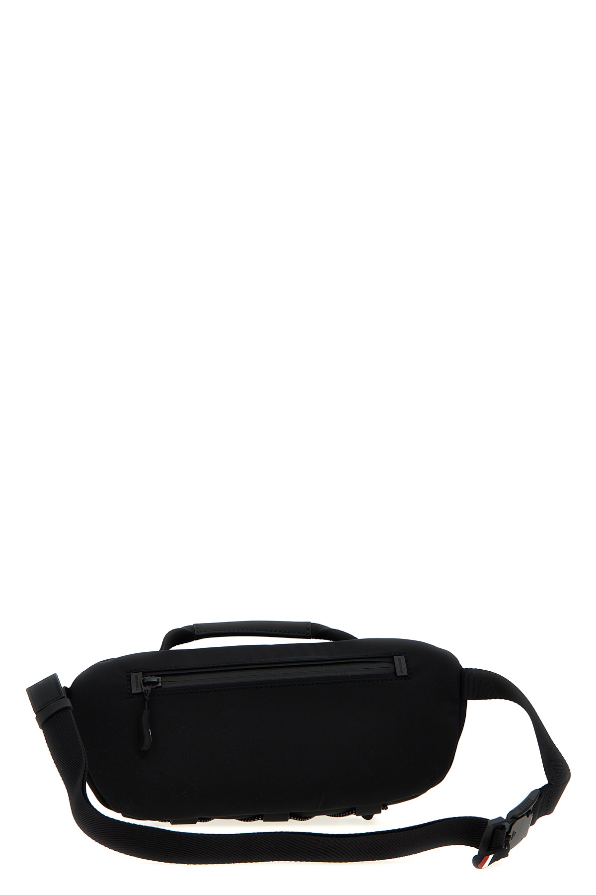 'Belt Bag' waist bag in water-repellent technical stretch nylon with water-repellent nylon lining, rubberized calf leather details, front logo patch, fixed handle, zip closure, pocket, adjustable shoulder strap with magnetic buckle.