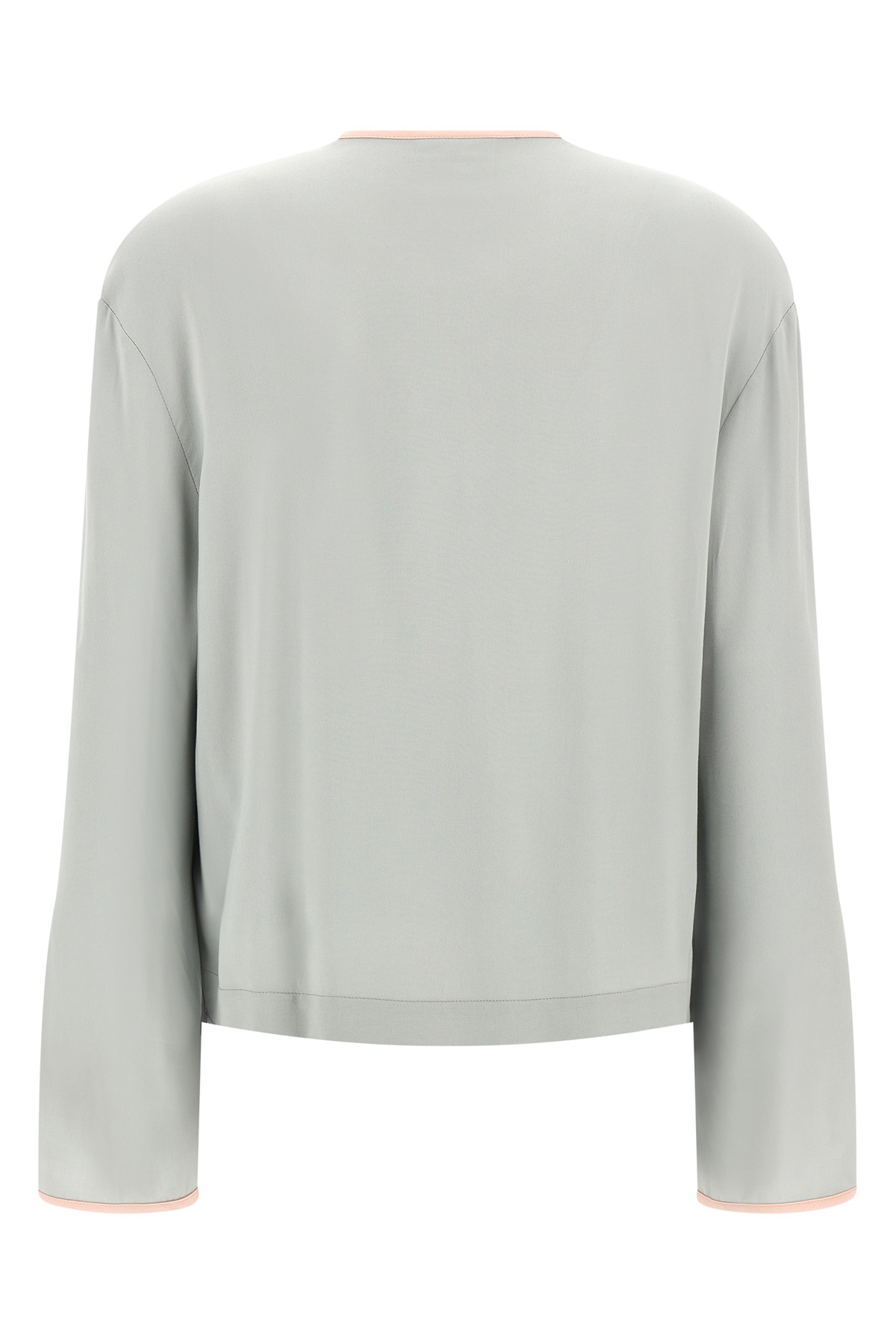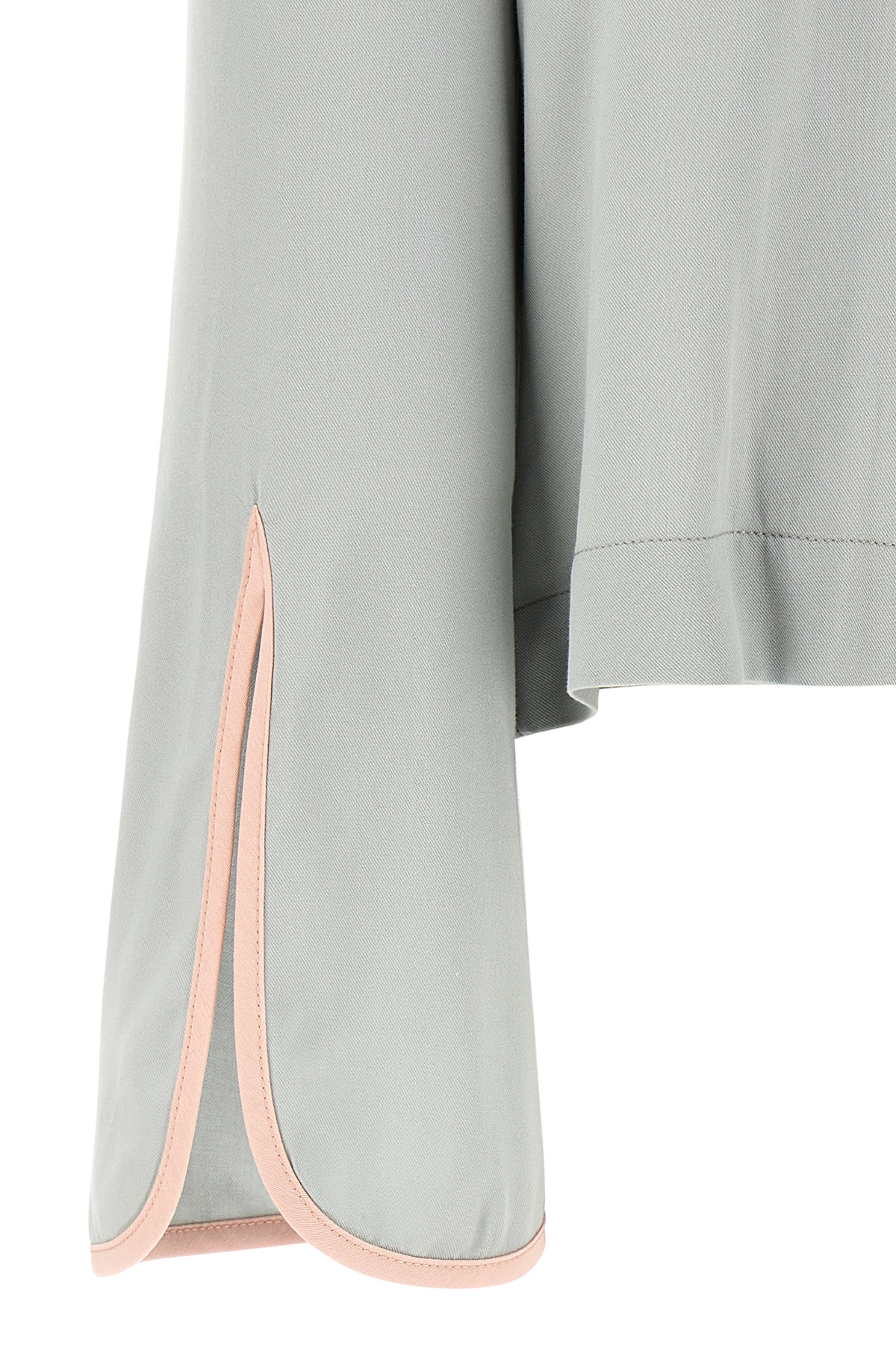'Louis Pajama' outfit, trousers with elastic waistband and slit on the hem, blouse with V-neck and hand-embroidered tow closure, long sleeves with split and contrast piping.
