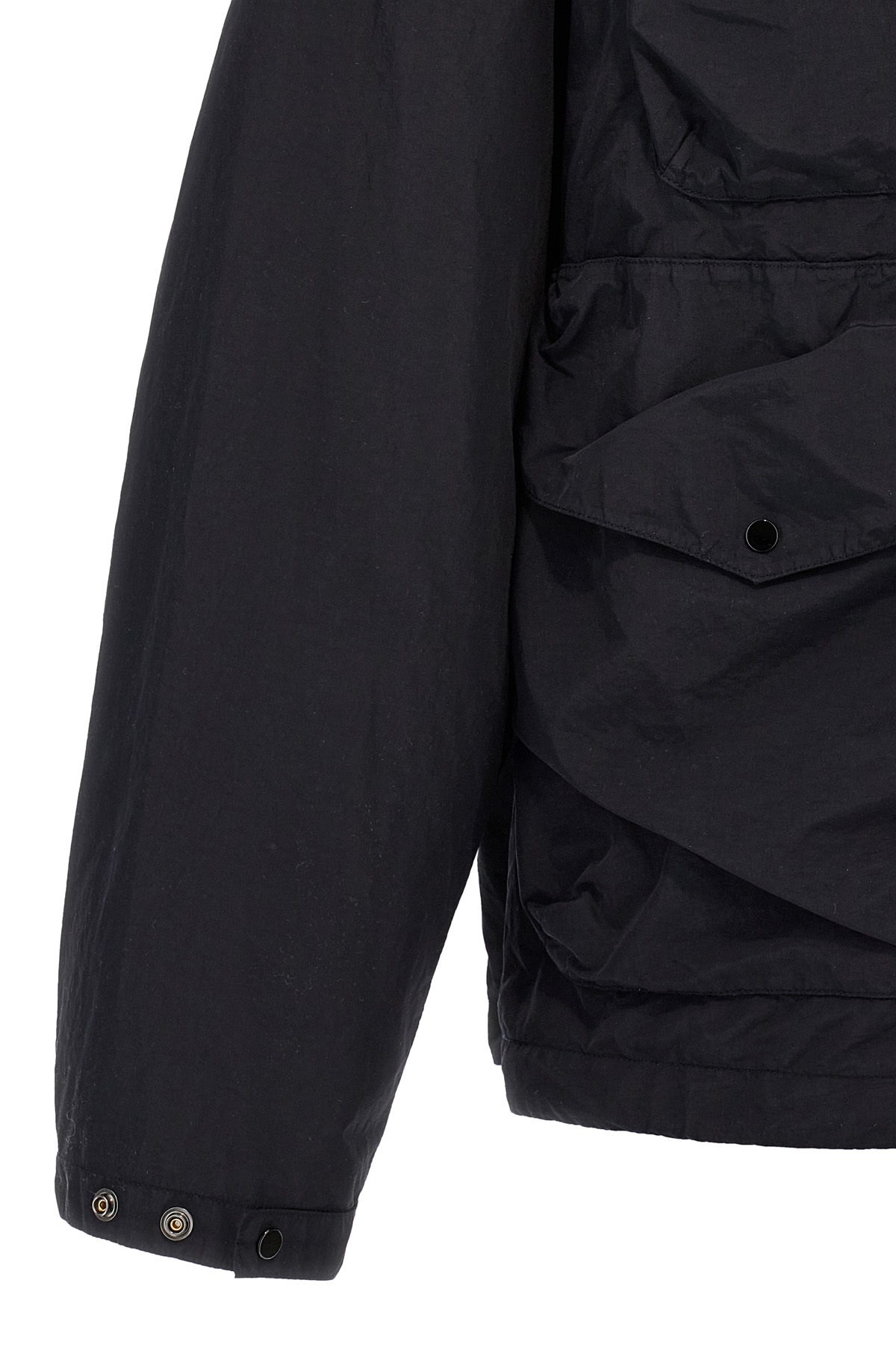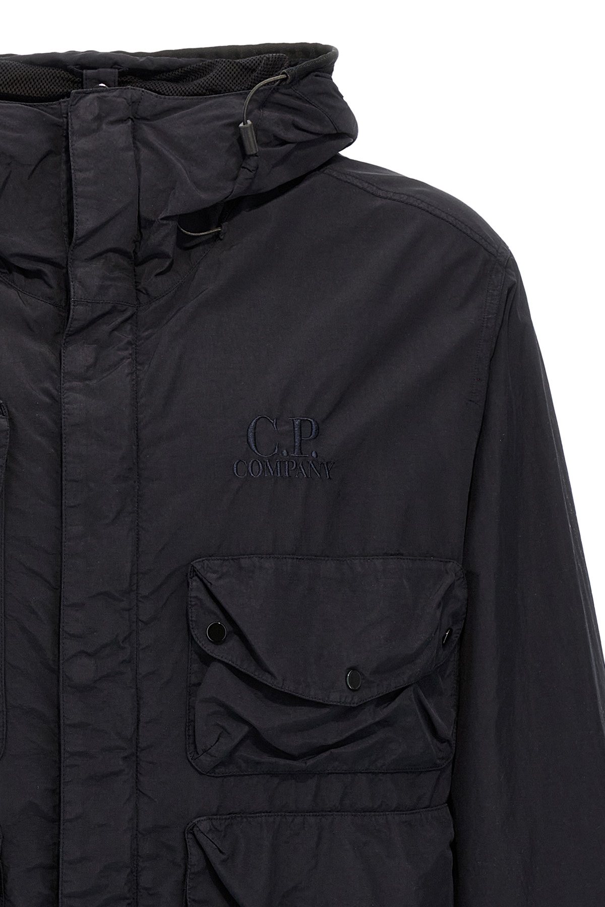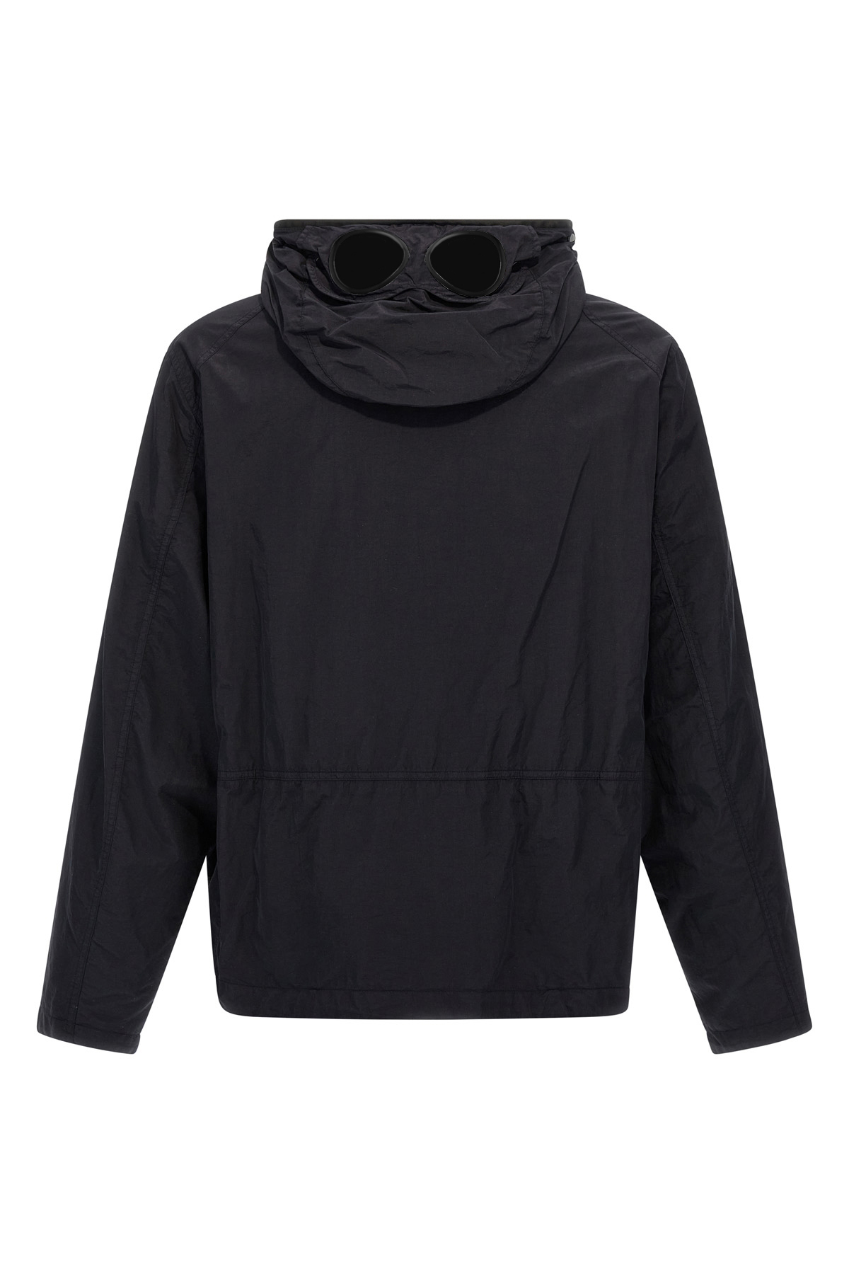 'Flatt Nylon Goggle' jacket in frosted matte nylon with back glossy resin, garment-dyed anti-drip treatment, tone-on-tone logo embroidery on the front, hood with adjustable Goggle, zip and snap button closure, pockets, long sleeves with adjustable cuffs.