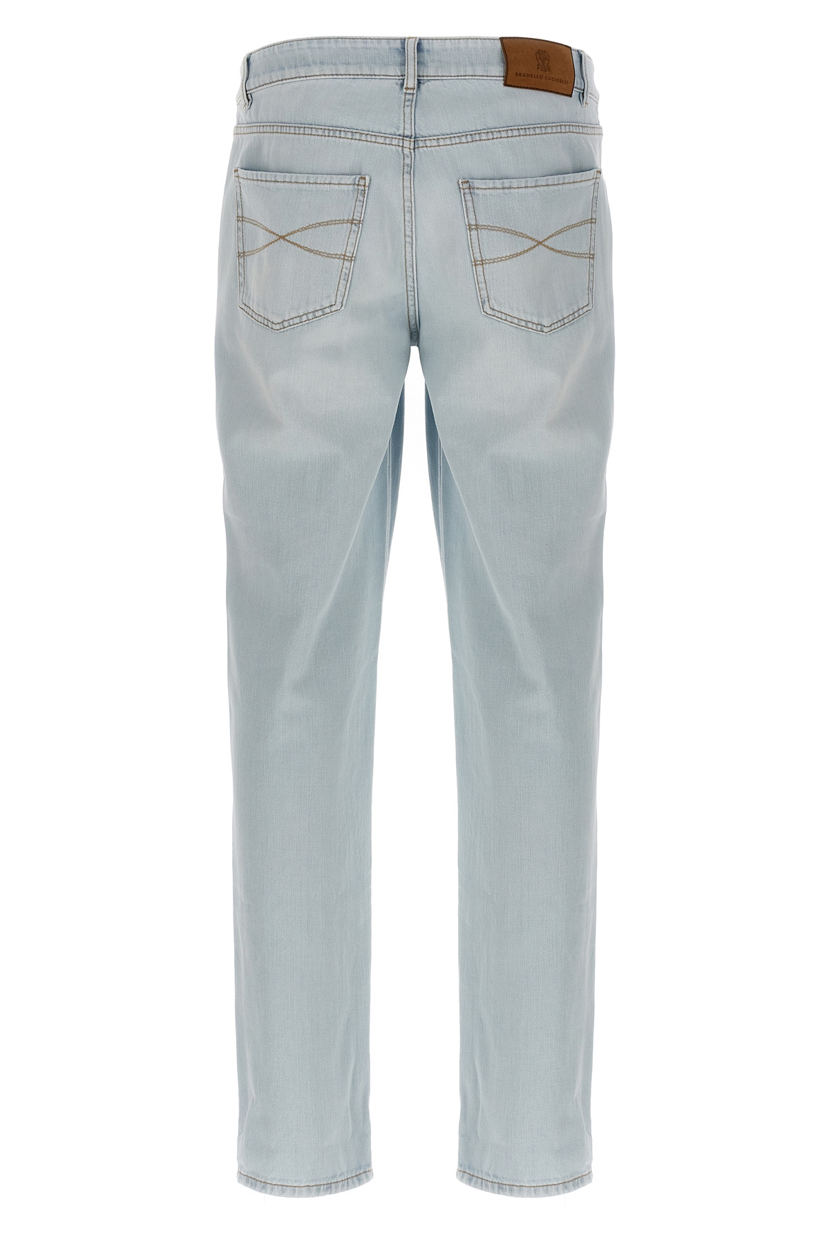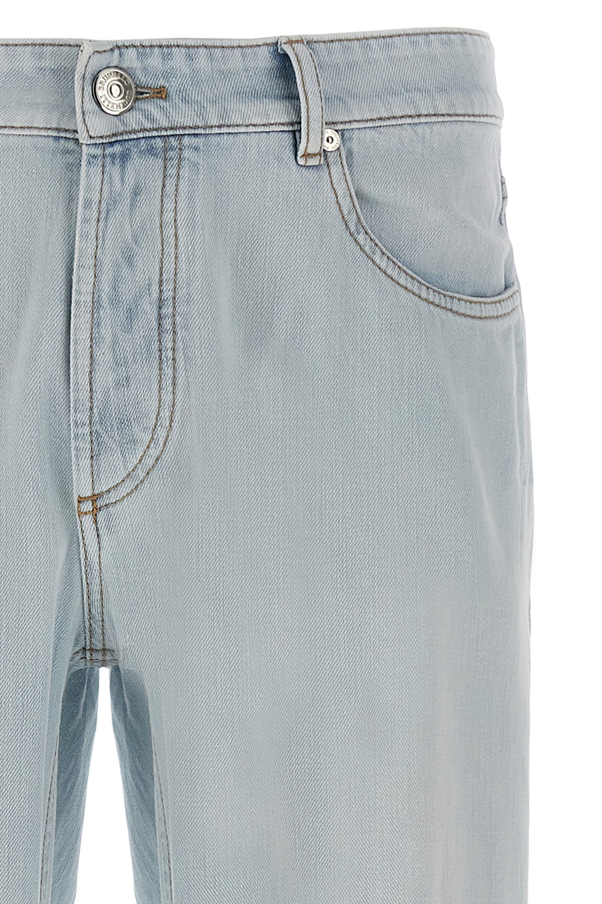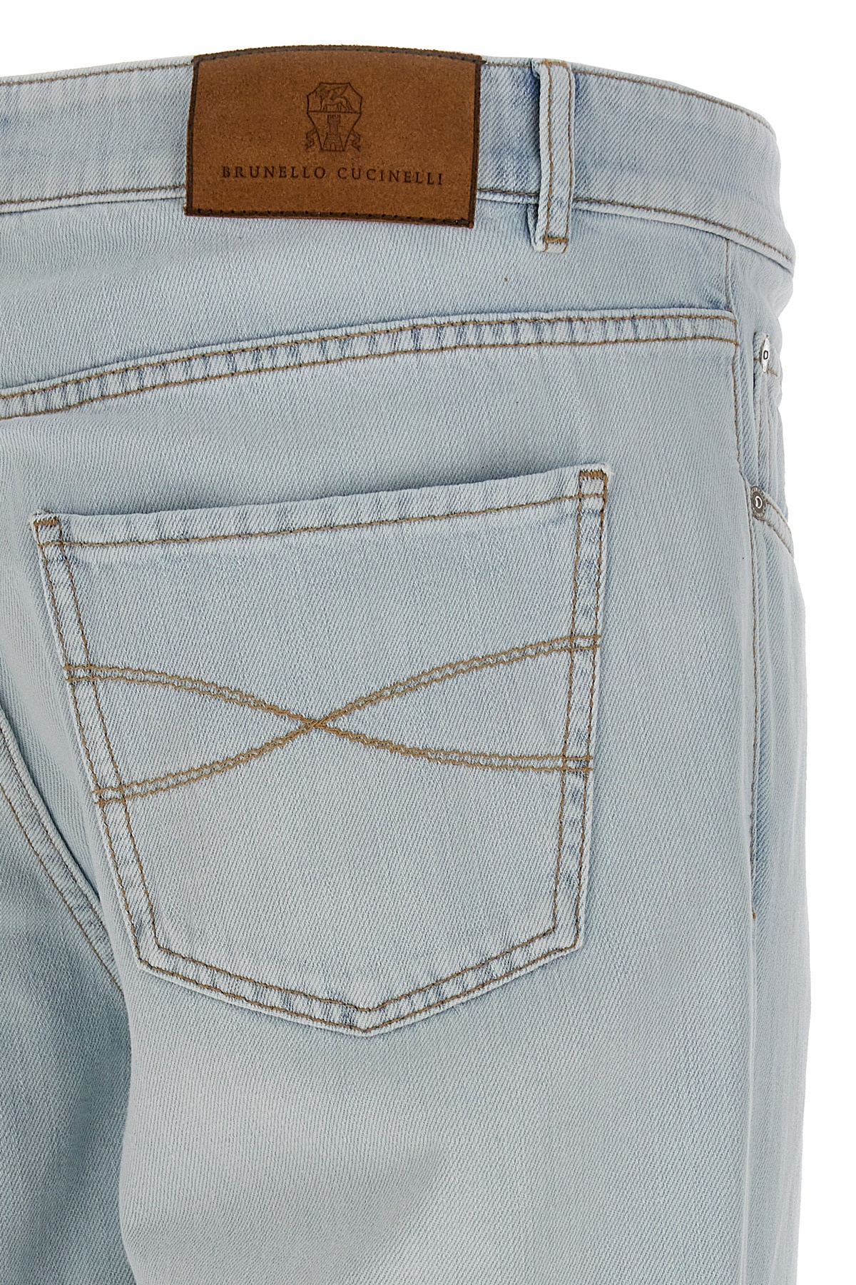 Cotton denim jeans with front logo embroidery, button closure, five pockets, straight leg, back leather logo tag, turn-up hem.