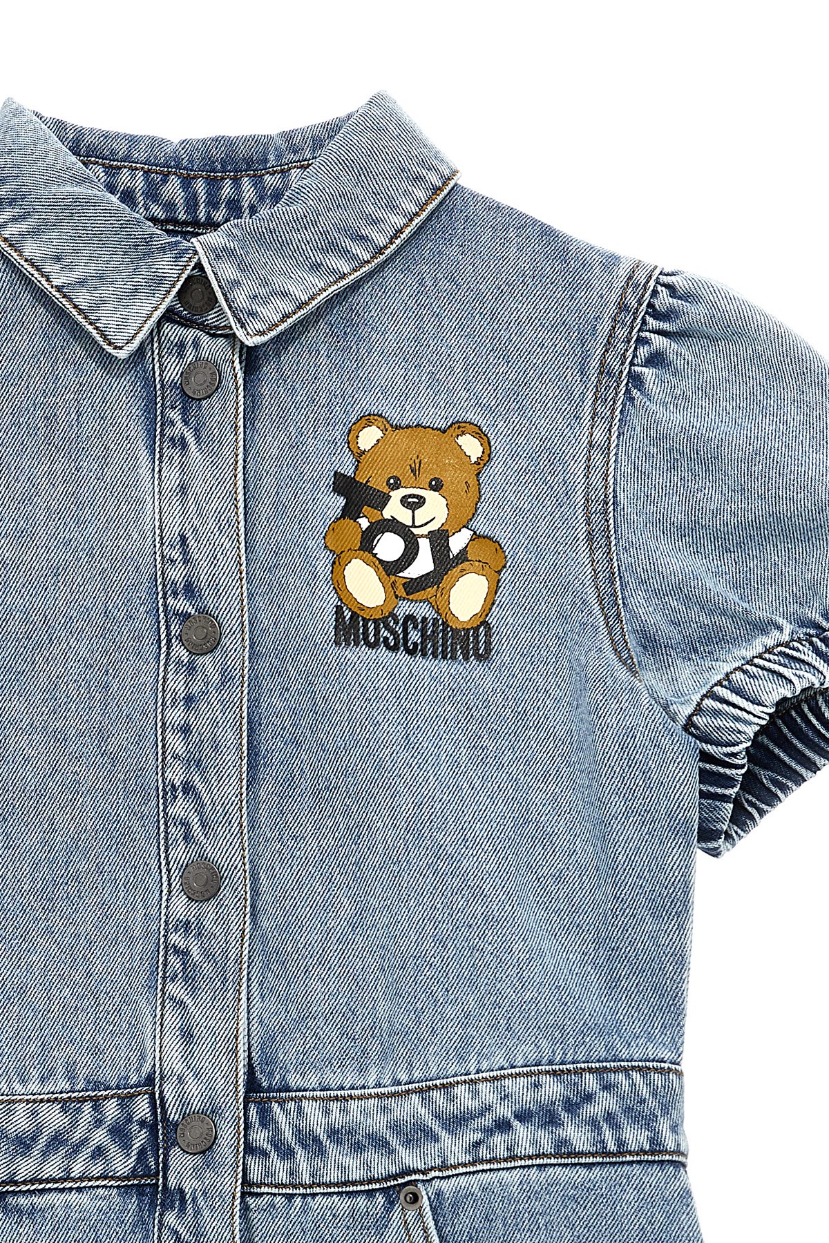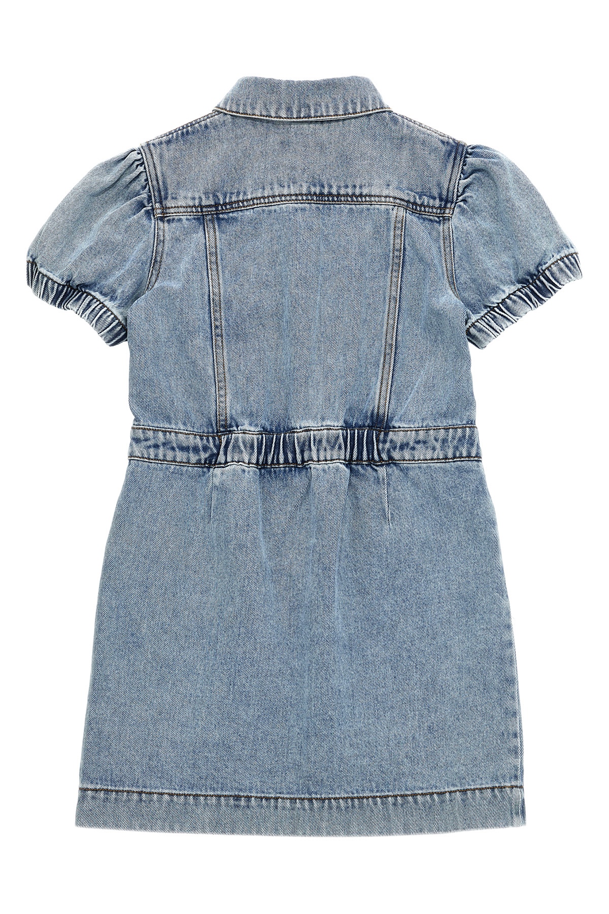 KIDS Cotton denim dress with front 'Teddy' print, snap button closure, short sleeves with elastic cuffs, pockets.